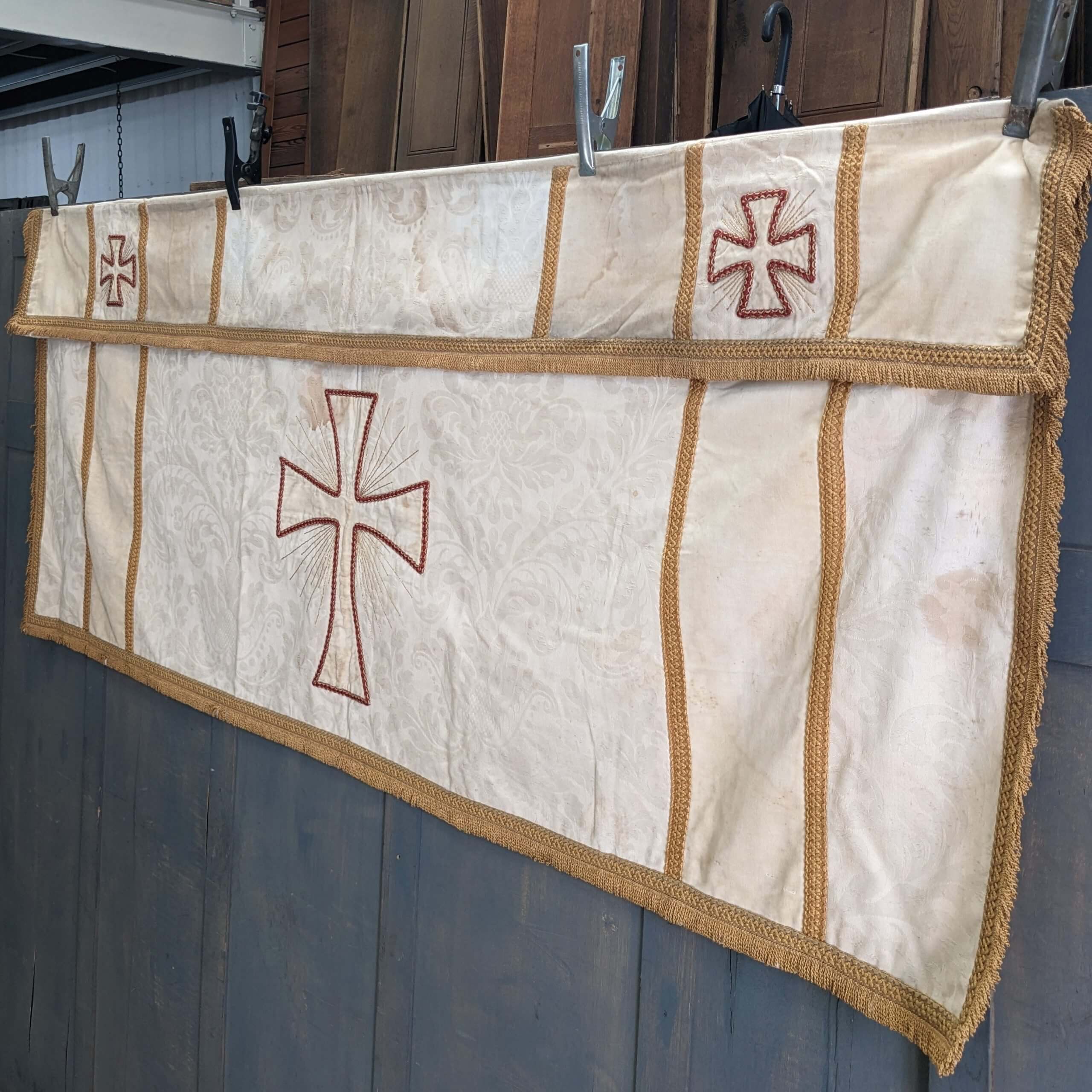 Our product shown on this page Large Waterstained Cream & Gold Altar Frontal with Three Crosses (SOLD) is currently available for hire.