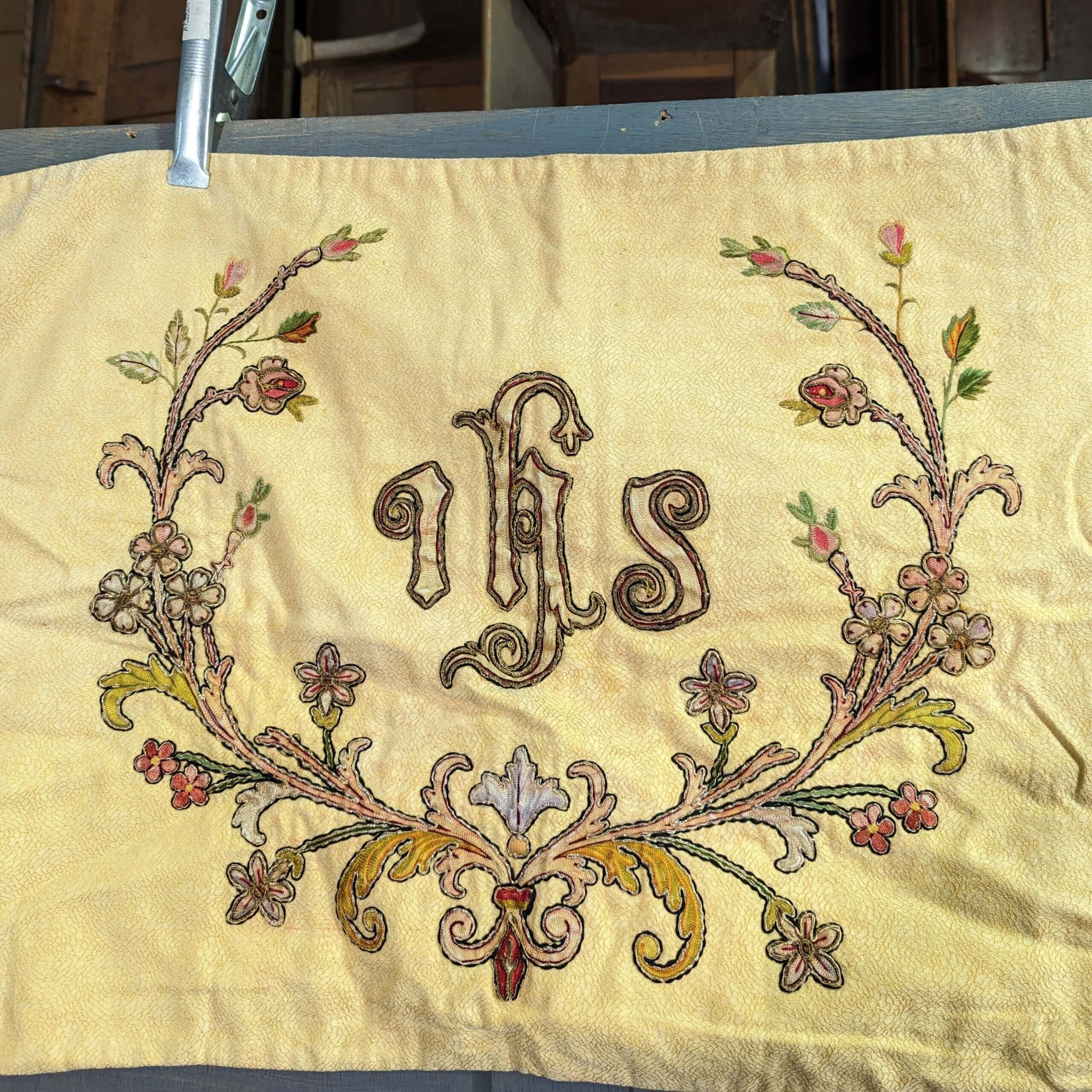 Our product shown on this page Long Vintage Embroidered ‘IHS’ Humeral Veil with Red/Gold Fringing (SOLD) is currently available for hire.