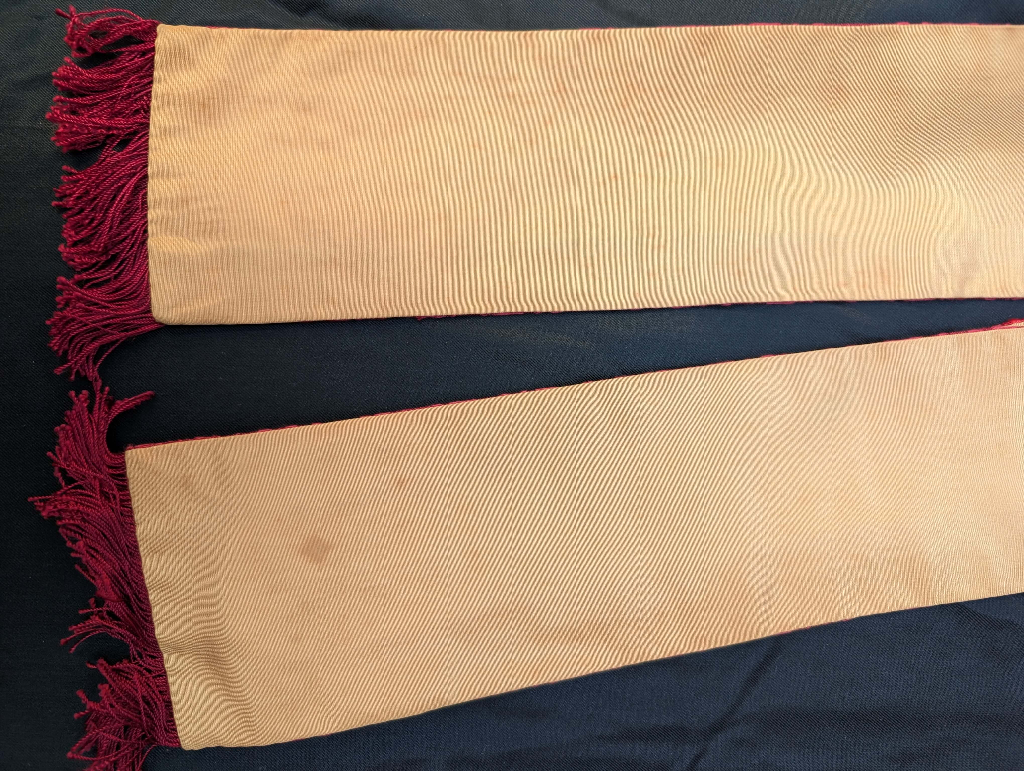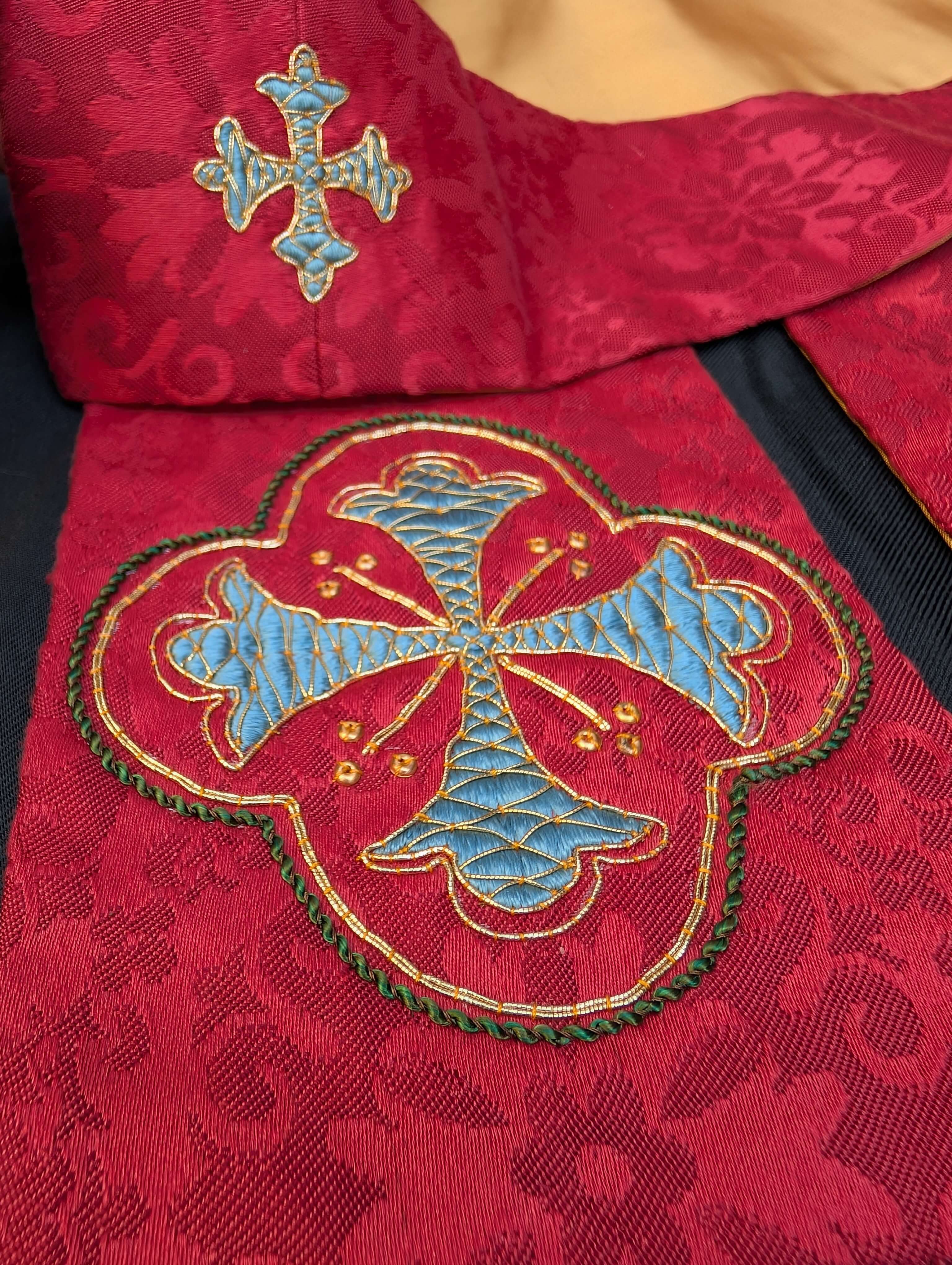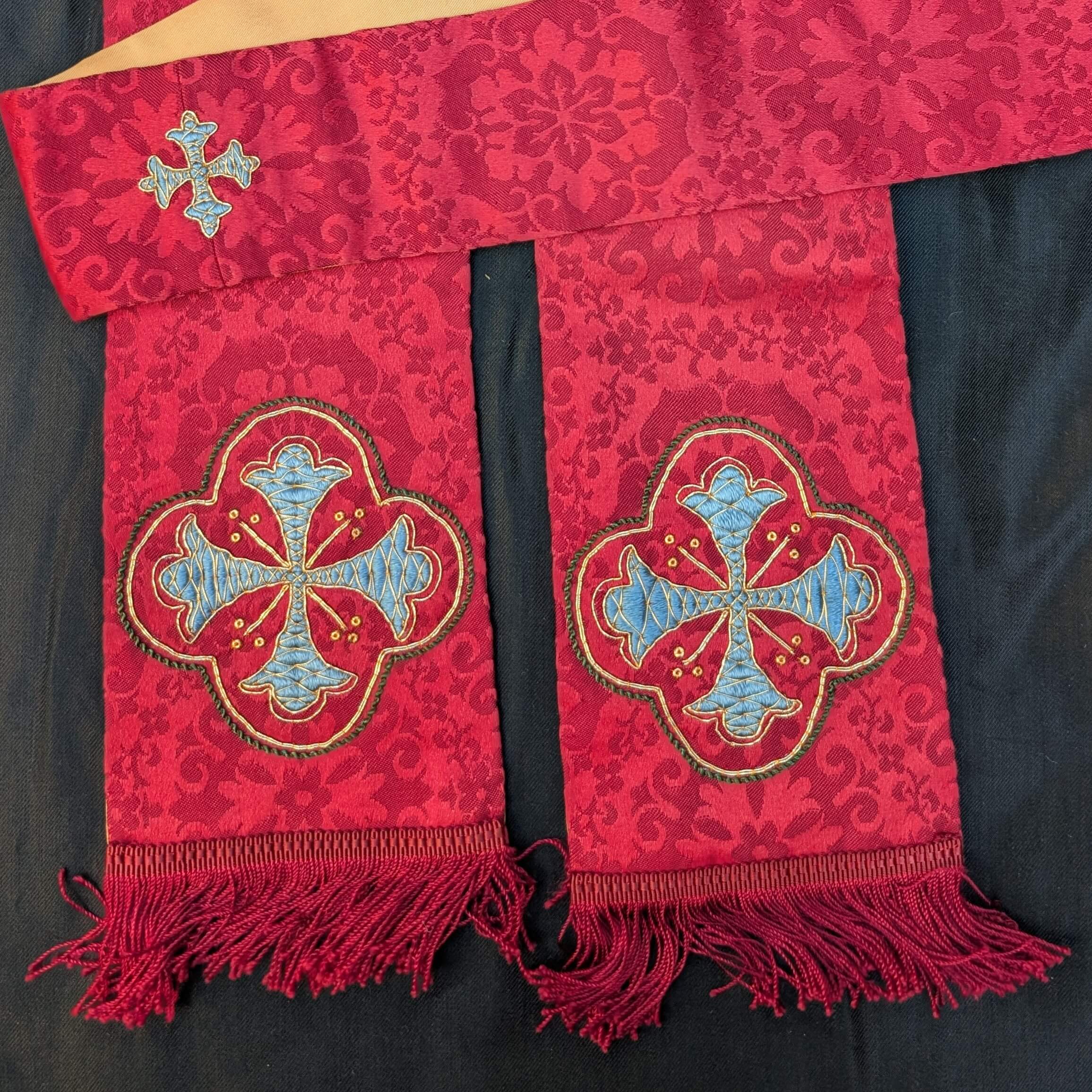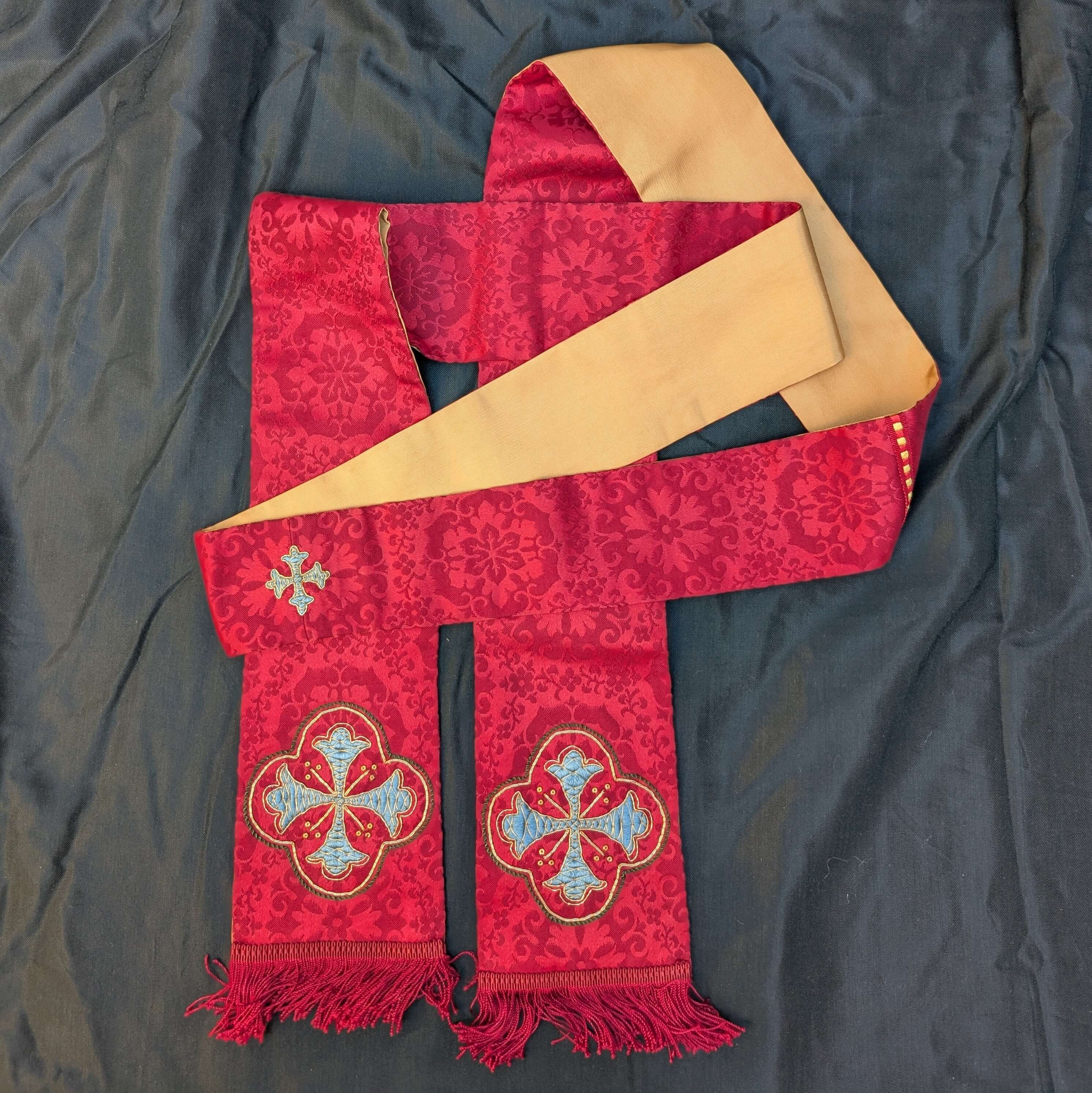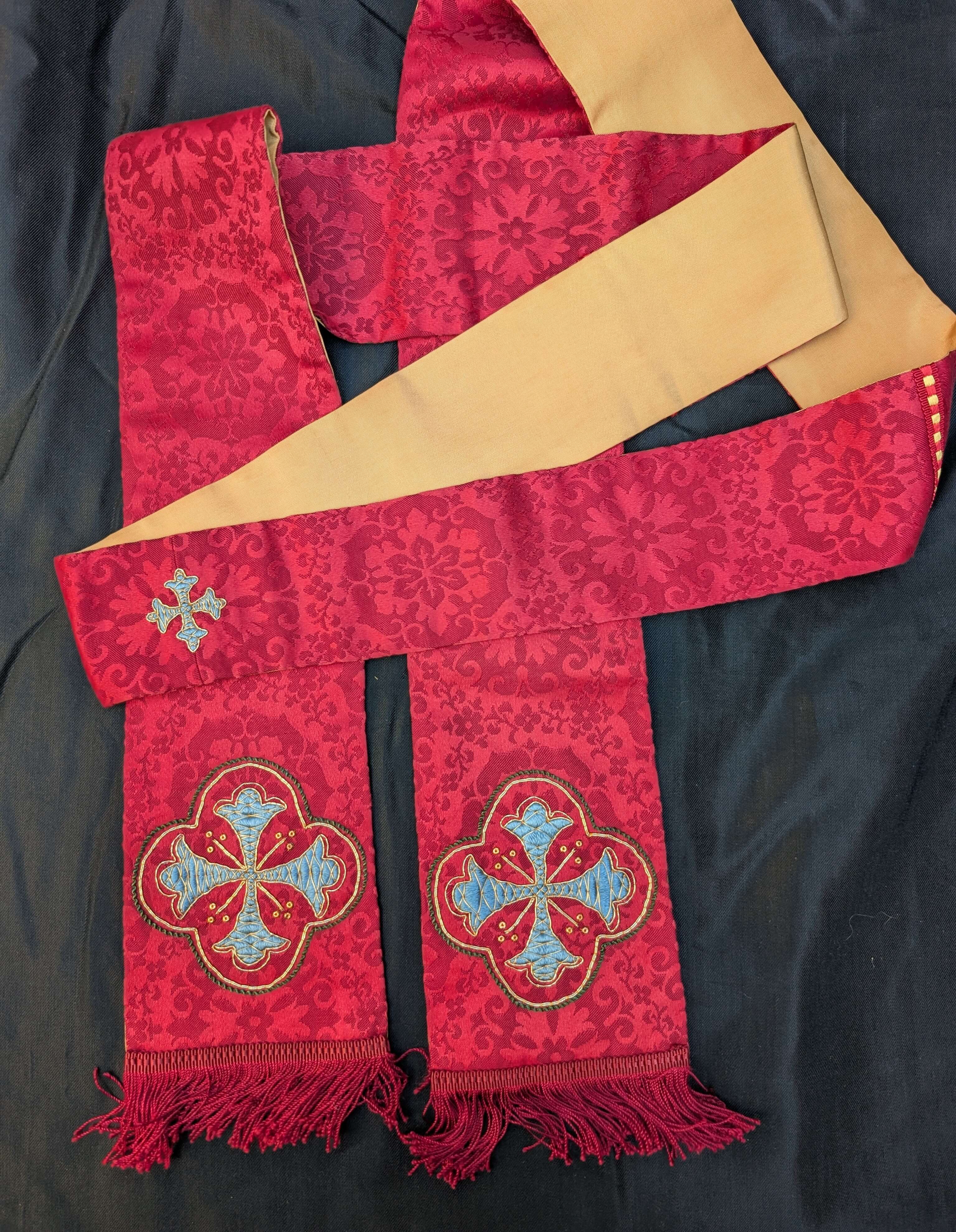 Our product shown on this page Lovely Embroidered Vintage Red Damask Stole with Blue Crosses (SOLD) is currently available for hire.
