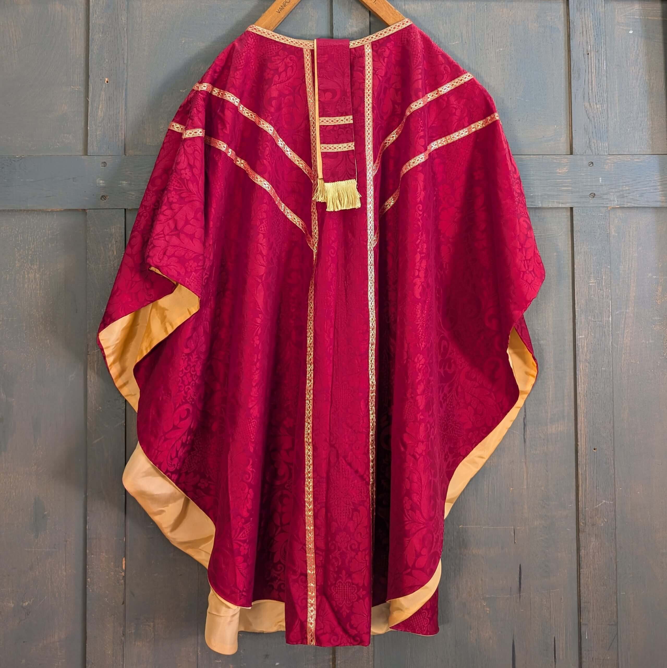 Our product shown on this page Lovely Red Silk Damask Chasuble with Gold Orphreys Maniple Burse & Stole (SOLD) is currently available for hire.