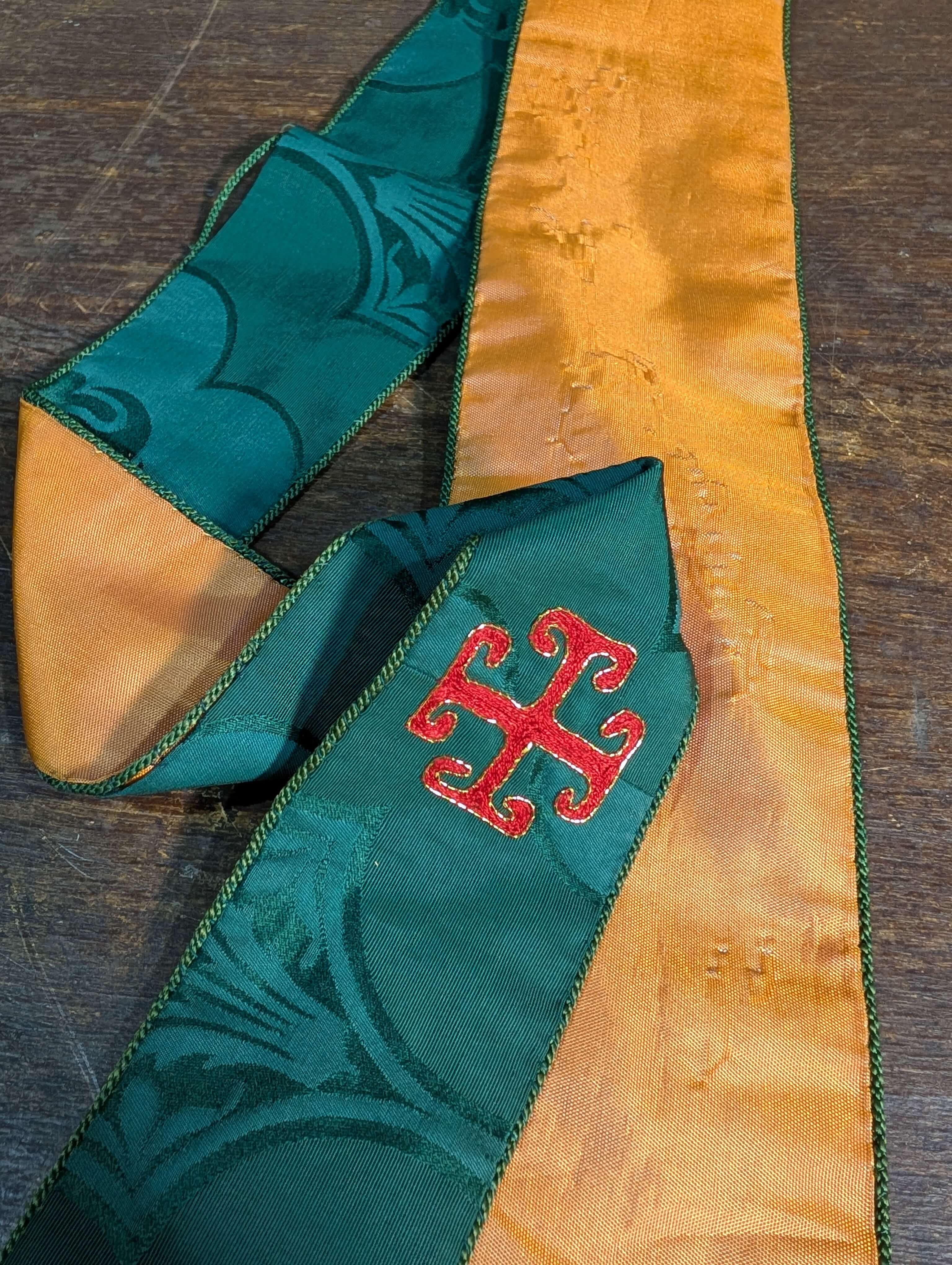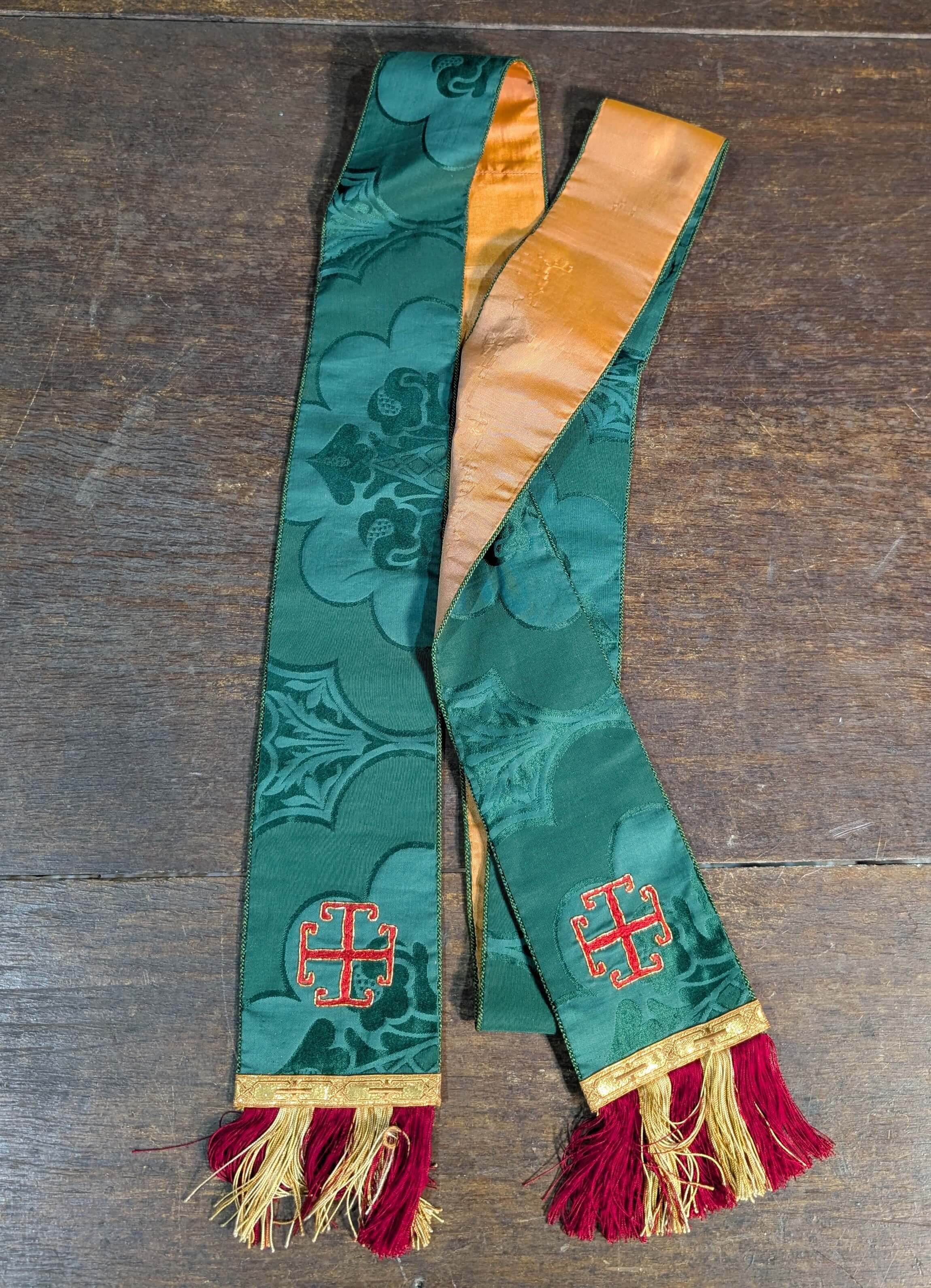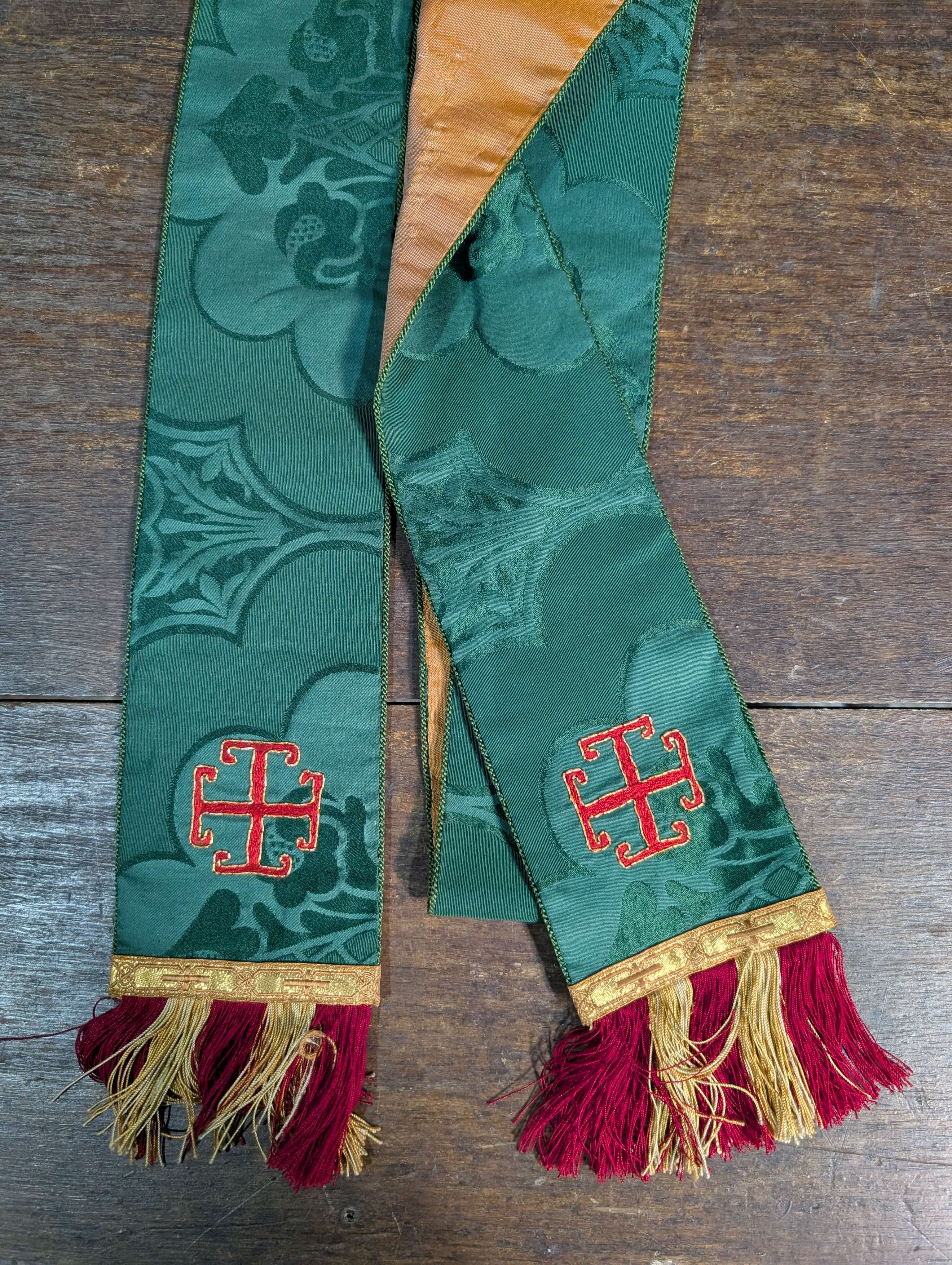 Our product shown on this page Lovely Vintage Green Silk Damask Stole with Gold Red Clercee Cross (SOLD) is currently available for hire.