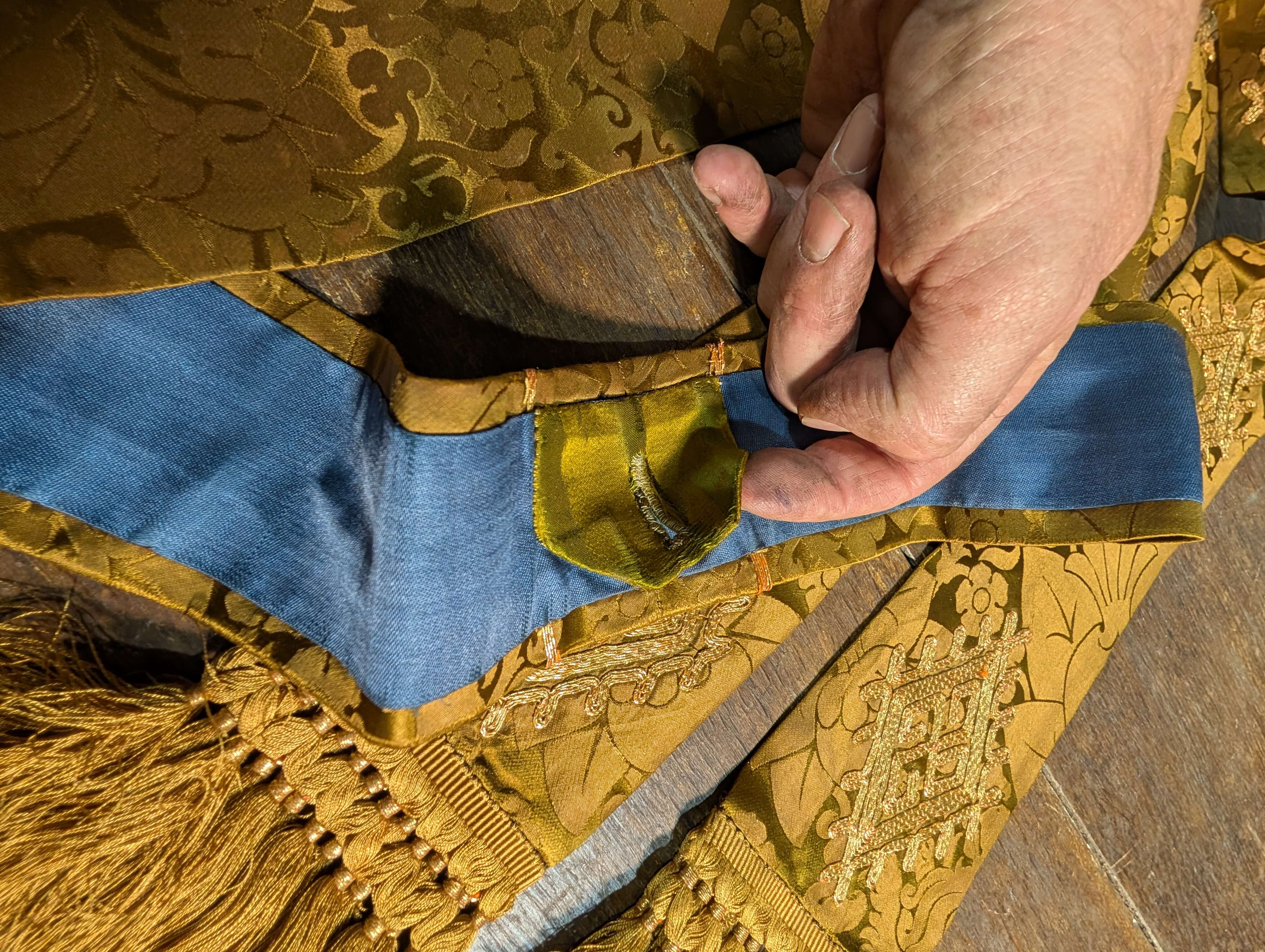 Our product shown on this page Lush Olive Damask Silk Stole with Gold Designs & Fringing is currently available for hire.