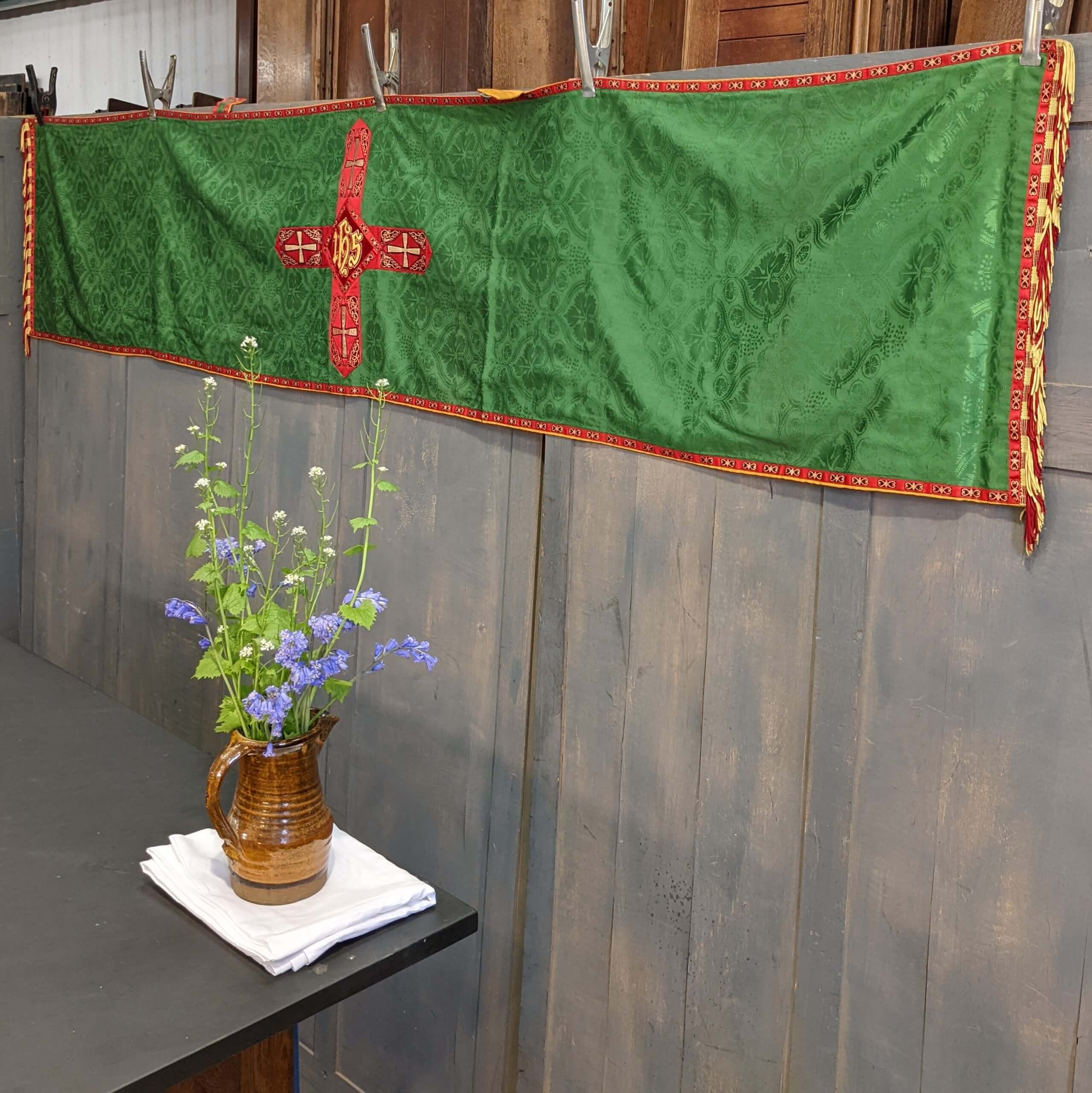 Our product shown on this page Lustrous Vintage Green Damask Tasseled Humeral Veil (SOLD) is currently available for hire.