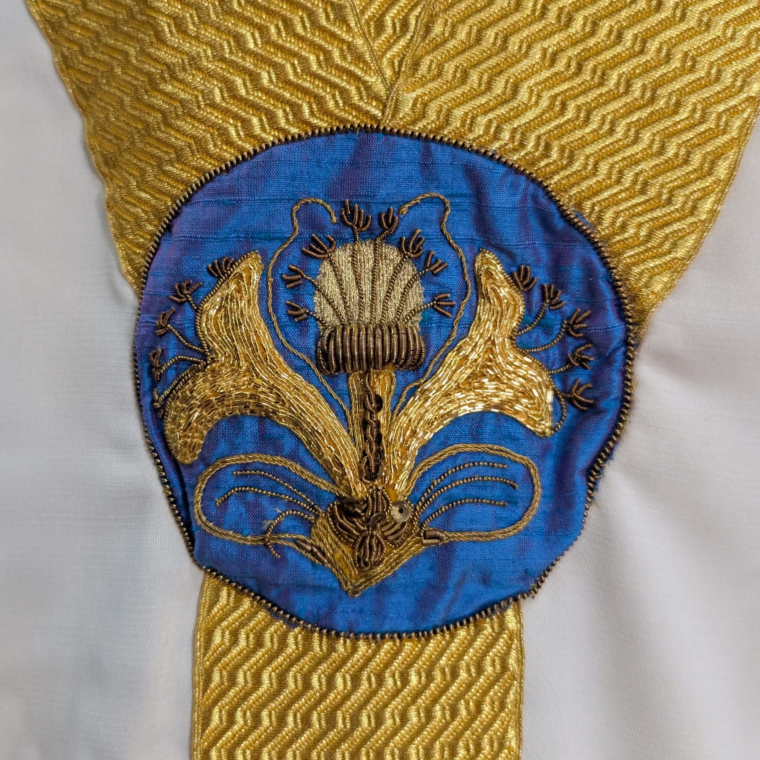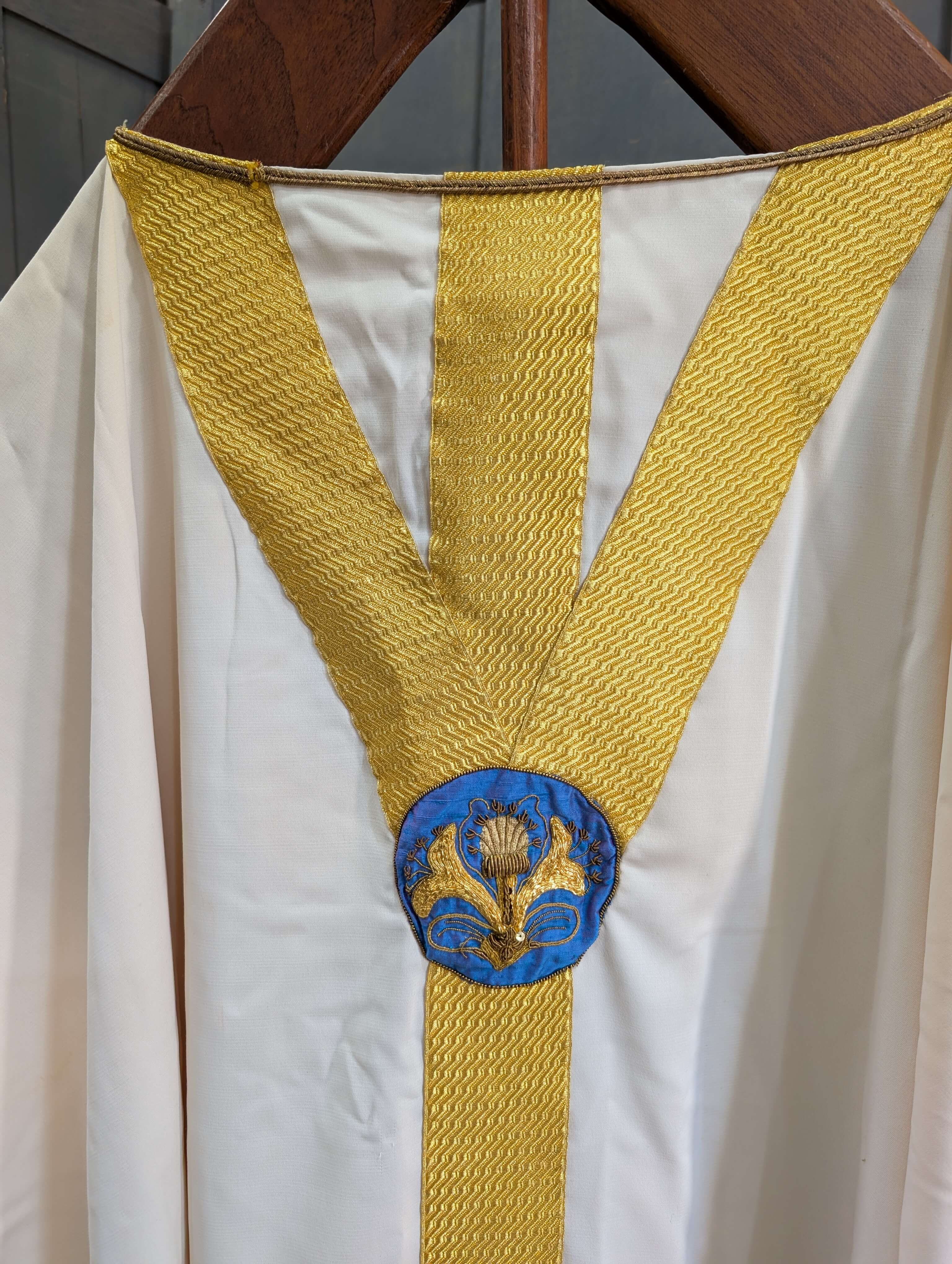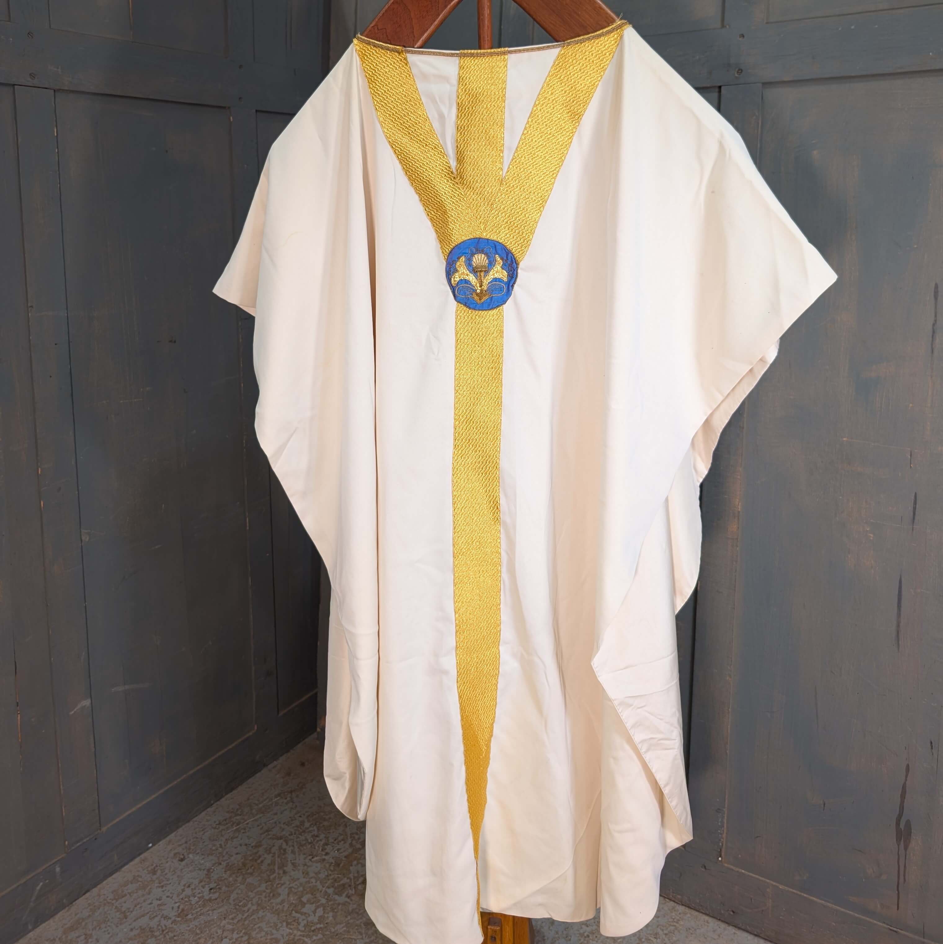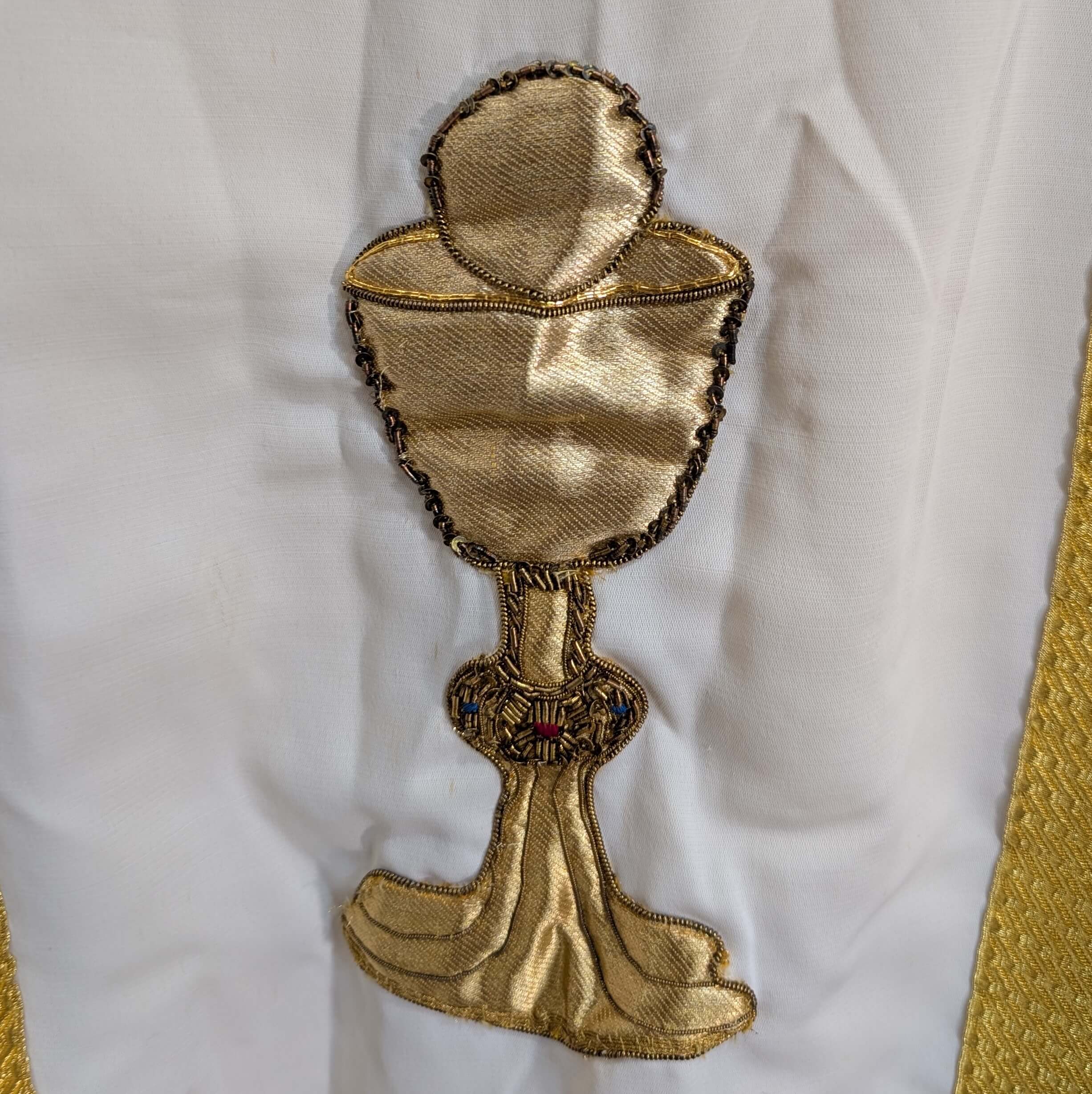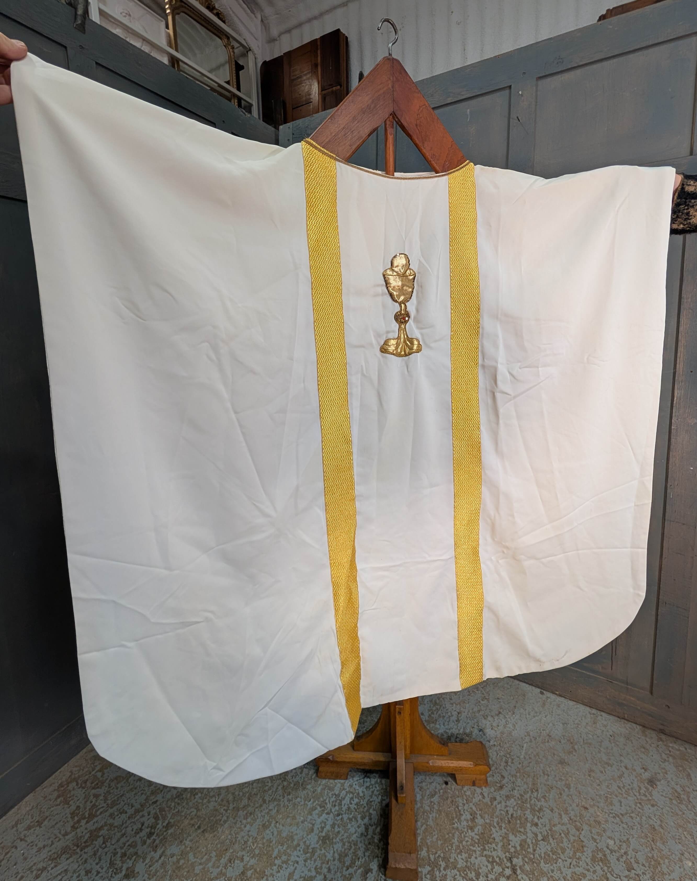 Our product shown on this page Modern 1980’s Buttermilk Chasuble with Gold Orphreys Chalice & Lilies is currently available for hire.