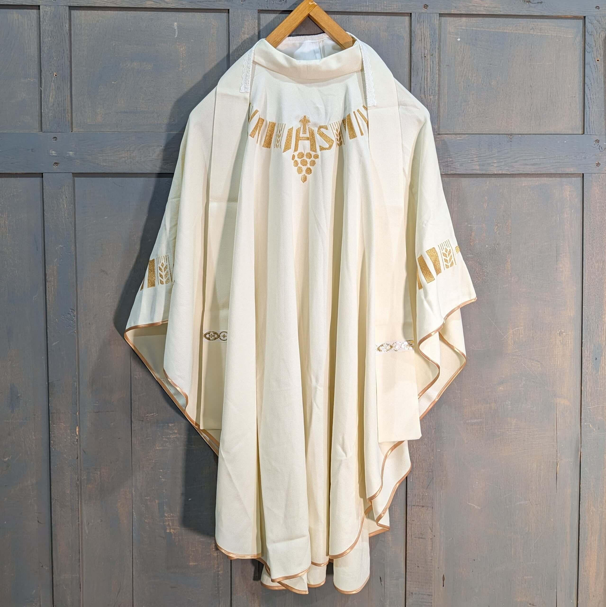 Our product shown on this page Modern Hayes and Finch Cream and Gold Chasuble with IHS Cross and Wheat Designs (SOLD) is currently available for hire.