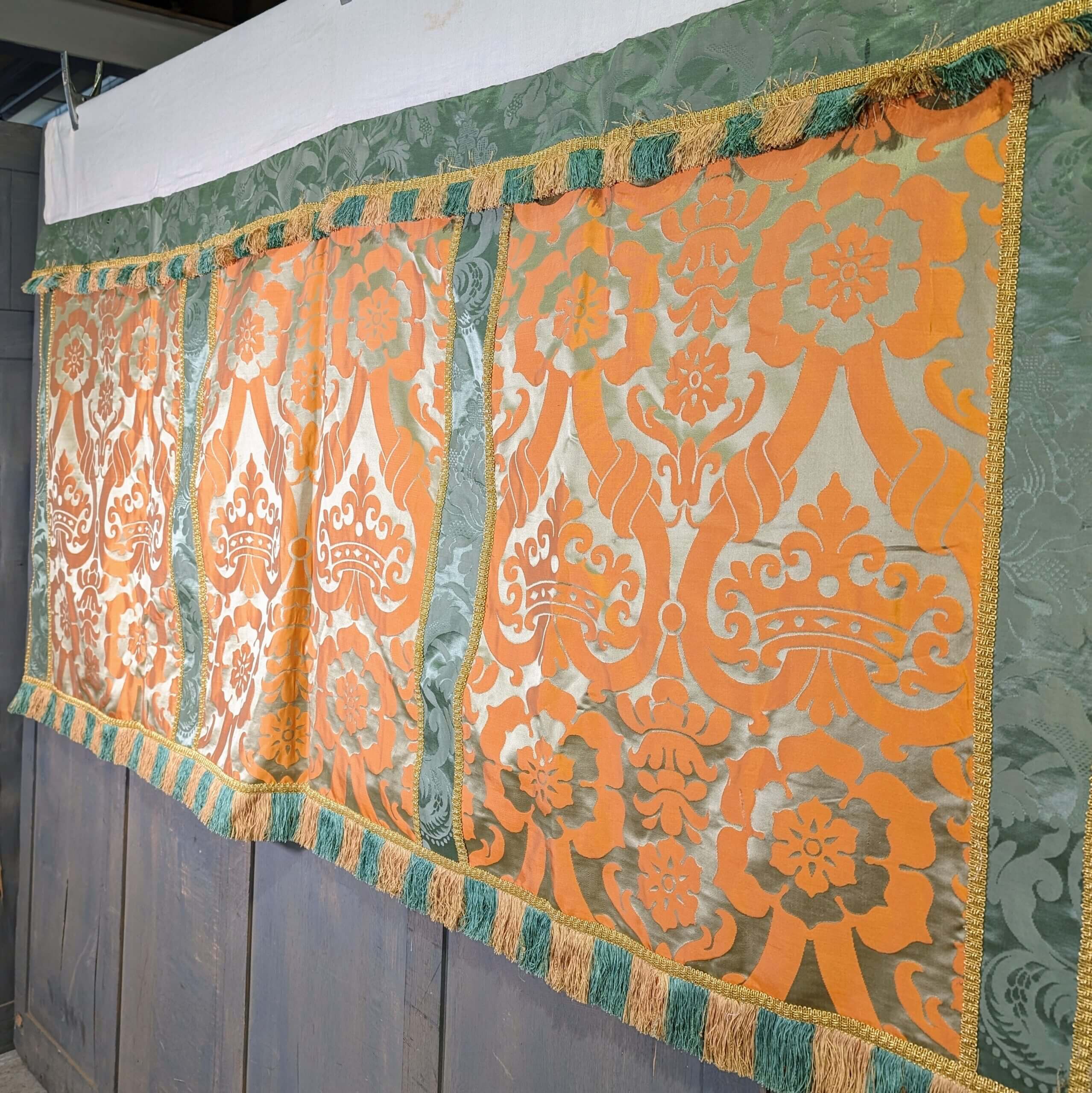 Opulent & Striking Vintage Large Altar Cloth in Bold Orange Gold & Green Damask Silk (SOLD)