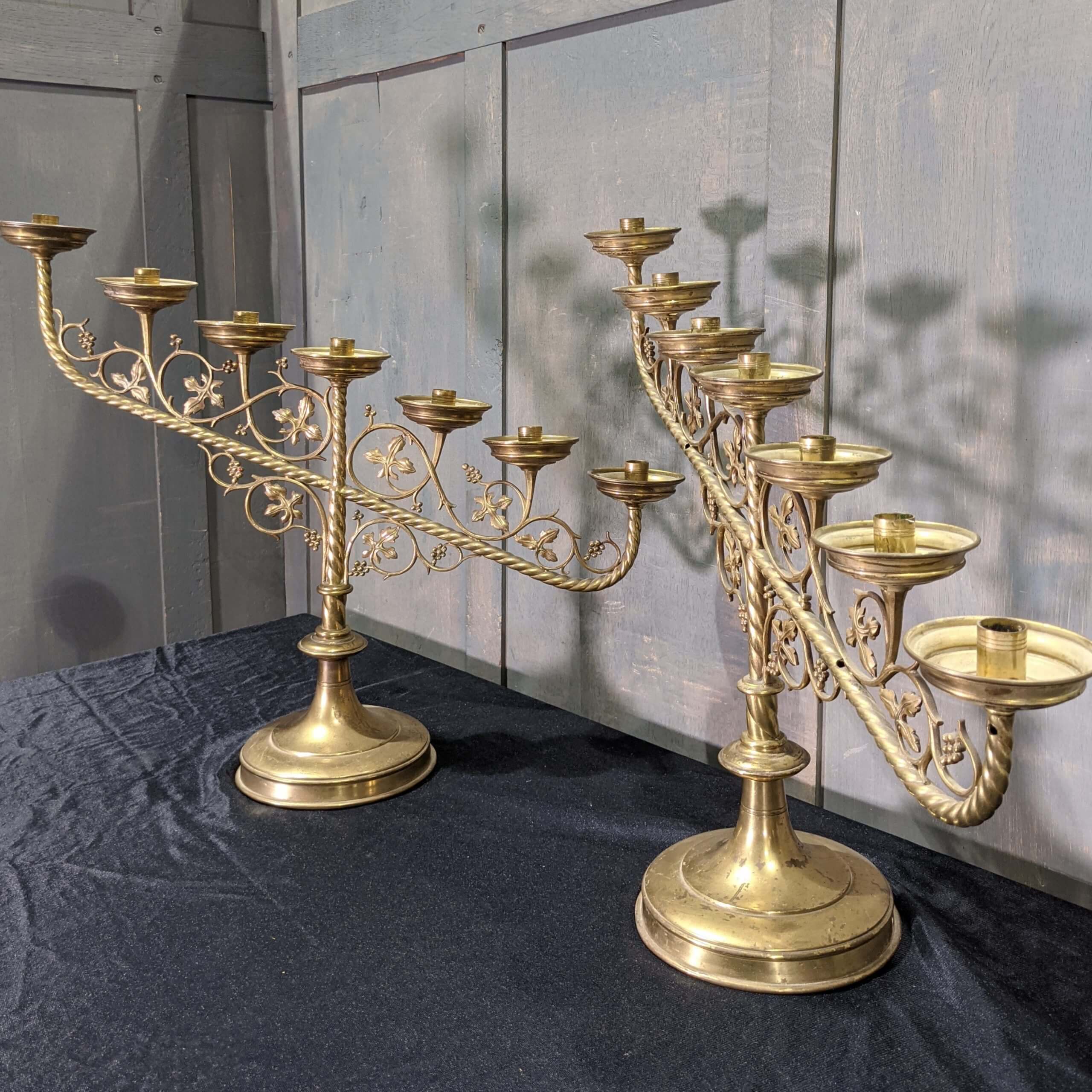 Our product shown on this page Pair of Ornate Brass Seven Branch Belgian Benediction Church Candlesticks Candelabra (SOLD) is currently available for hire.