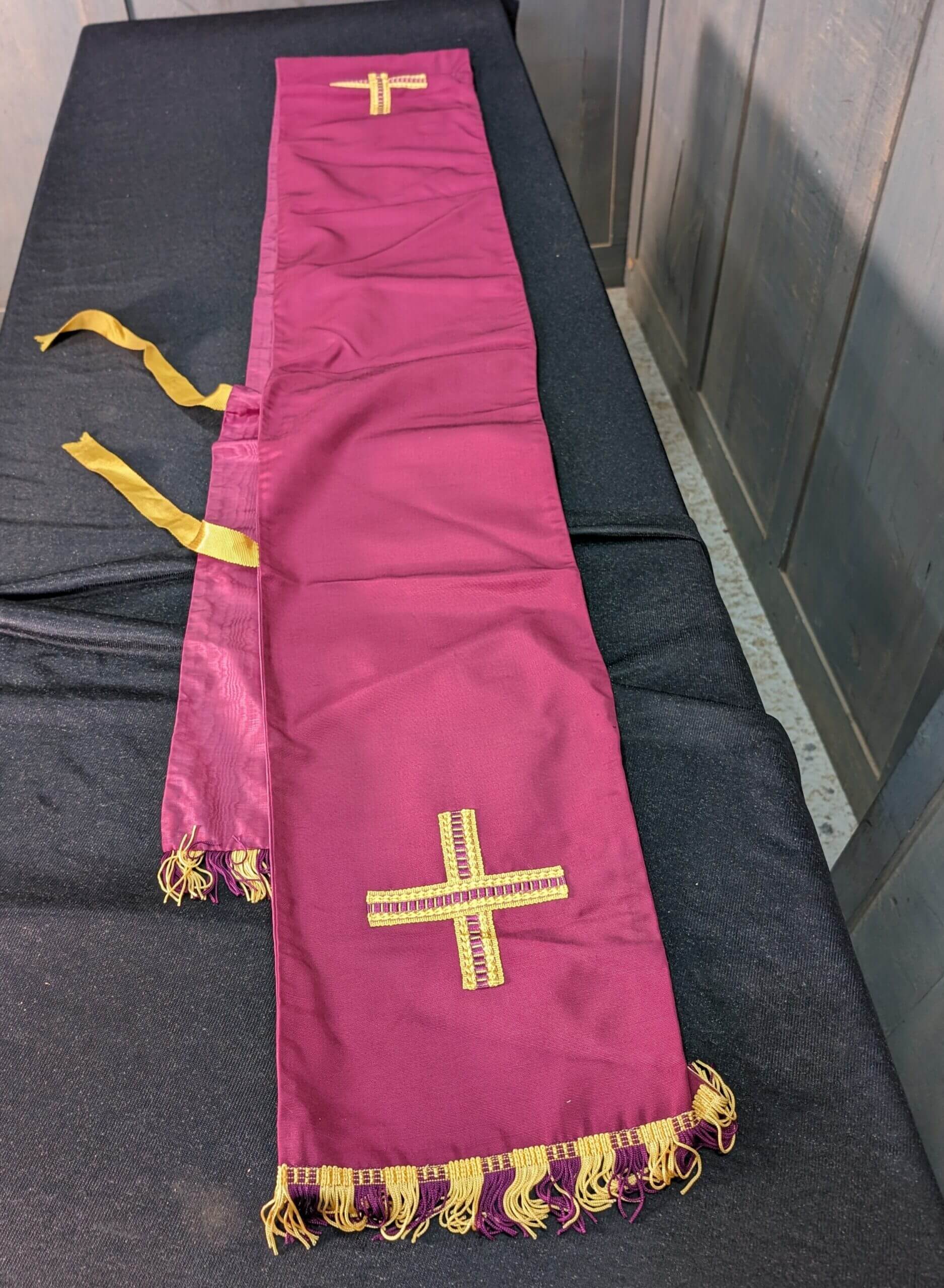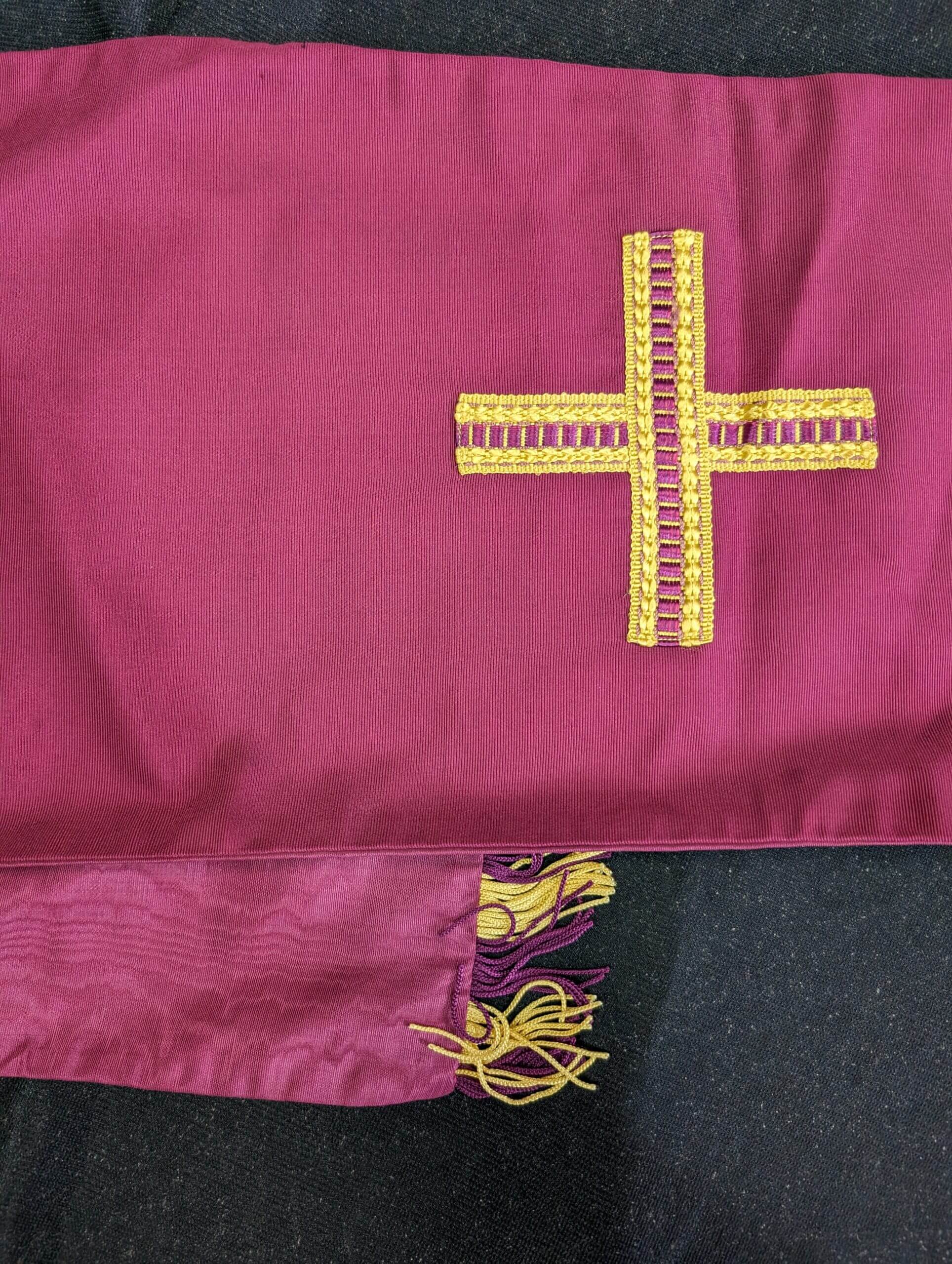 Our product shown on this page Purple and Gold Silk Lined Humeral Veil Priest’s Garment is currently available for hire.