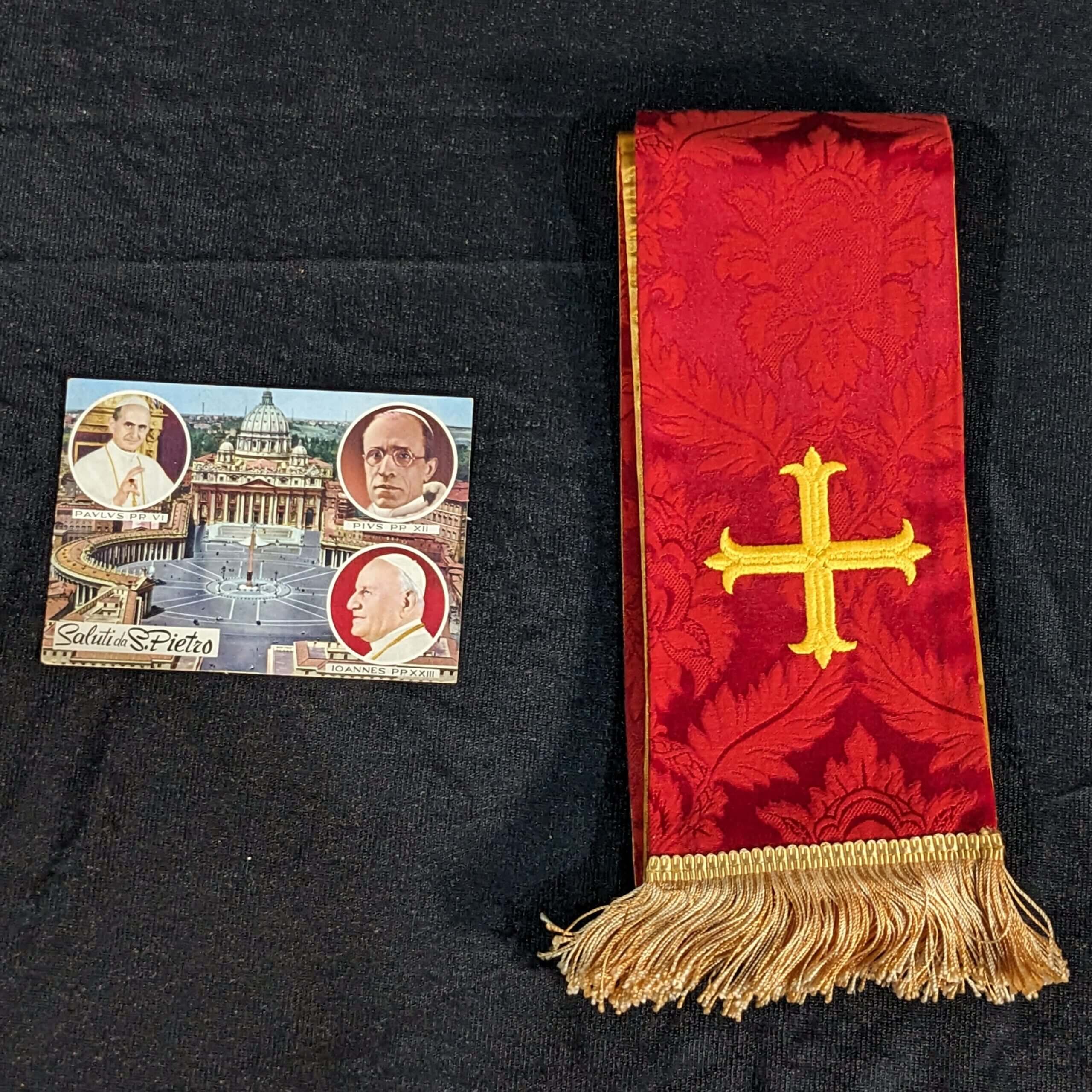 Our product shown on this page Red & Gold Damask Stole ‘House of Vanheems’ with Fleury Cross (SOLD) is currently available for hire.