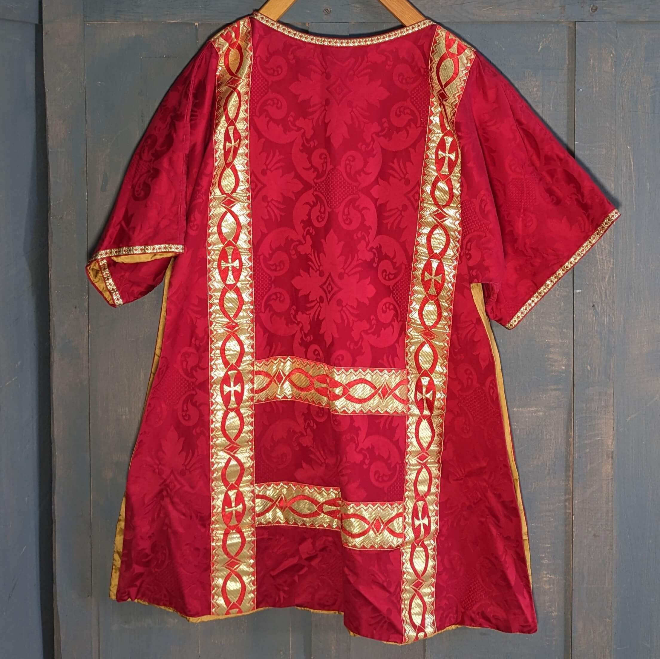 Our product shown on this page Red Gothic Silk Dalmatic with Gold & Red Orphreys in Double H Pattern (SOLD) is currently available for hire.