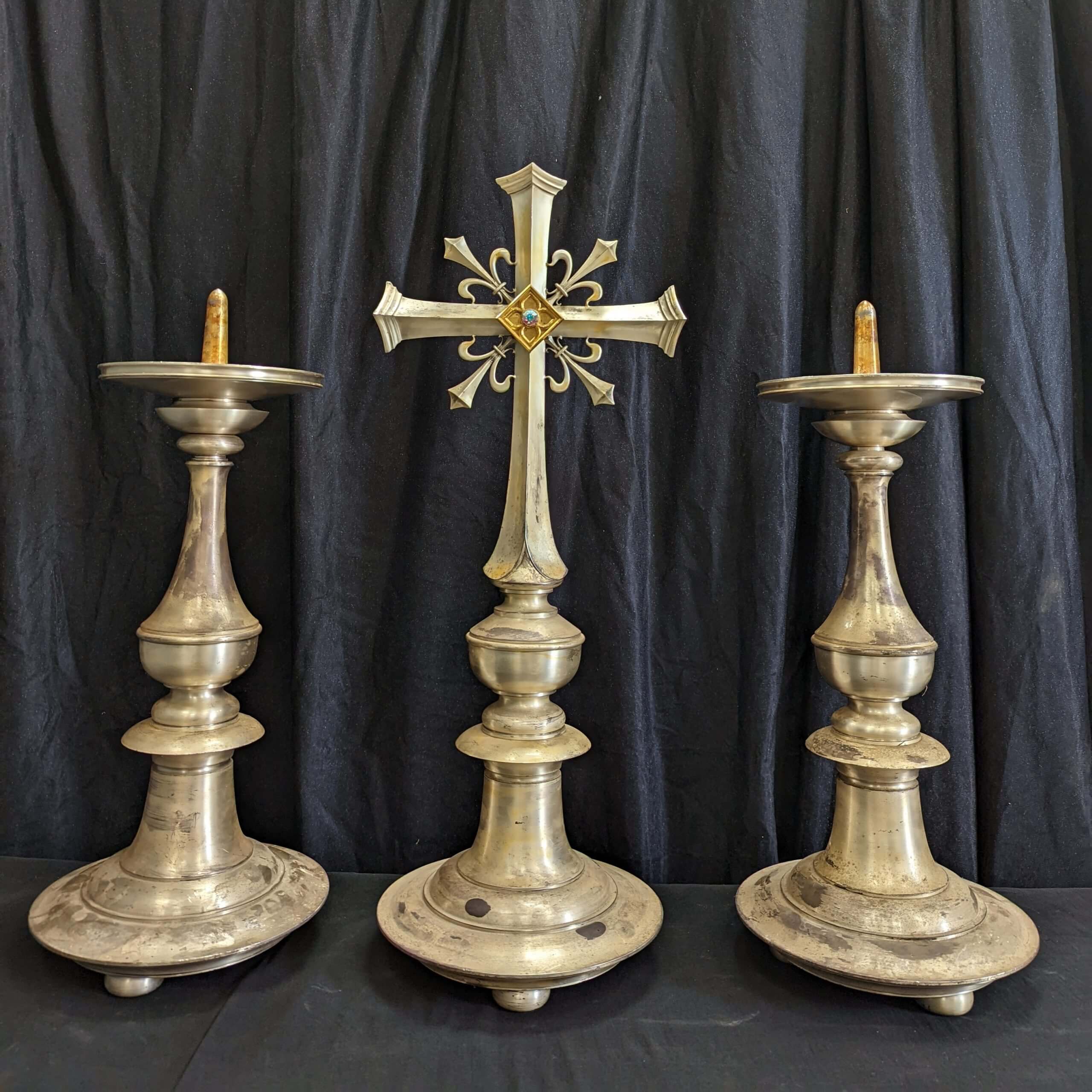 Our product shown on this page Remarkable Modern yet Classical Incredibly Heavy Bronze Altar Cross & Candlestick Set (SOLD) is currently available for hire.