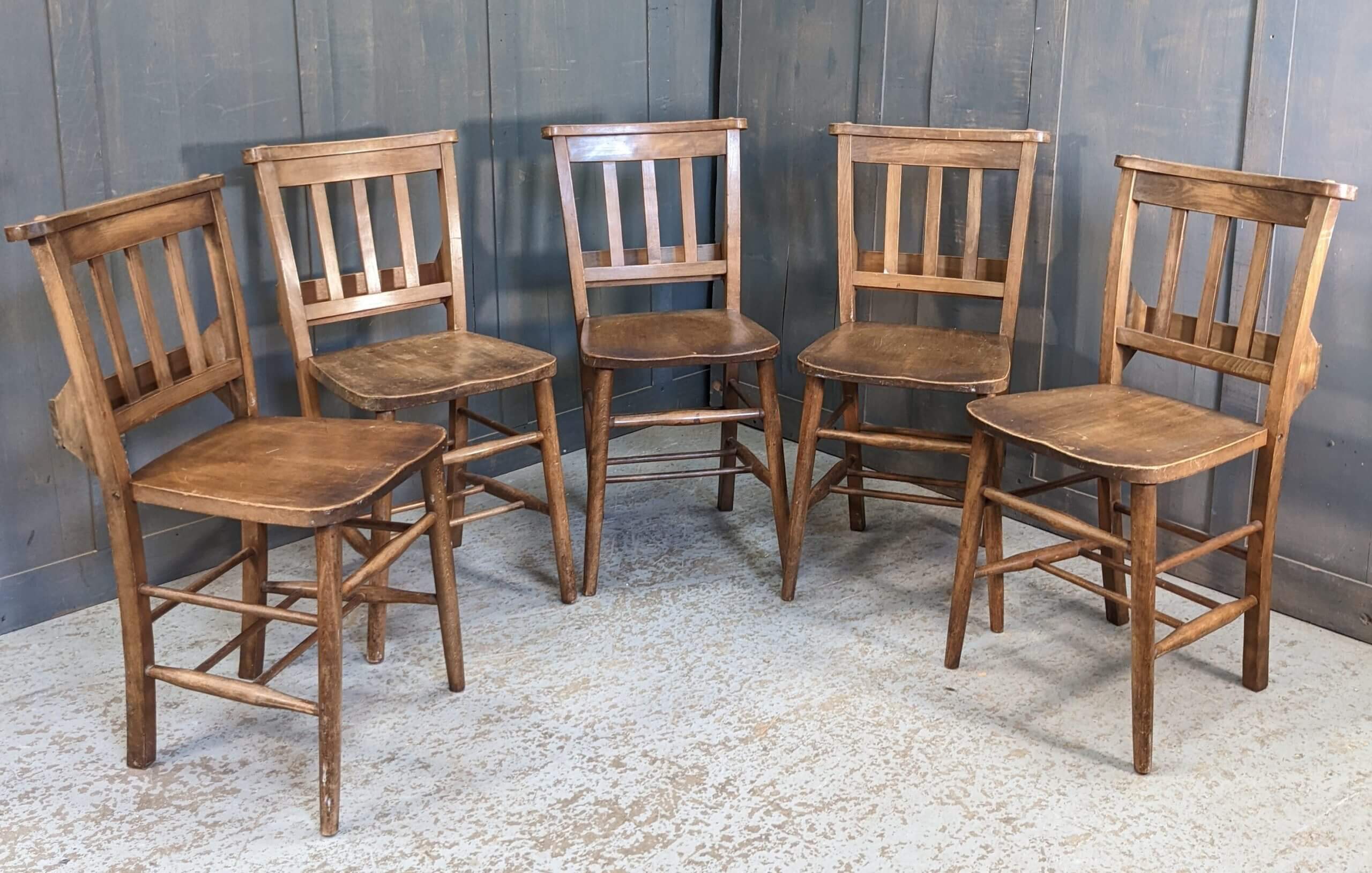 Set of 5 Attractive Dark Beech Slatback Church Chapel Chairs with Shaped Seats (SOLD)