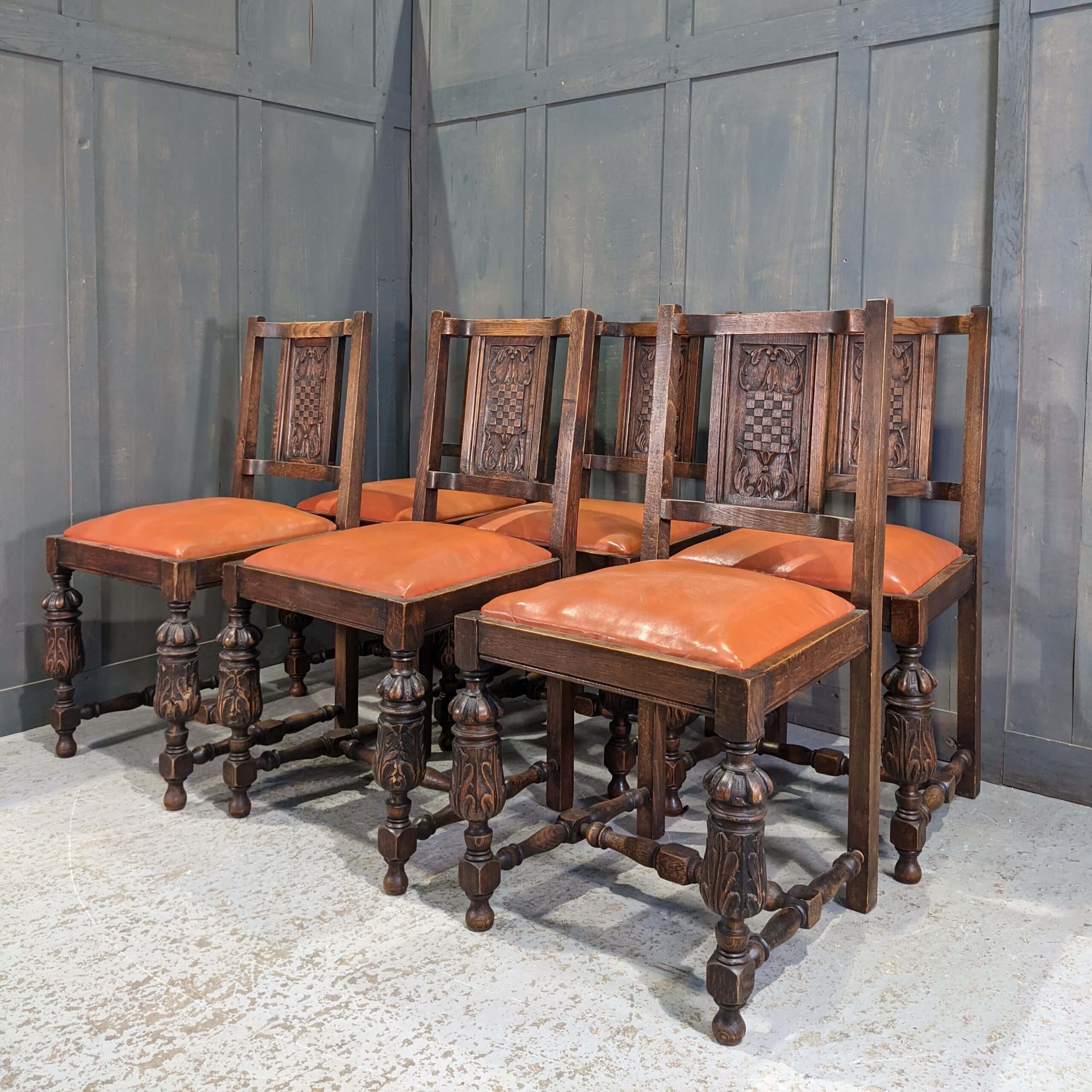 Set of 6 Carved Oak 1920’s Period Dining Chairs Reupholstered in Rich Orange Leather (SOLD)