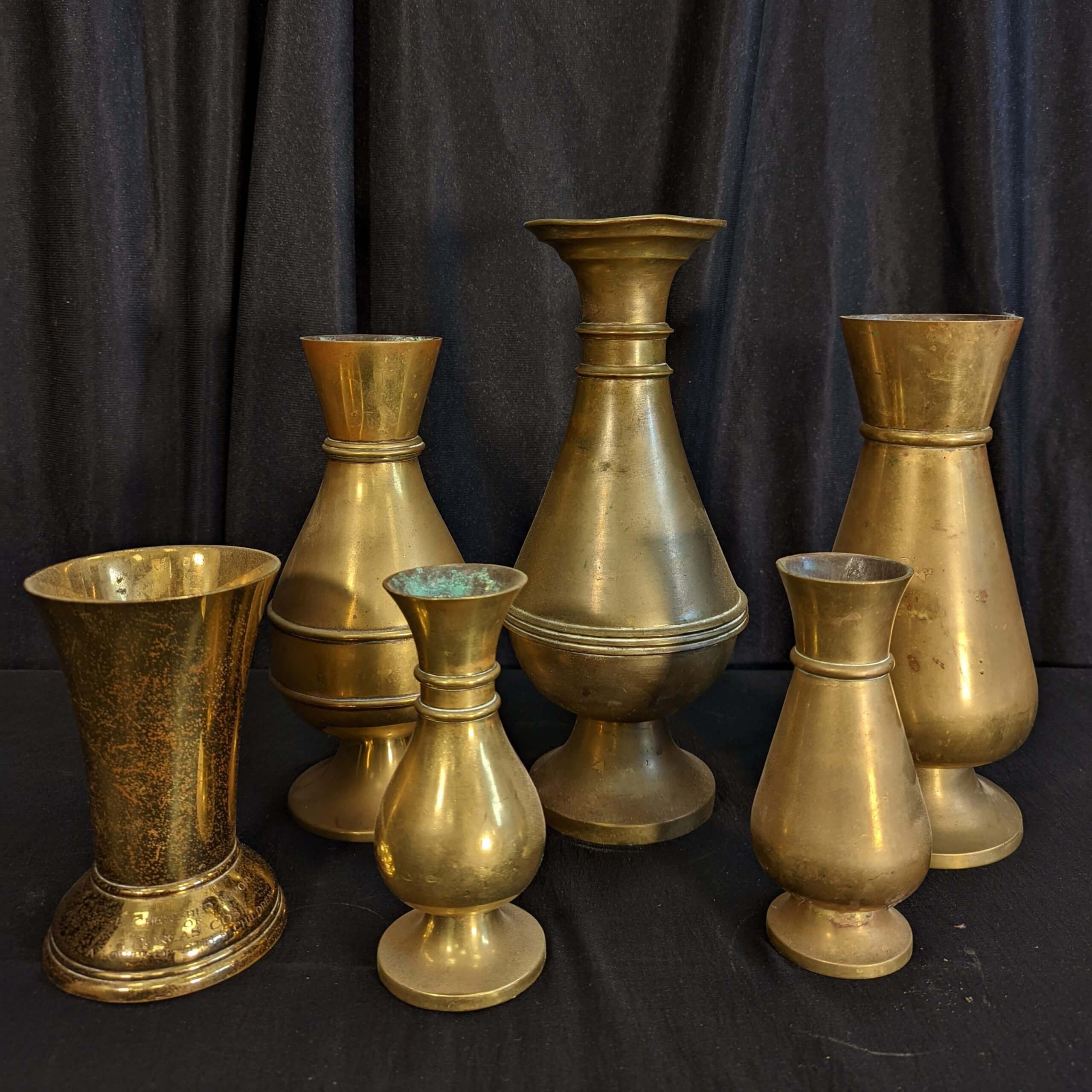 Our product shown on this page Six Assorted Mostly Victorian Brass Church Flower Vases (SOLD) is currently available for hire.
