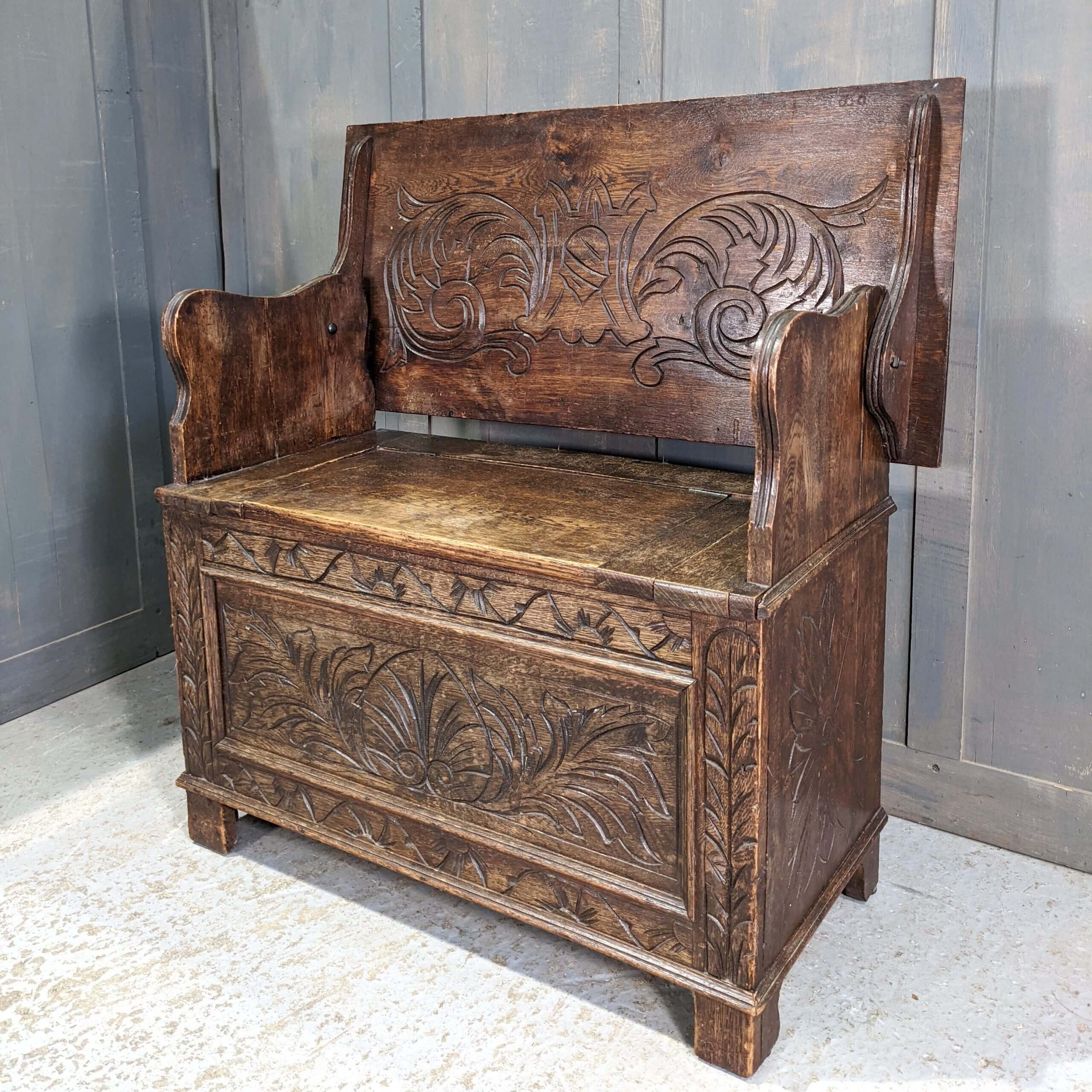 Our product shown on this page Smaller Size Carved Vintage Oak Monks Bench with Foliate Designs (SOLD) is currently available for hire.