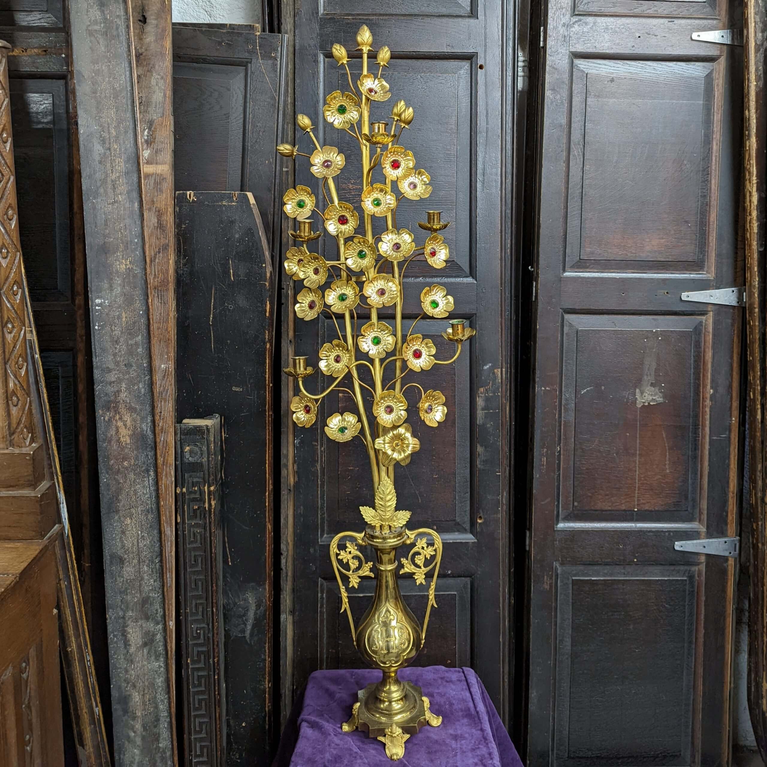 Our product shown on this page Spectacular Religious Gilt & Brass Gem Encursted Floral Candelabra (SOLD) is currently available for hire.