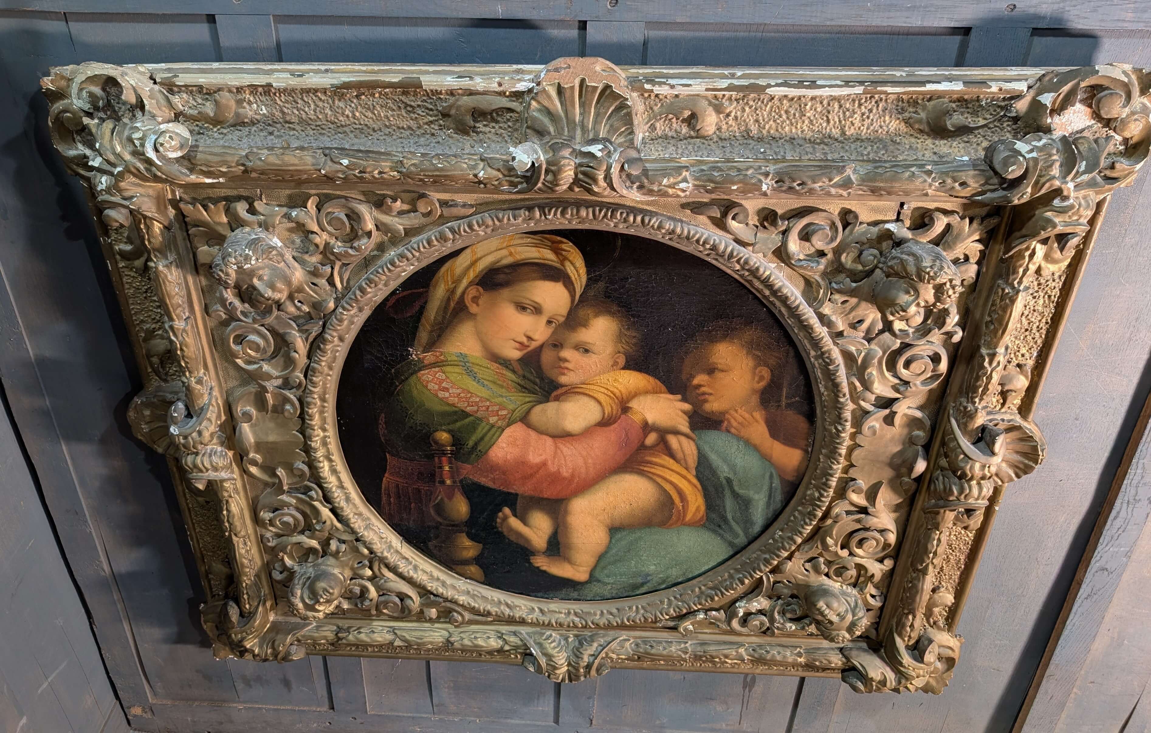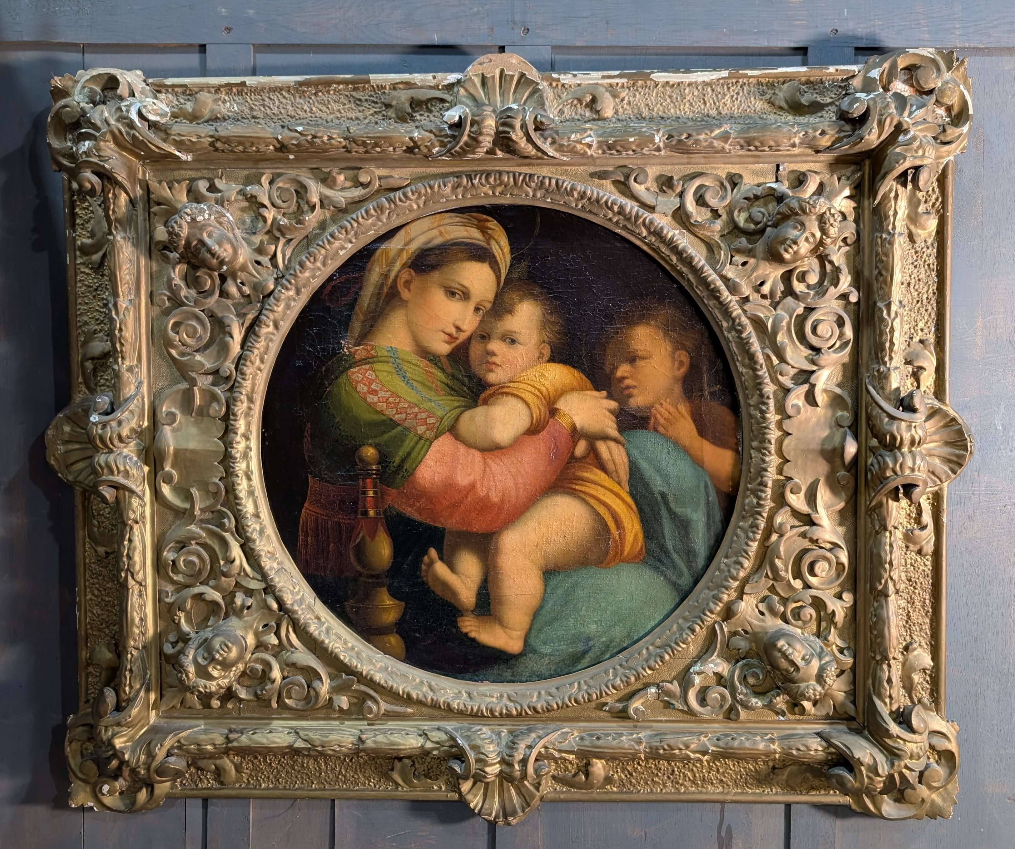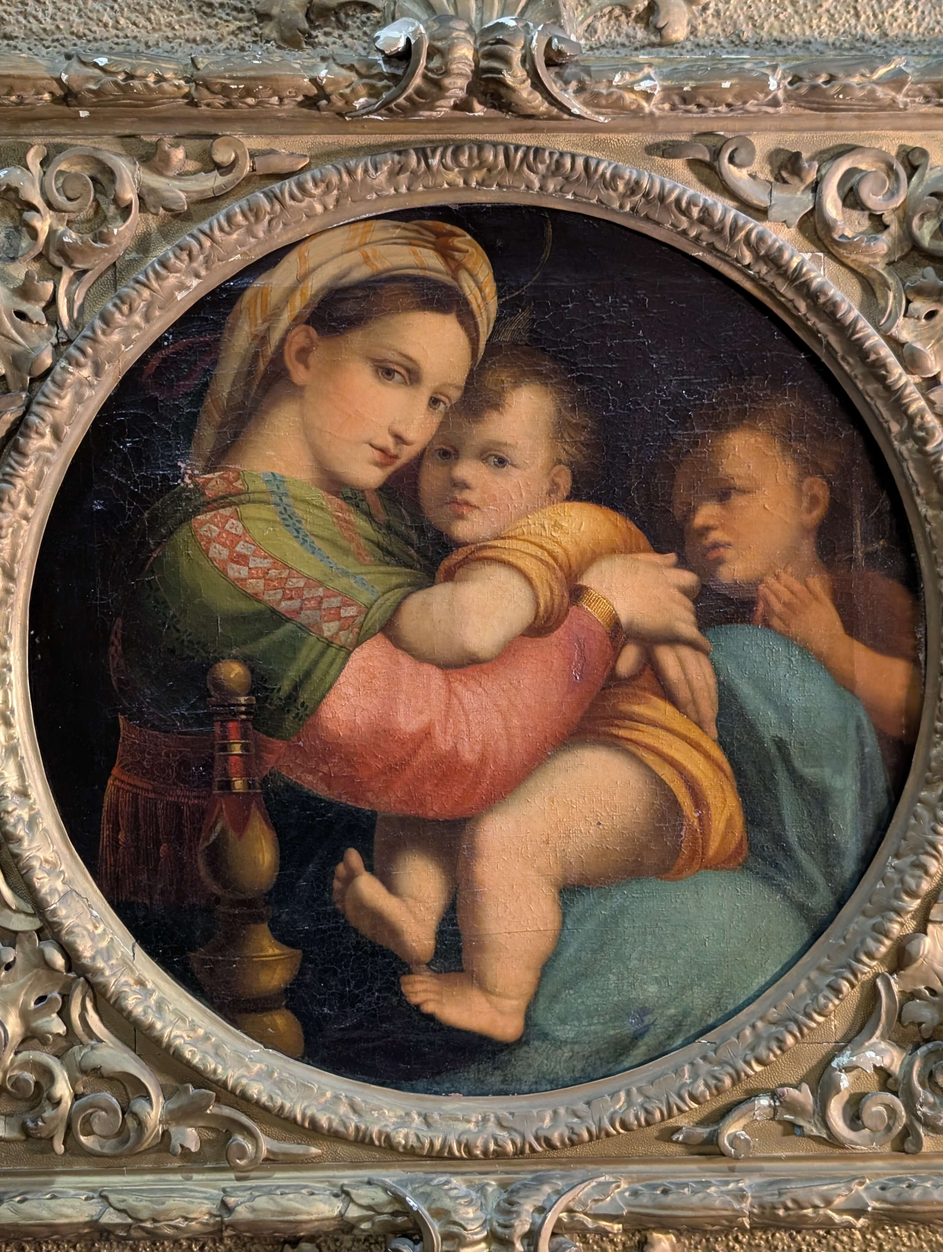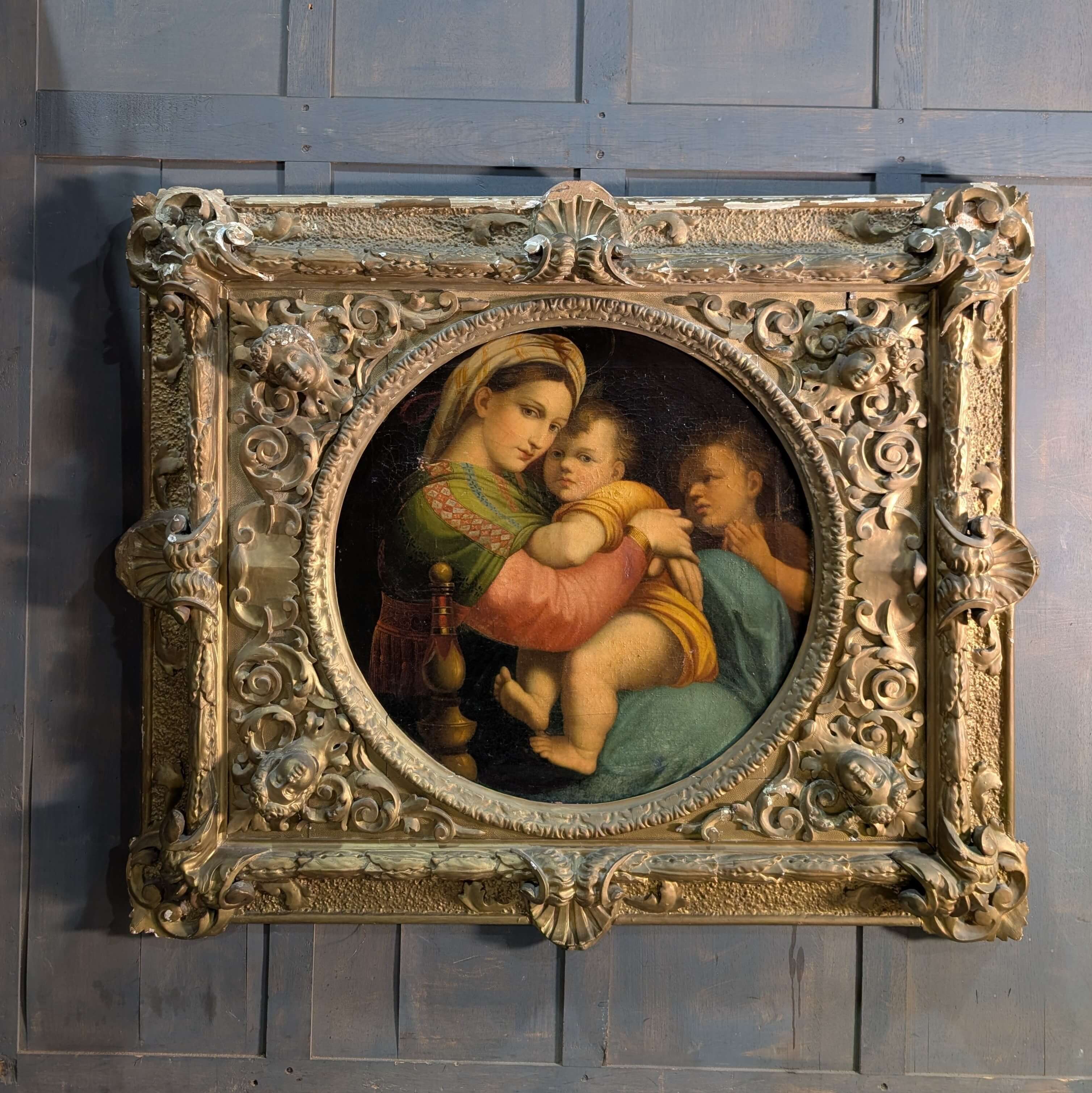 Our product shown on this page Spectacular Very Large Antique 19th Century Painting after Raphael’s Madonna and Child is currently available for hire.