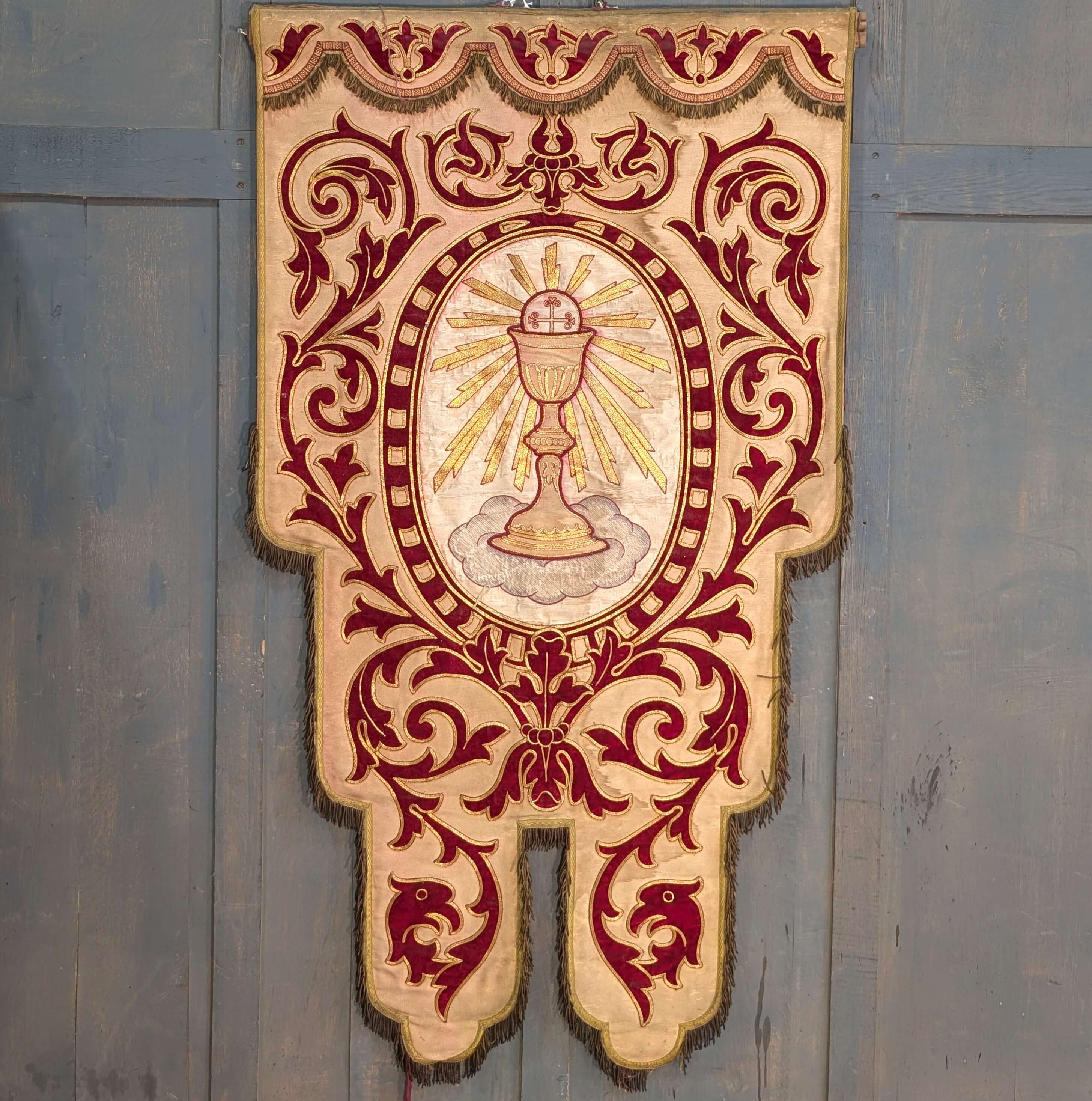 Our product shown on this page Striking and Special Heavily Embroidered Religious Hanging Banner Depicting The Holy Chalice (SOLD) is currently available for hire.