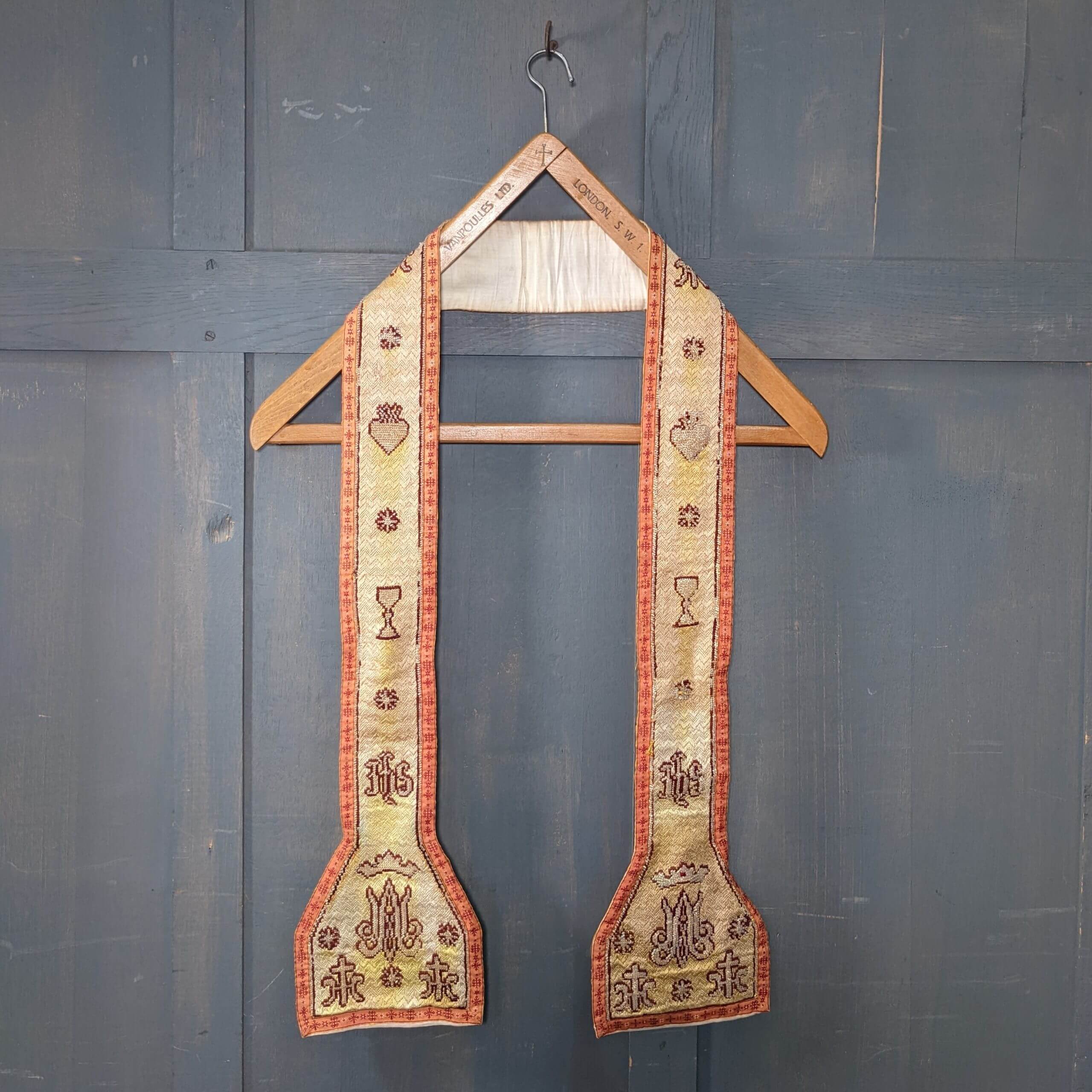 Our product shown on this page Striking Antique Beaded Bisque & Cream Ave Maria IHS Stole with Flared Ends (SOLD) is currently available for hire.