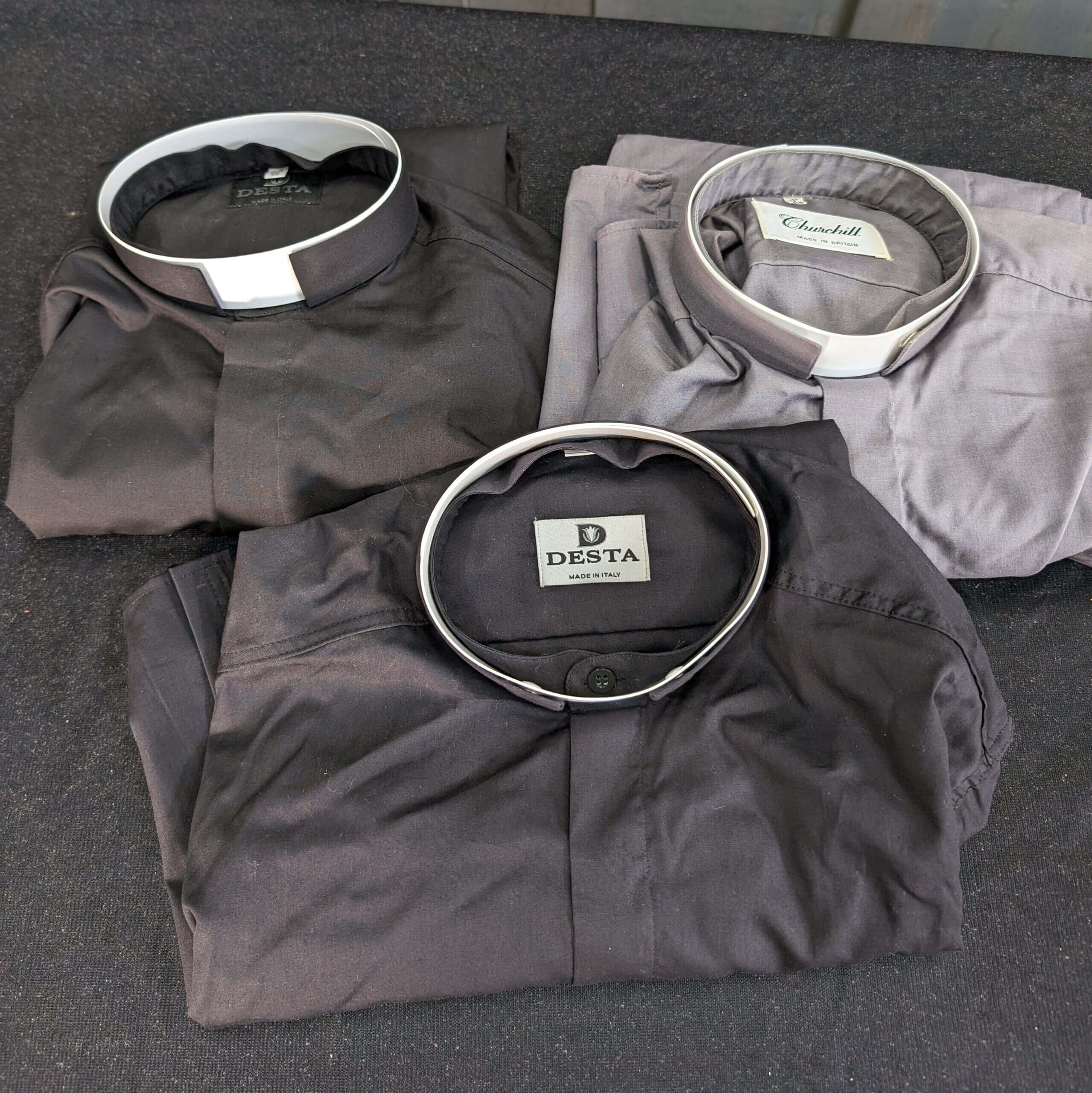 Our product shown on this page Three Crumpled As New Clergy Shirts With Dog Collars 15″ /38 cm (m) (SOLD) is currently available for hire.