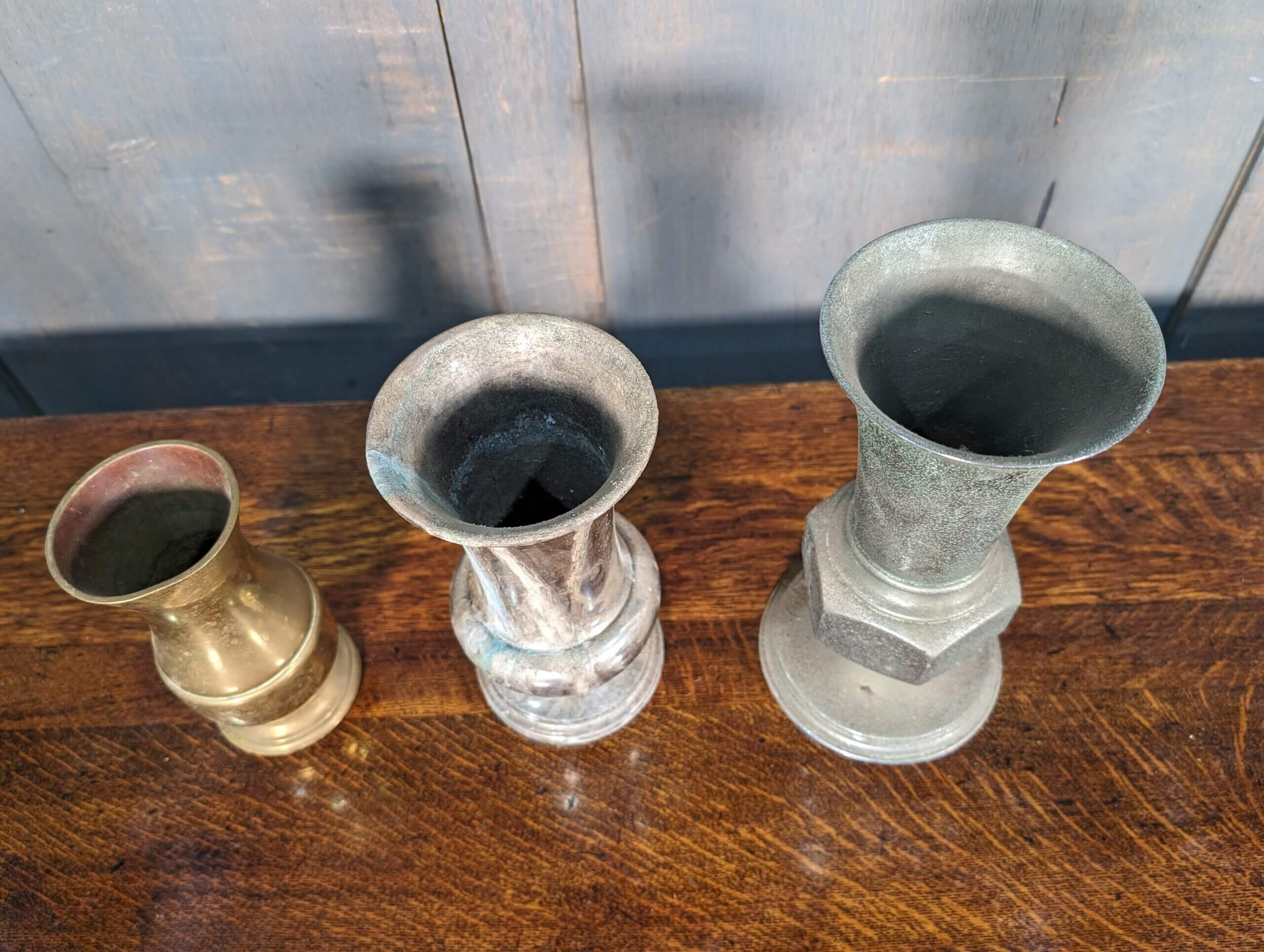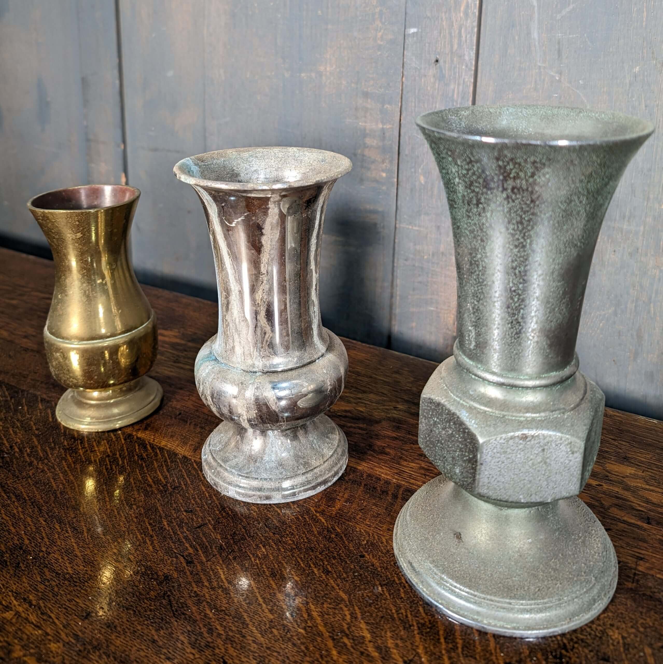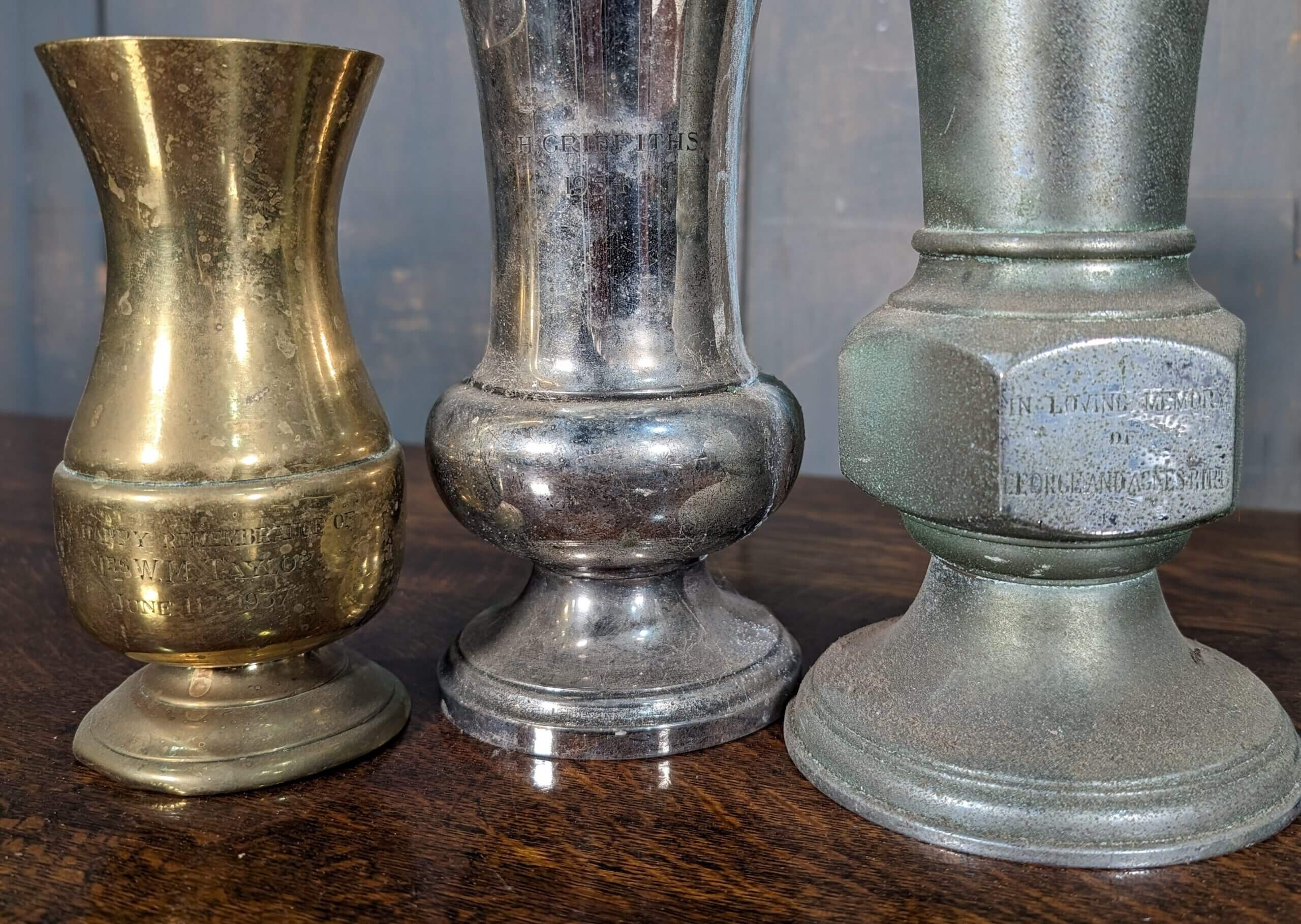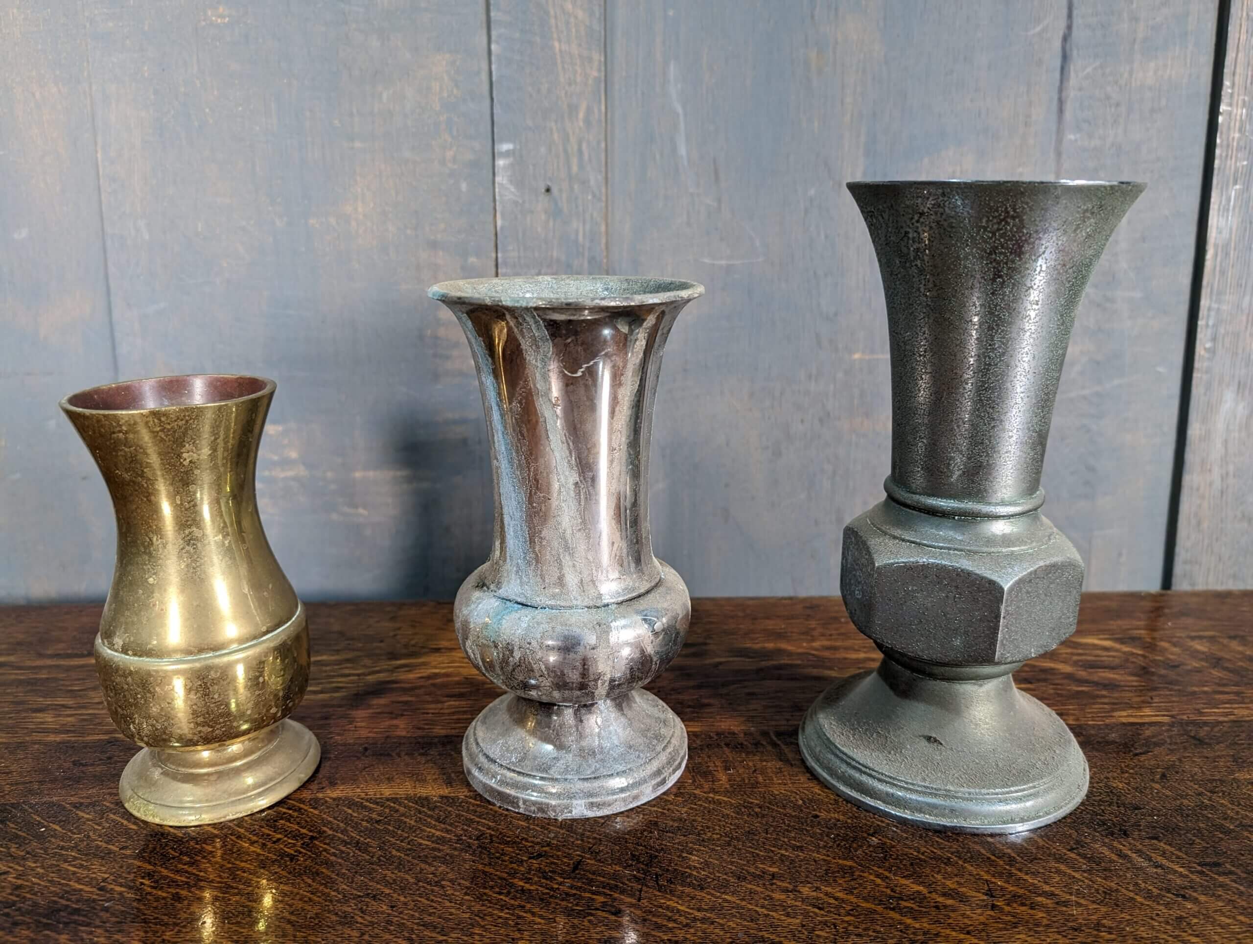 Our product shown on this page Three Vintage Brass Church Flower Vases Two Nickel Plated is currently available for hire.