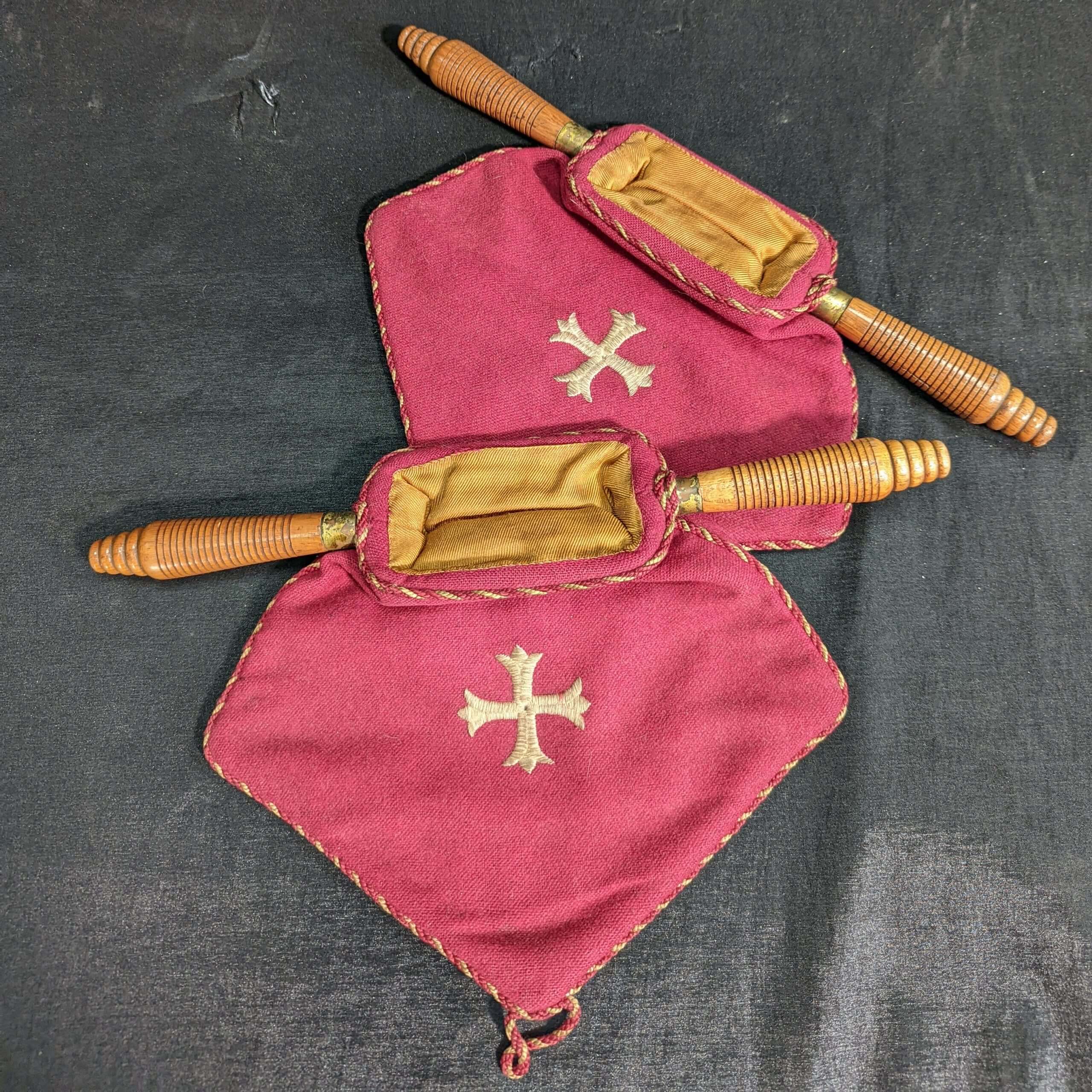 Our product shown on this page Two Vintage Church Collection Pouches with Oak Handles & Embroidered Crosses (SOLD) is currently available for hire.