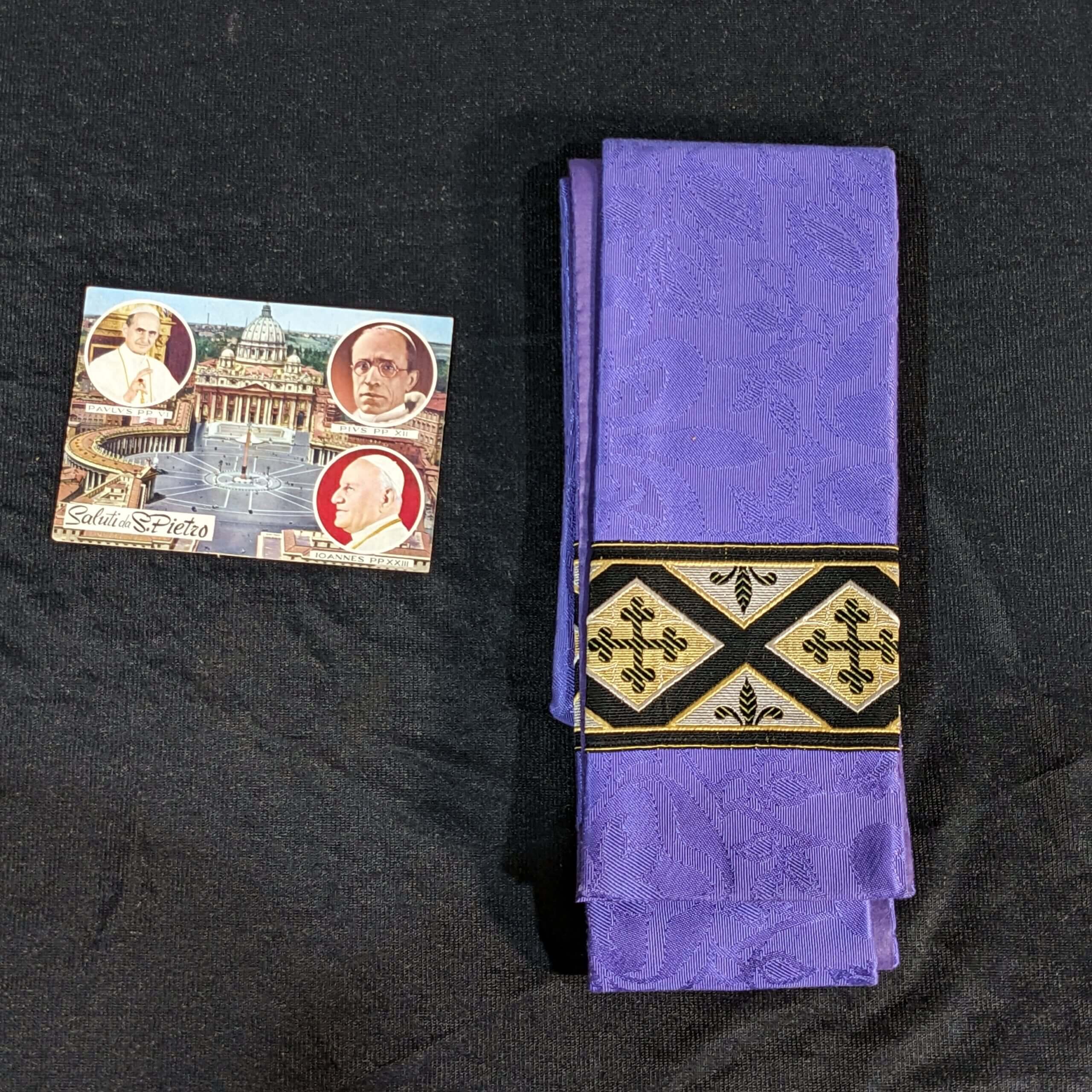 Our product shown on this page Unusual Thick & Heavy Light Purple Damask Stole with Fleur de Lys & Bottony Crosses (SOLD) is currently available for hire.