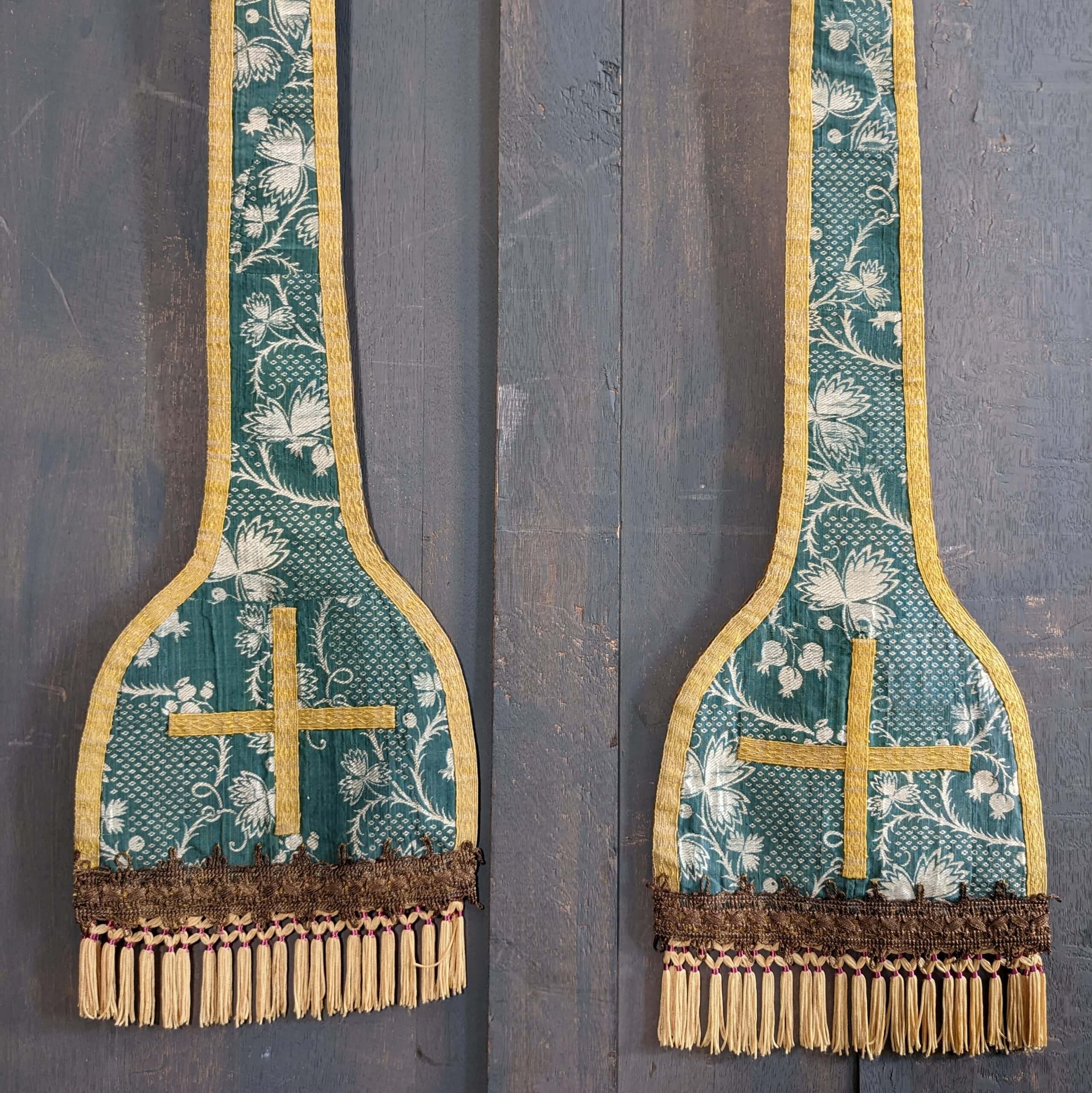 Our product shown on this page Unusual Vintage Green & Gold Stole with Cross & Fringe (SOLD) is currently available for hire.