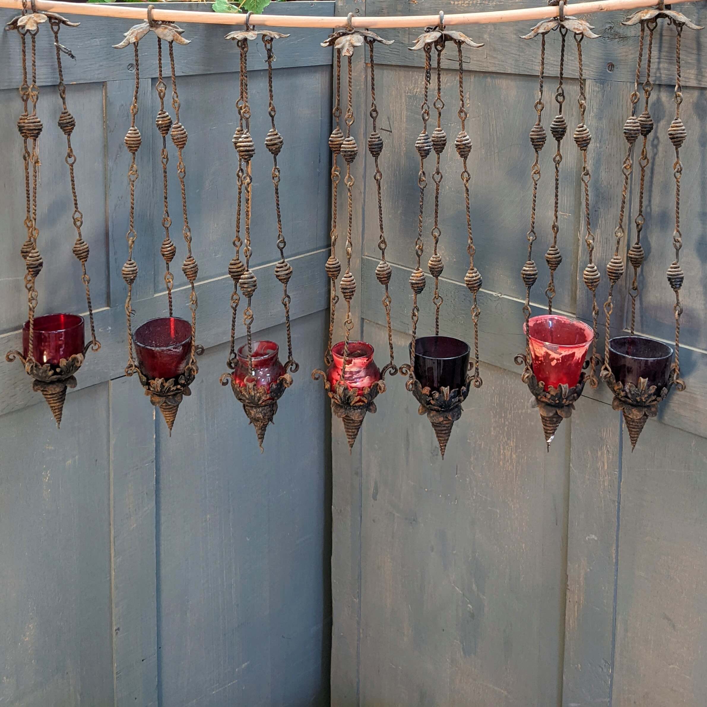 Our product shown on this page Unusual Vintage Iron & Glass Set of Seven Hanging Sanctuary Lamps (SOLD) is currently available for hire.