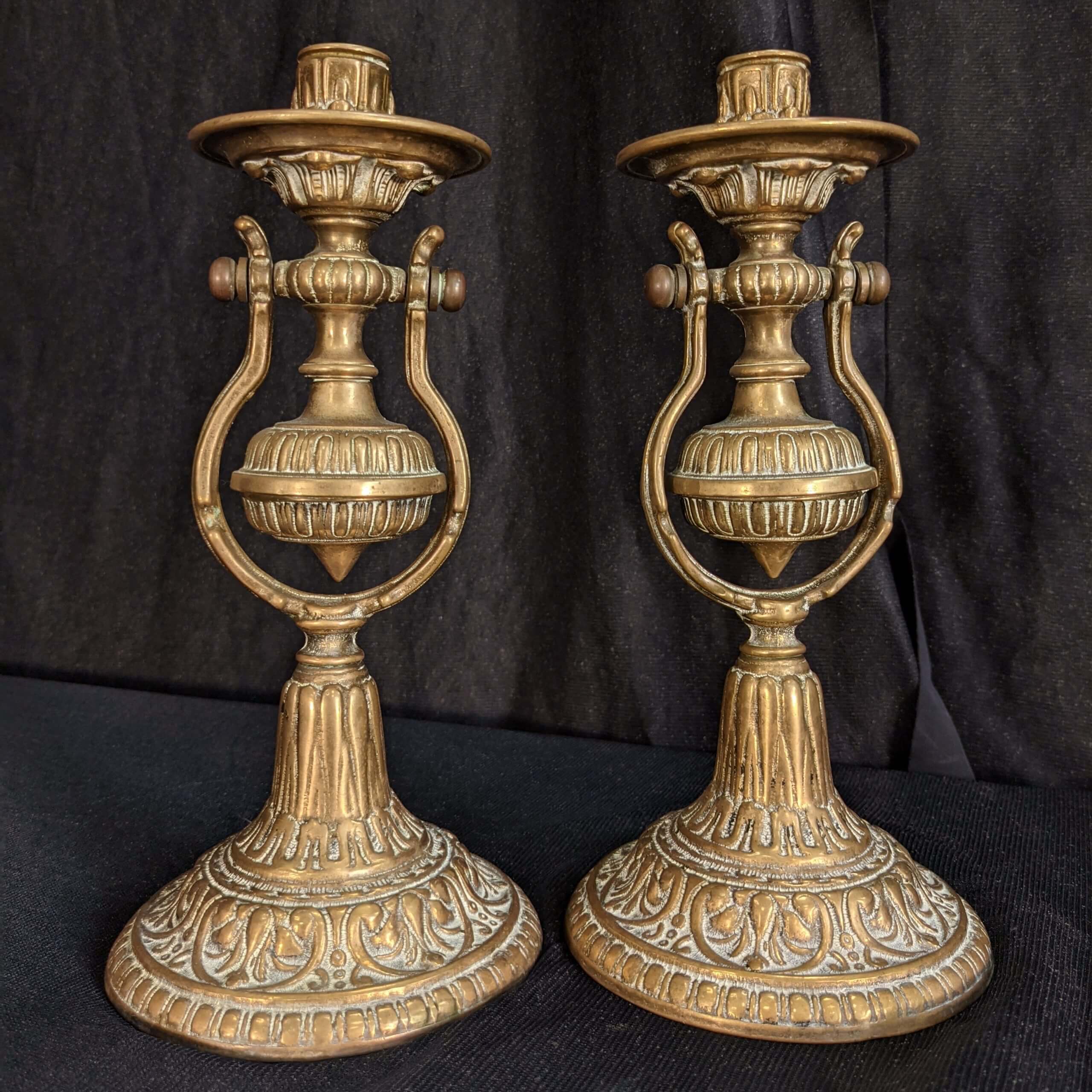 Our product shown on this page Unusual Vintage Metamorphic Orthodox Weighted Brass Candlesticks (SOLD) is currently available for hire.
