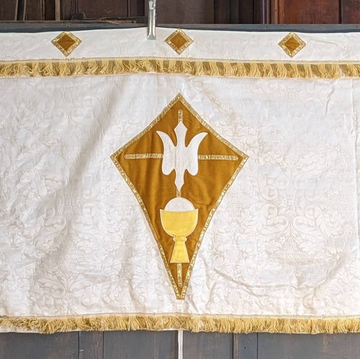 Our product shown on this page Unusual Welsh Made Wrap-Around White & Gold Yellow Silk Damask Altar Frontal with Dove & Chalice (SOLD) is currently available for hire.