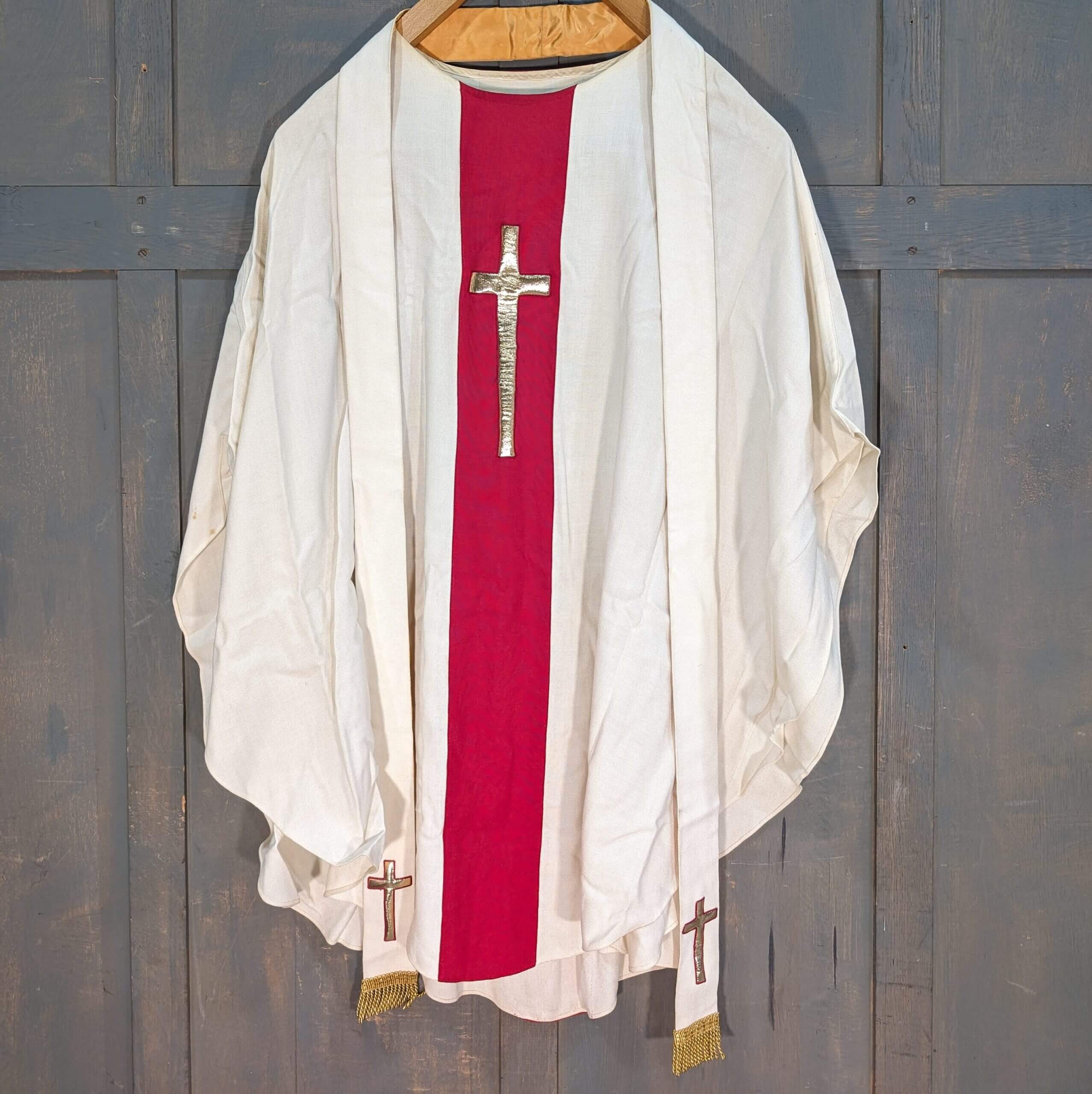 Vanpoulles 1960’s Vintage Simple White & Red Linen Unlined Chasuble & Stole with Gold Crosses (SOLD)