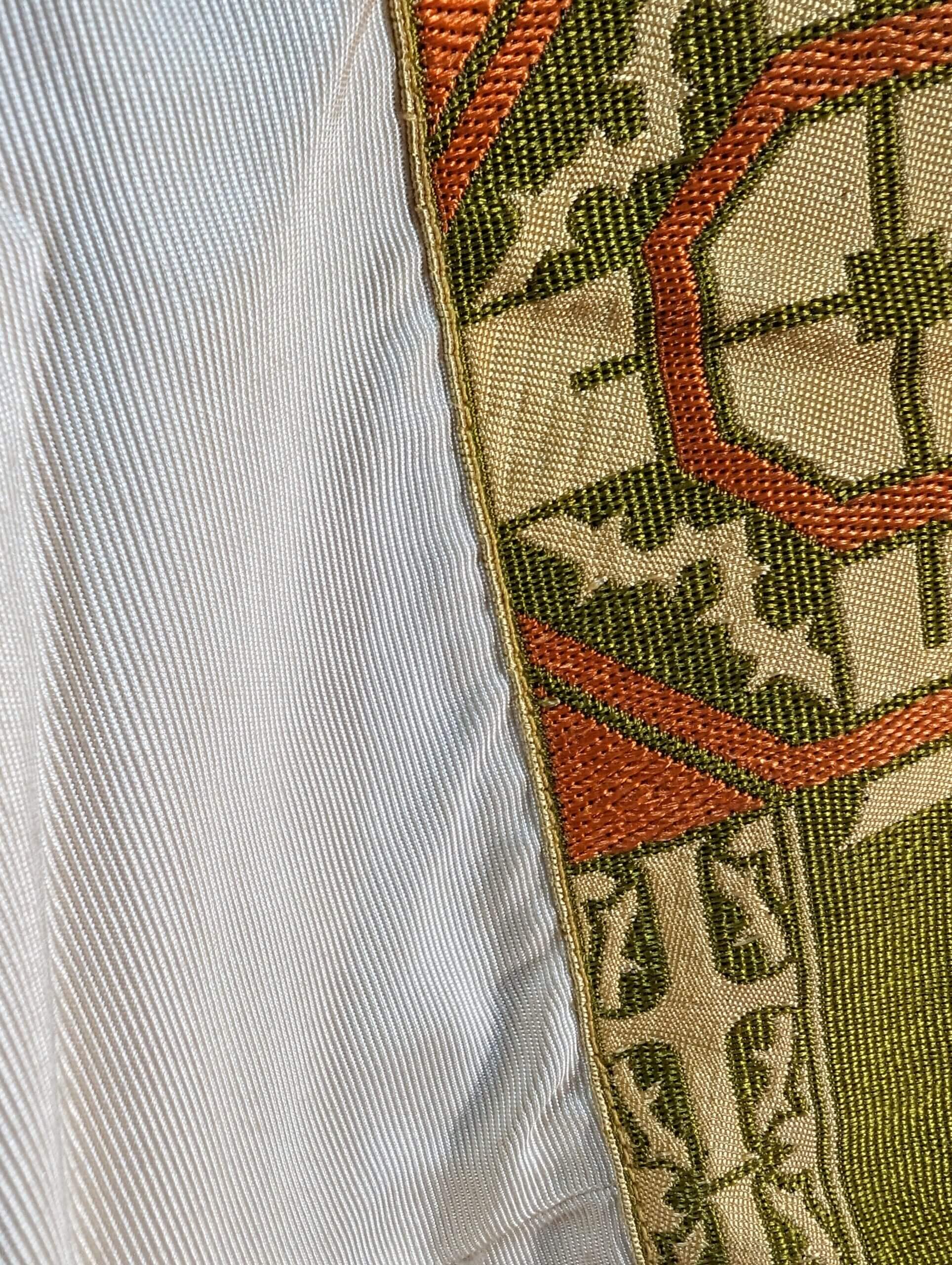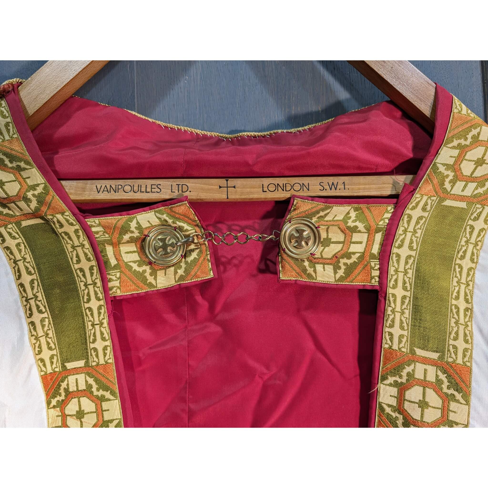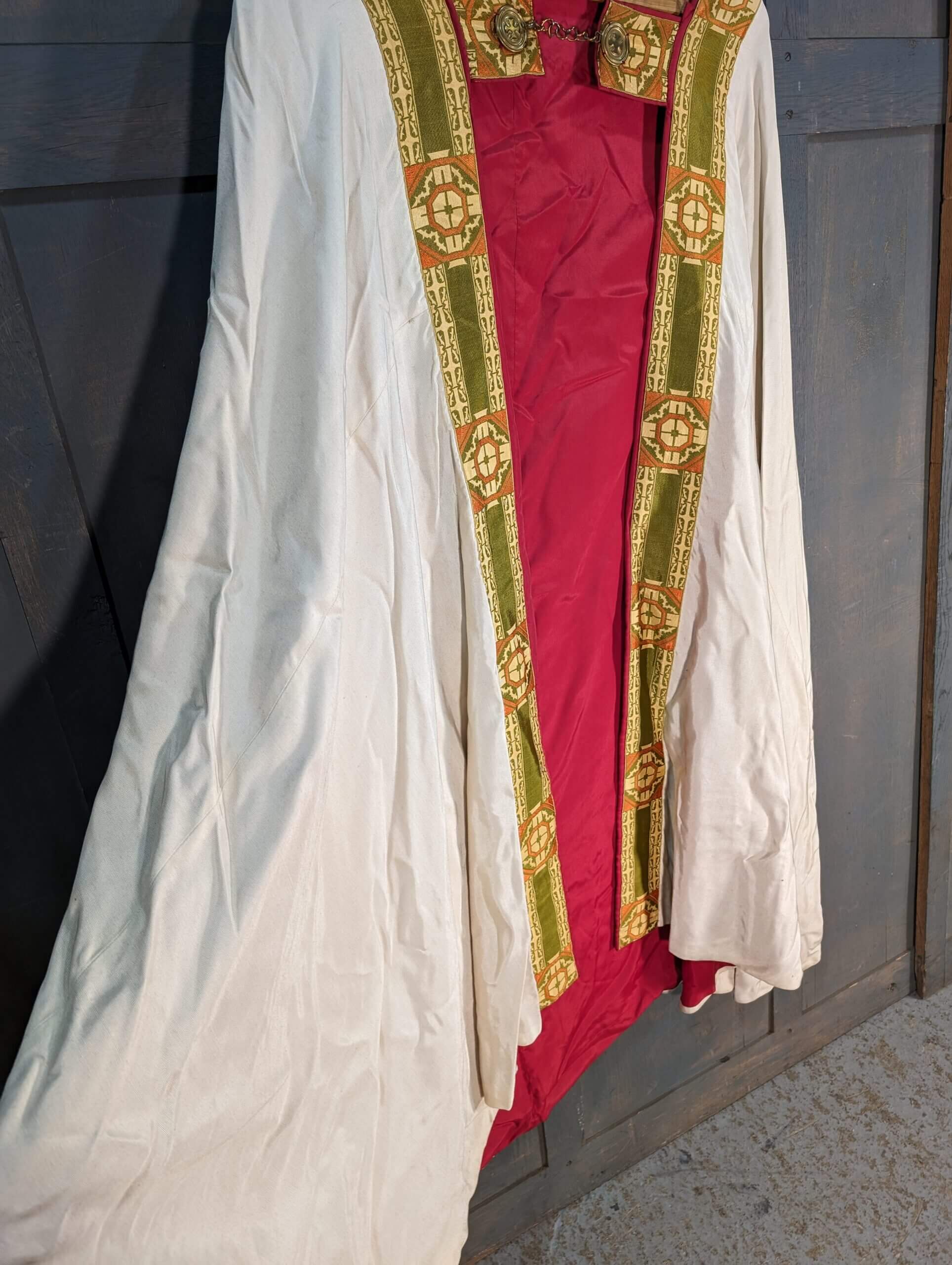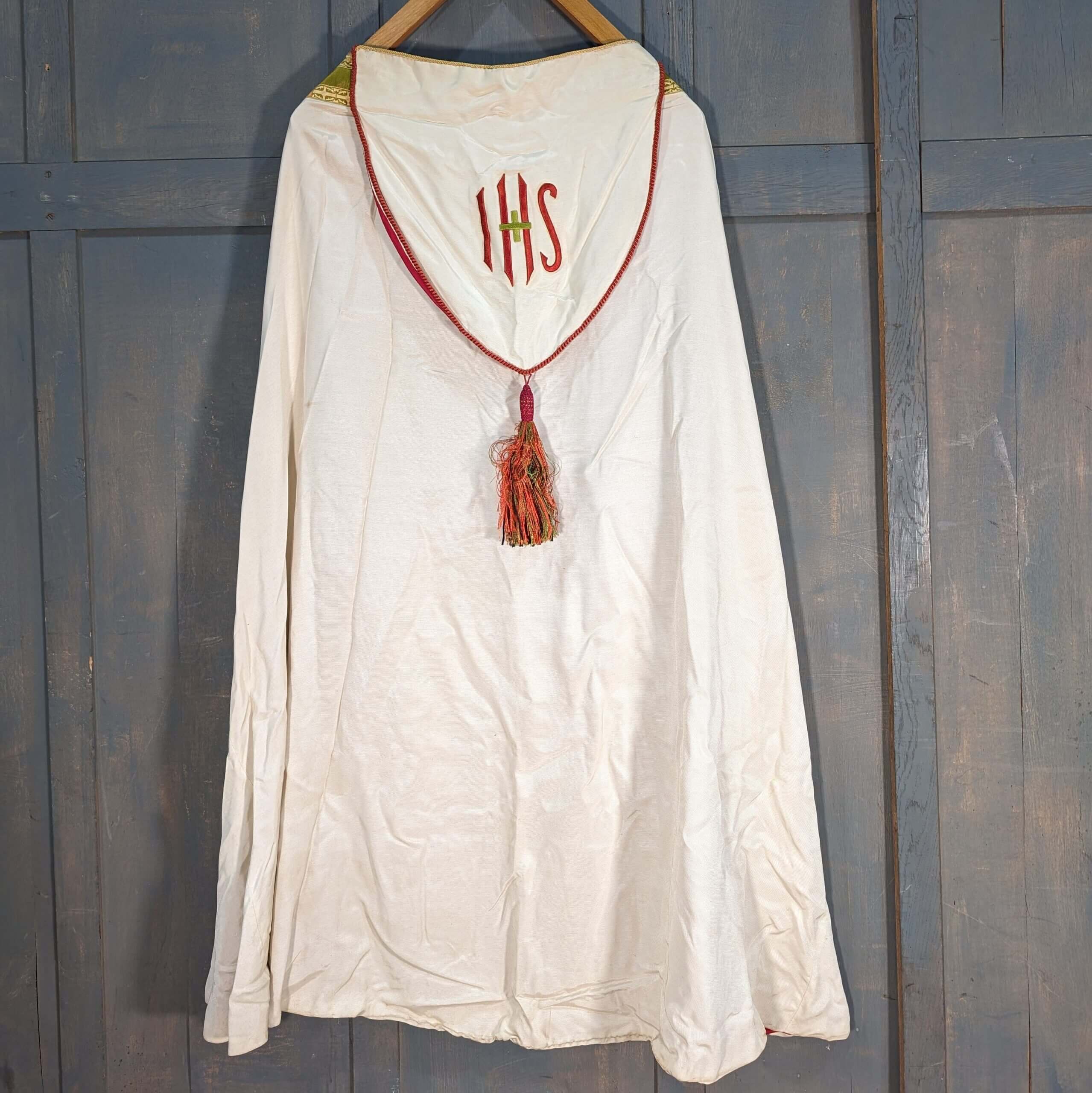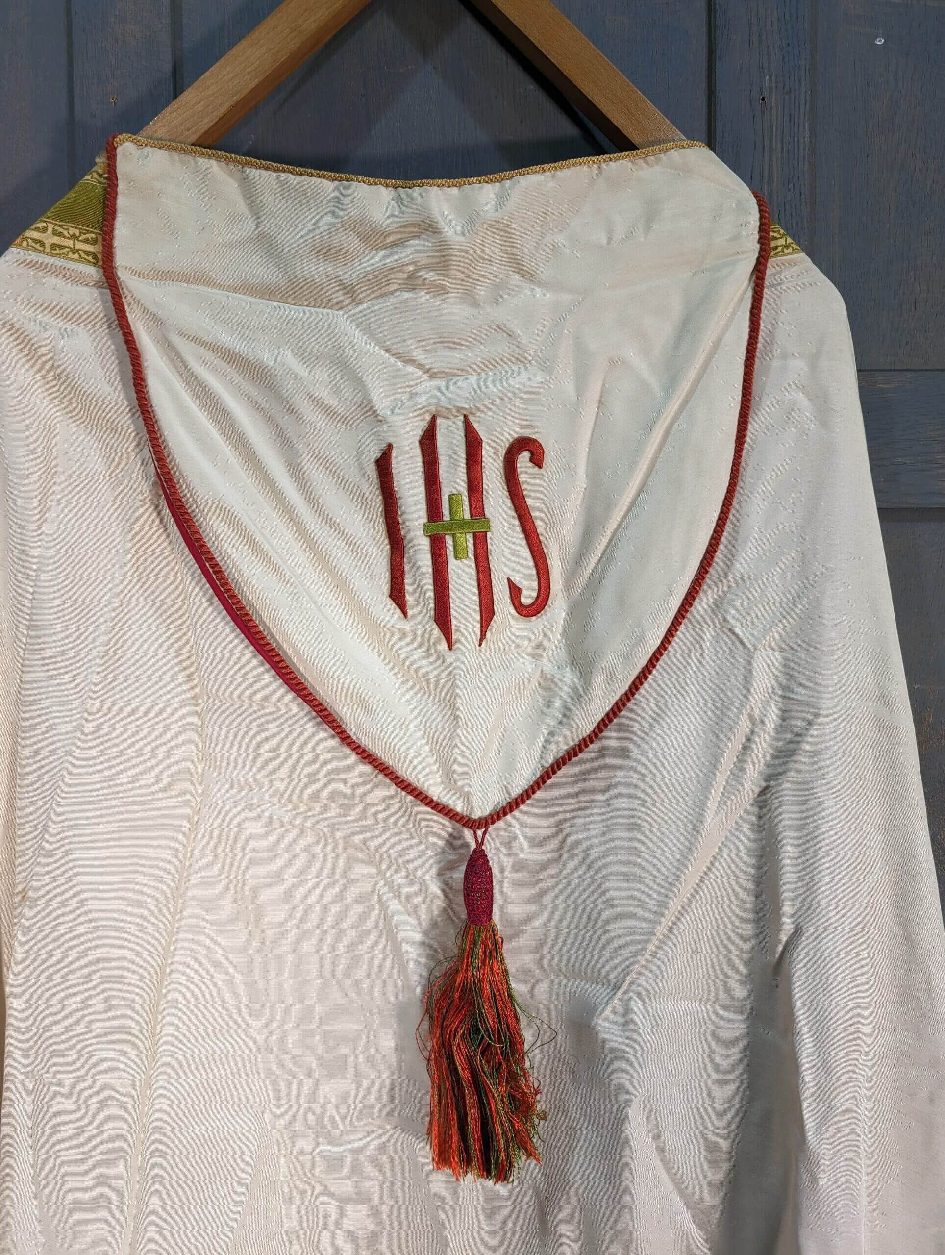 Our product shown on this page Vanpoulles Mid-Century Ivory Silk Cope with Green Gold Orphreys & Red Silk Lining is currently available for hire.