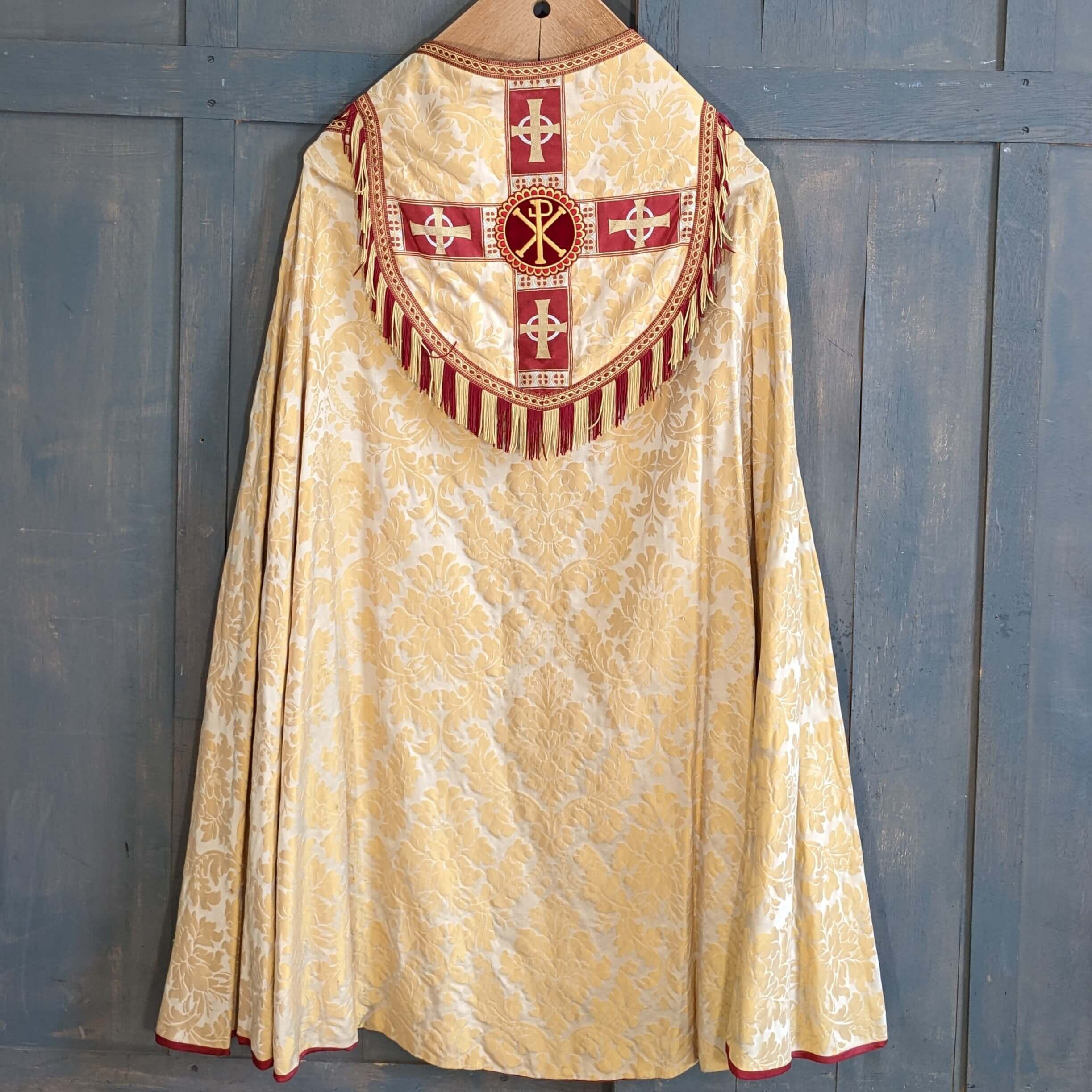 Very Fine Cream Brocade Damask Large Cope with Chi Rho Applique & Fringing (SOLD)