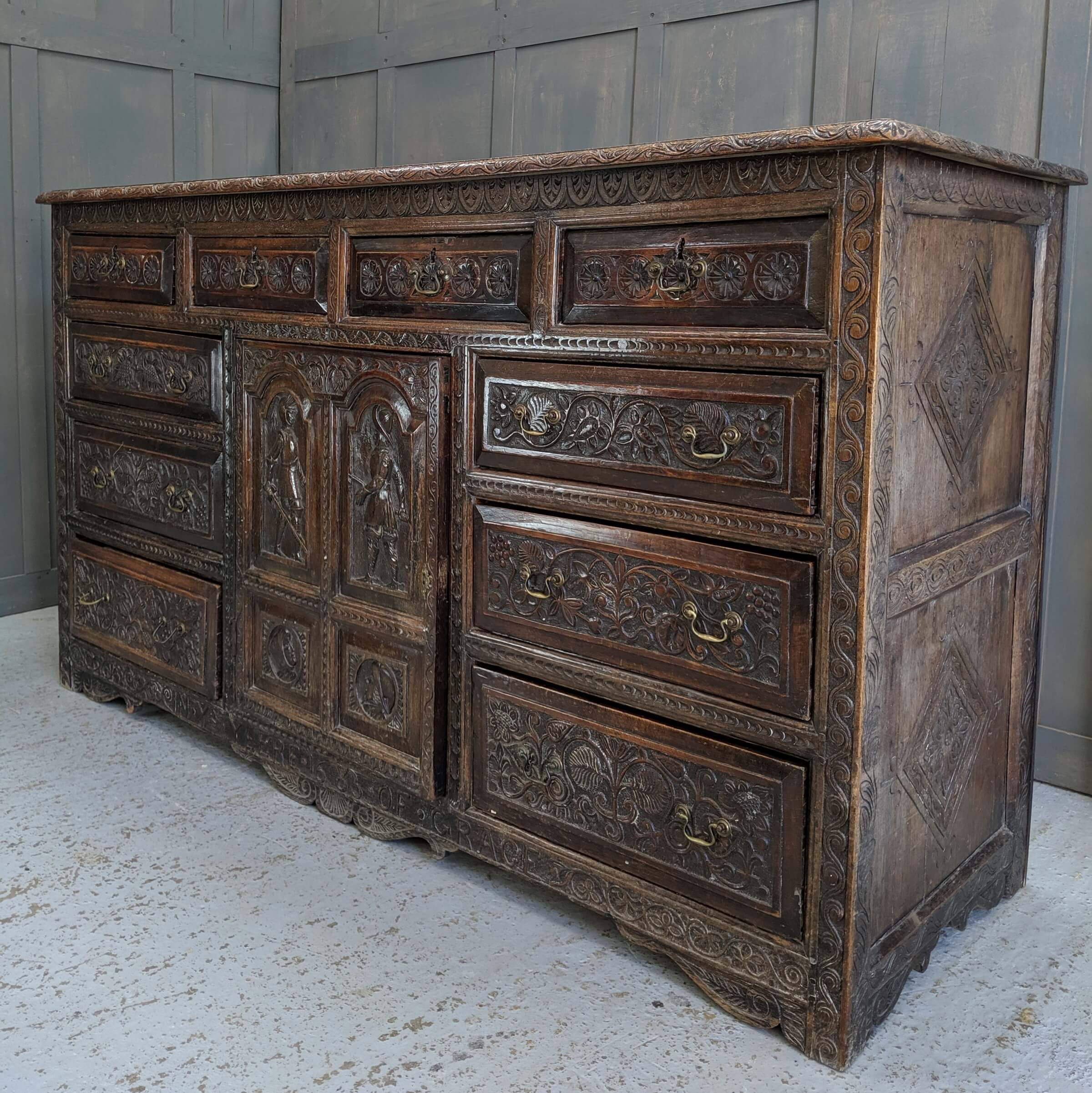 Our product shown on this page Very Grand & Early Carved Oak Dresser Sideboard dated 1683 (SOLD) is currently available for hire.