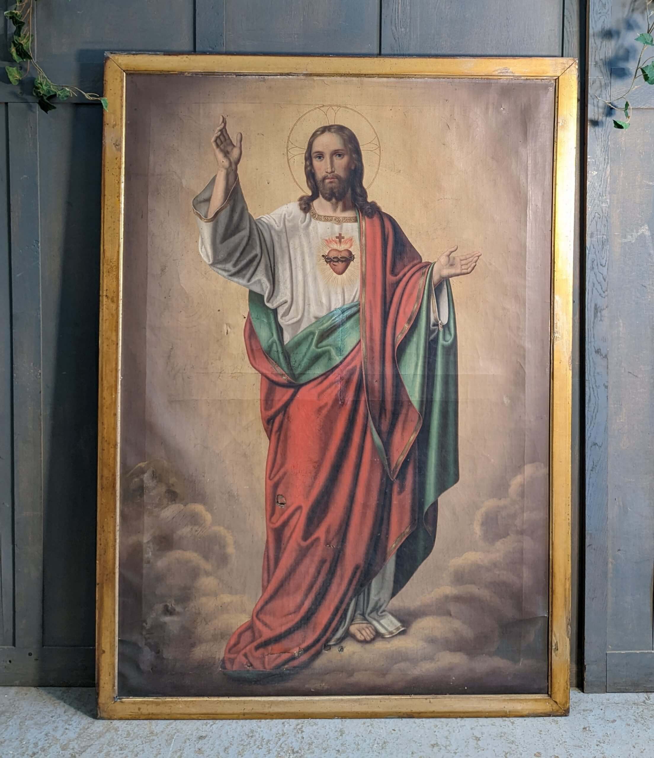 Our product shown on this page Very Large Antique Sacred Heart Jesus in Heaven Oil Painting in Gold Frame (SOLD) is currently available for hire.