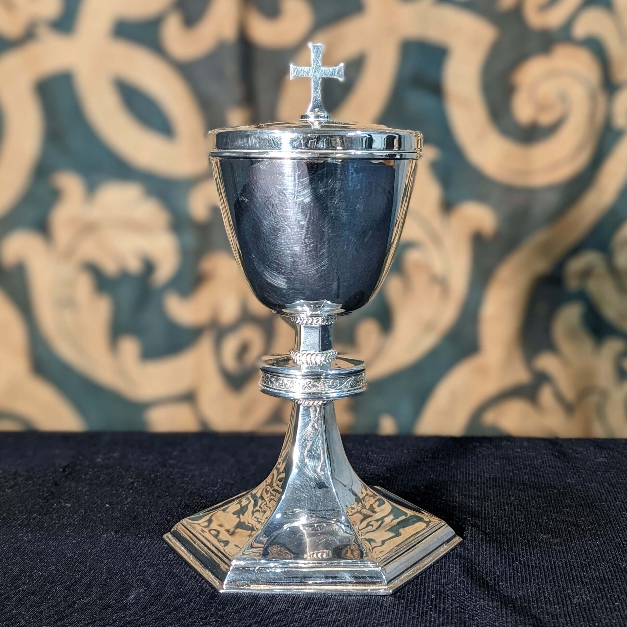 Our product shown on this page Victorian Style Hexagonal Base Silver Plate Ciborium with Scroll Band and Gilt Interior (SOLD) is currently available for hire.