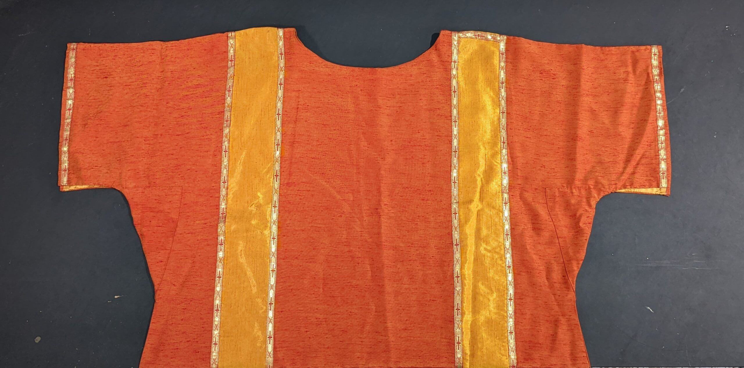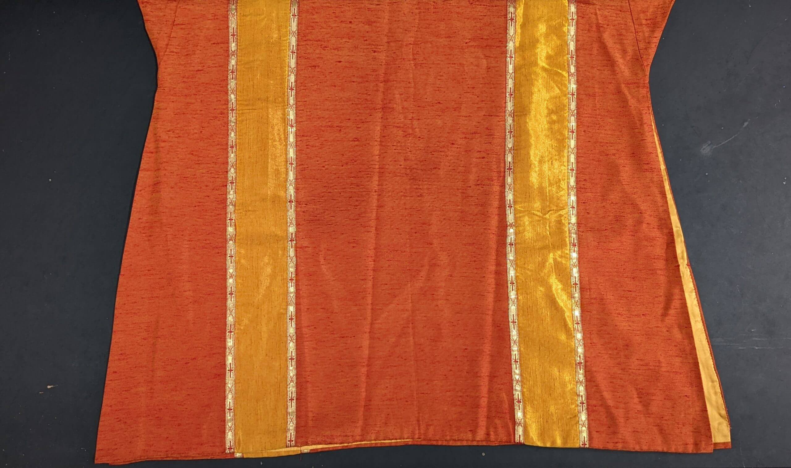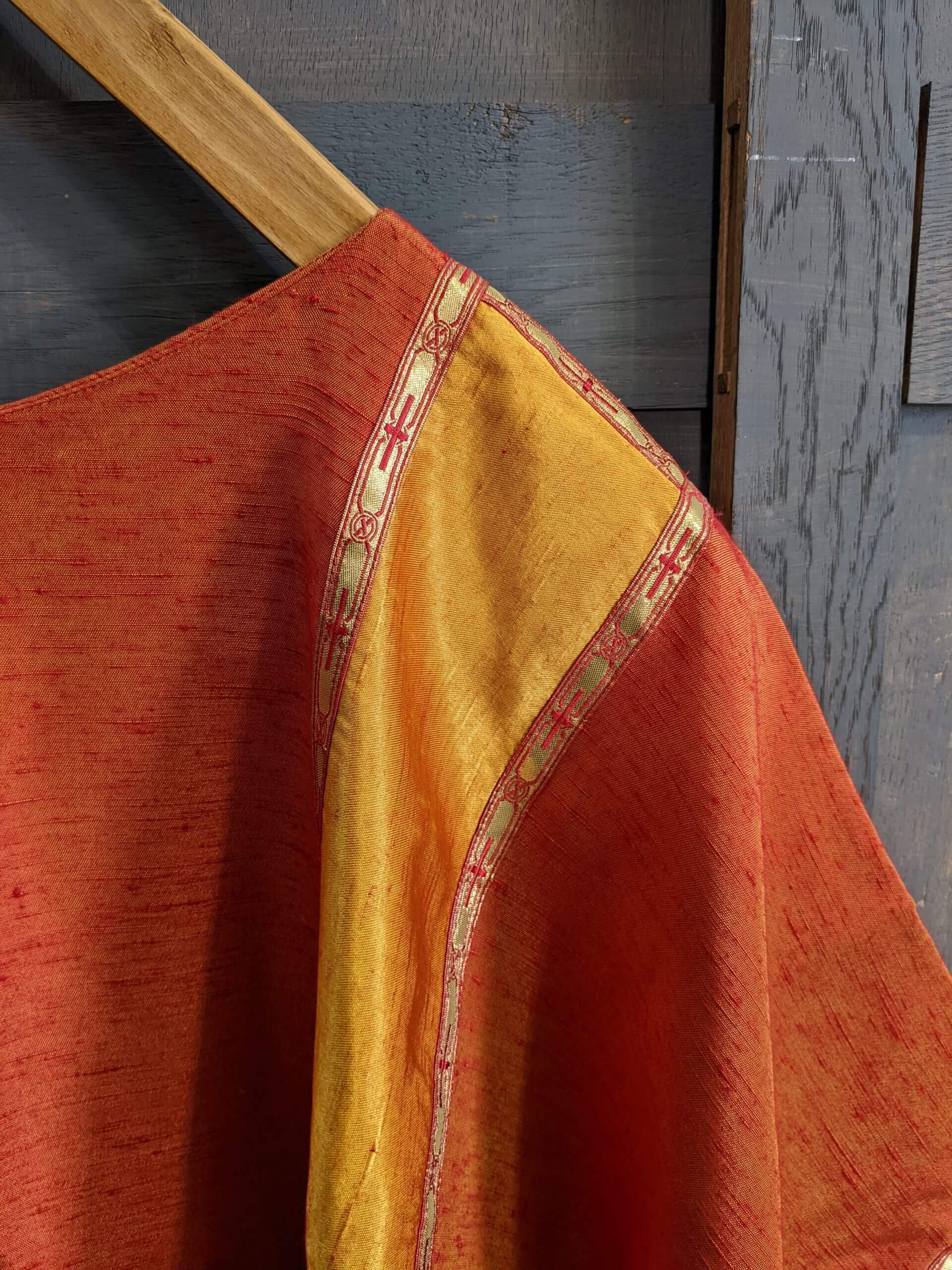Our product shown on this page Vintage 1970’s Orange & Yellow Shot Silk Dalmatic with Orphreys is currently available for hire.