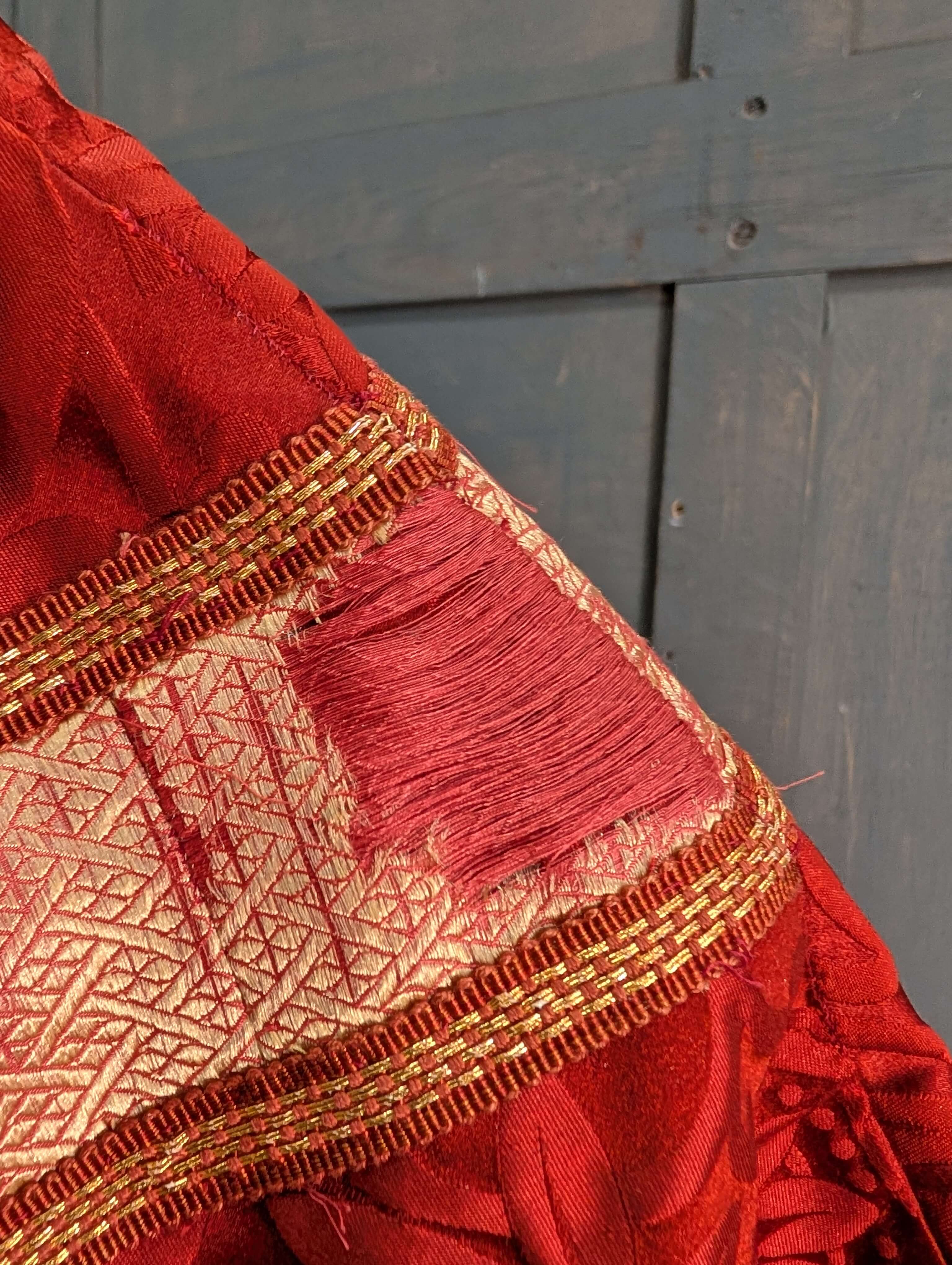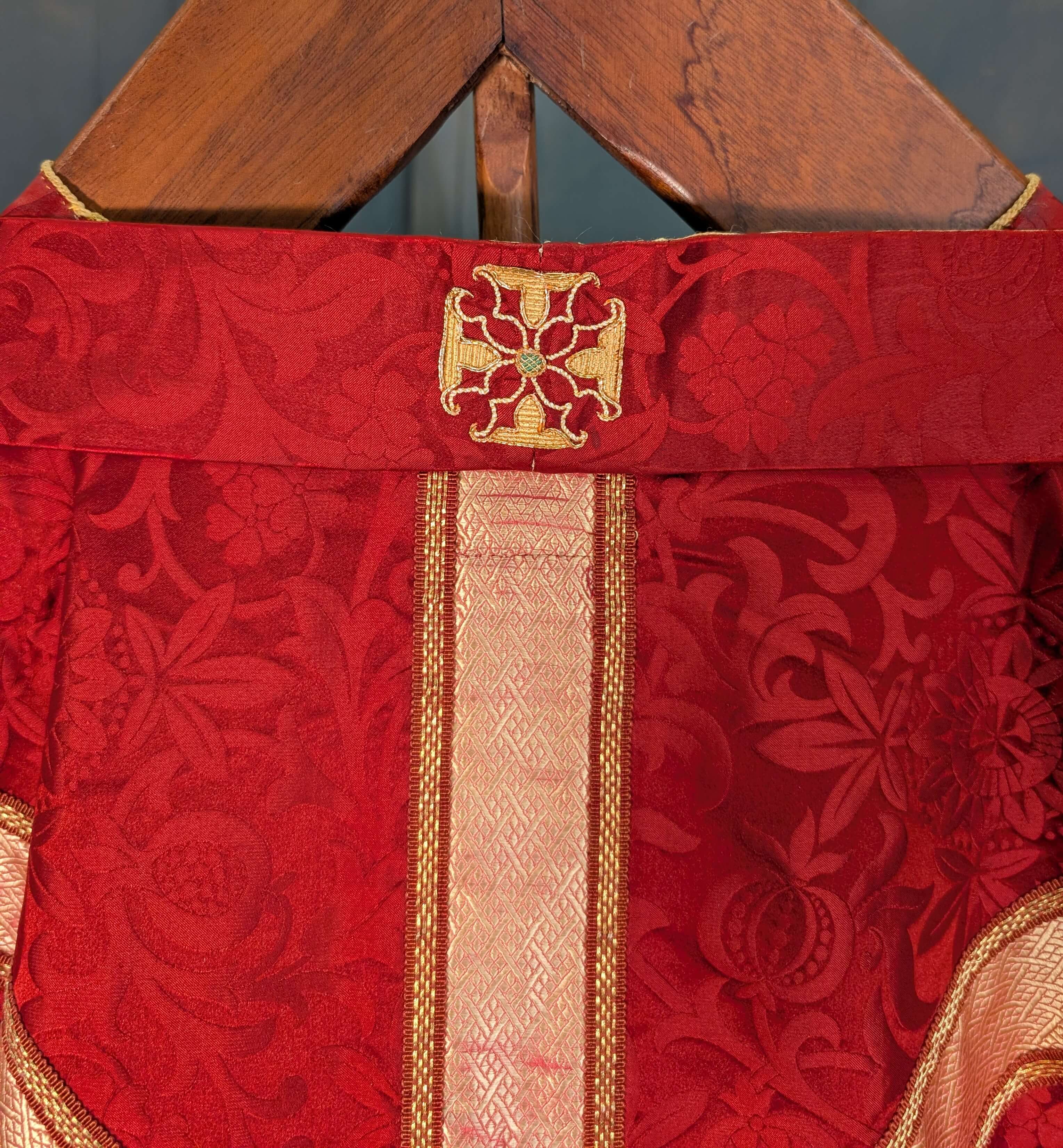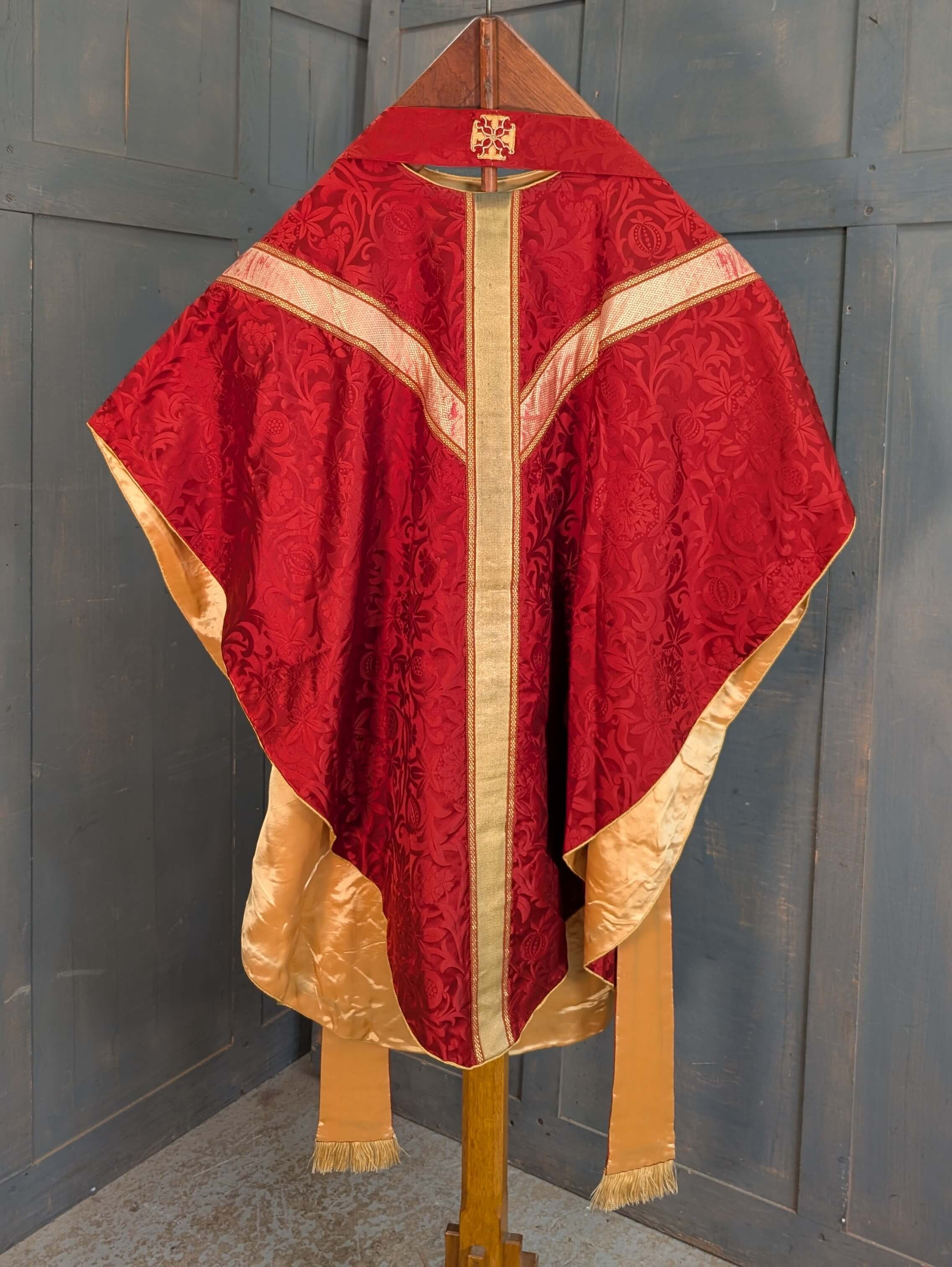 Our product shown on this page Vintage Carmine Damask Silk ‘Dove of Peace’ Chasuble with Stole – Project – is currently available for hire.