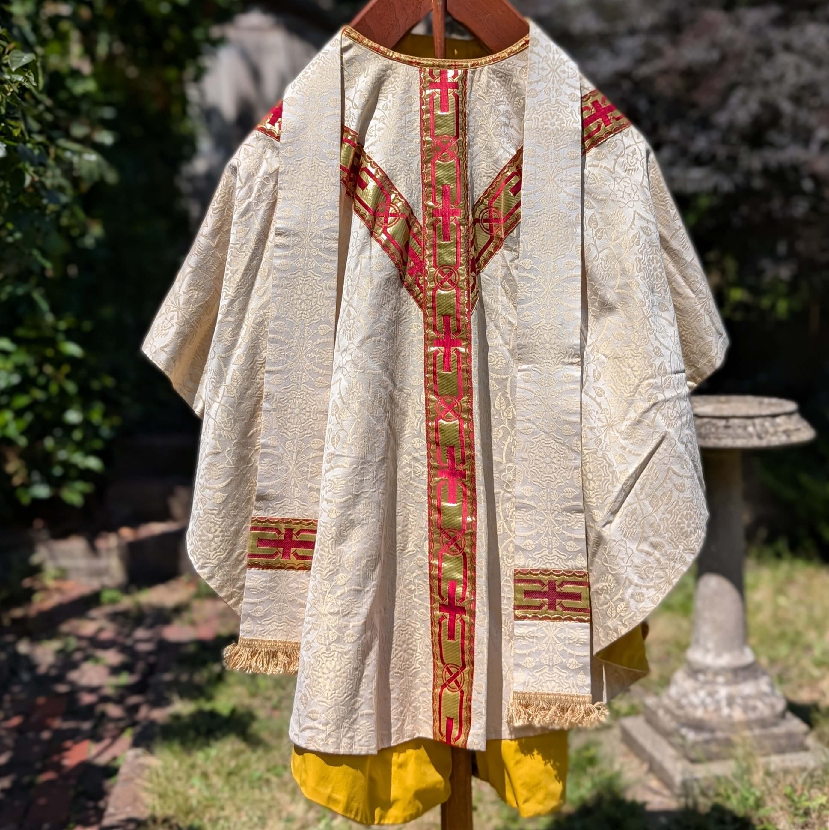 Our product shown on this page Vintage Cream Damask Silk Chasuble with Gold Red Orphreys & Stole (SOLD) is currently available for hire.