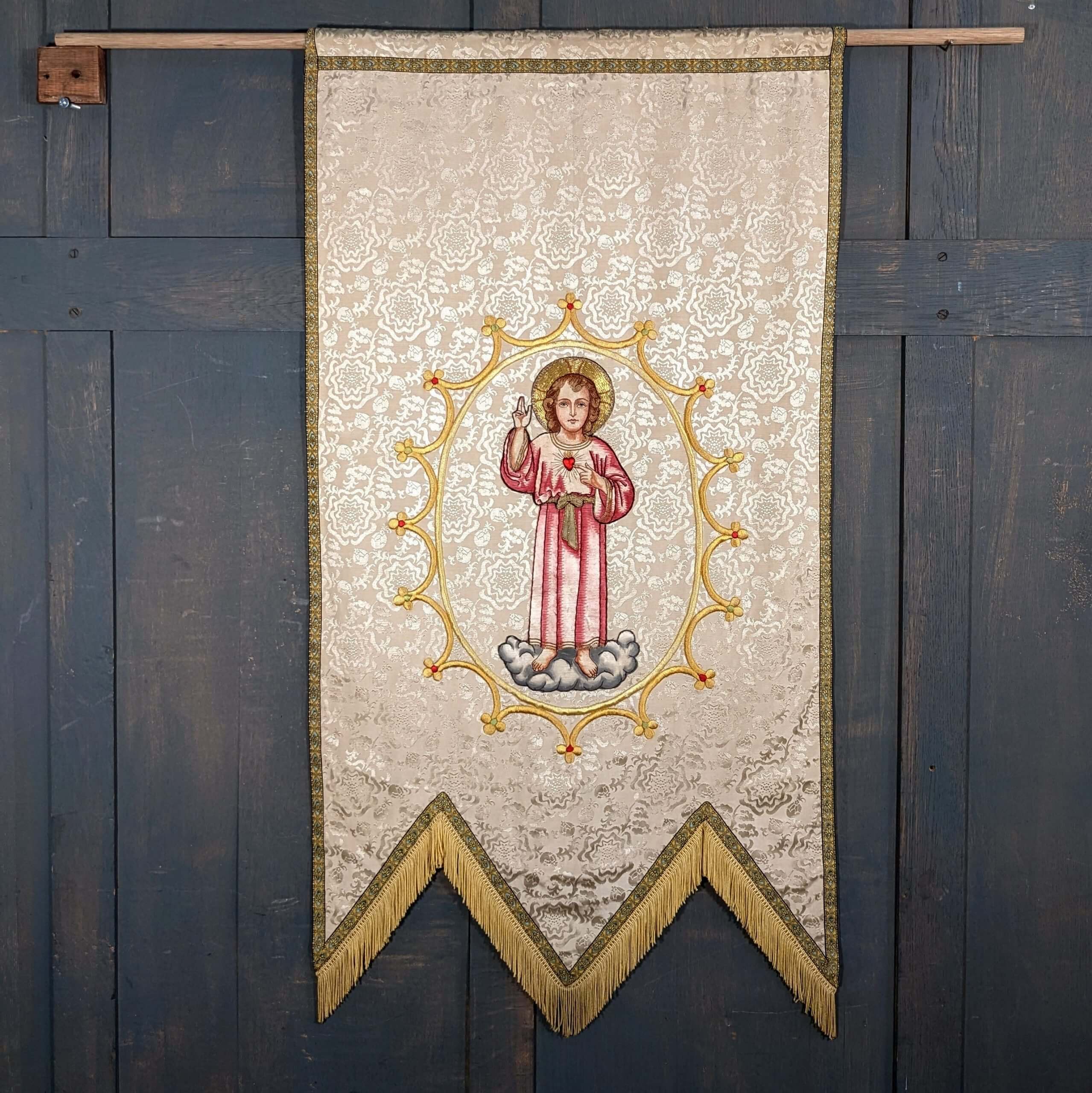 Our product shown on this page Vintage Embroidered Christ Child Silk & Bullion Applique Cream Damask Hanging Banner (SOLD) is currently available for hire.