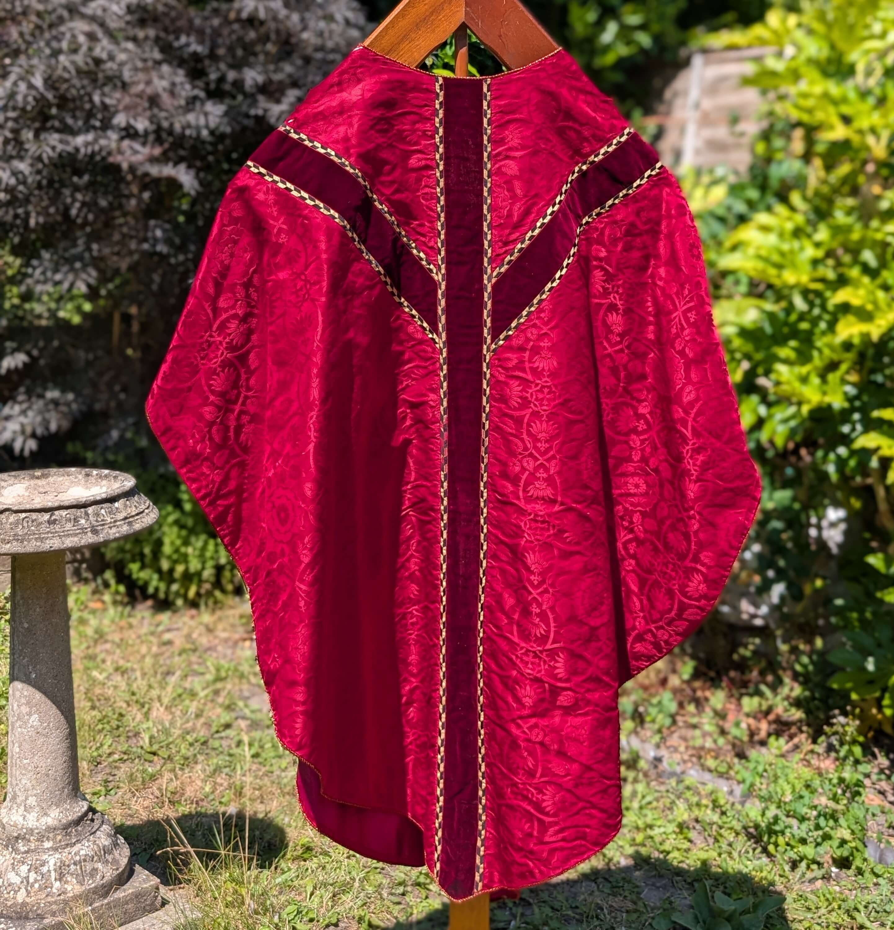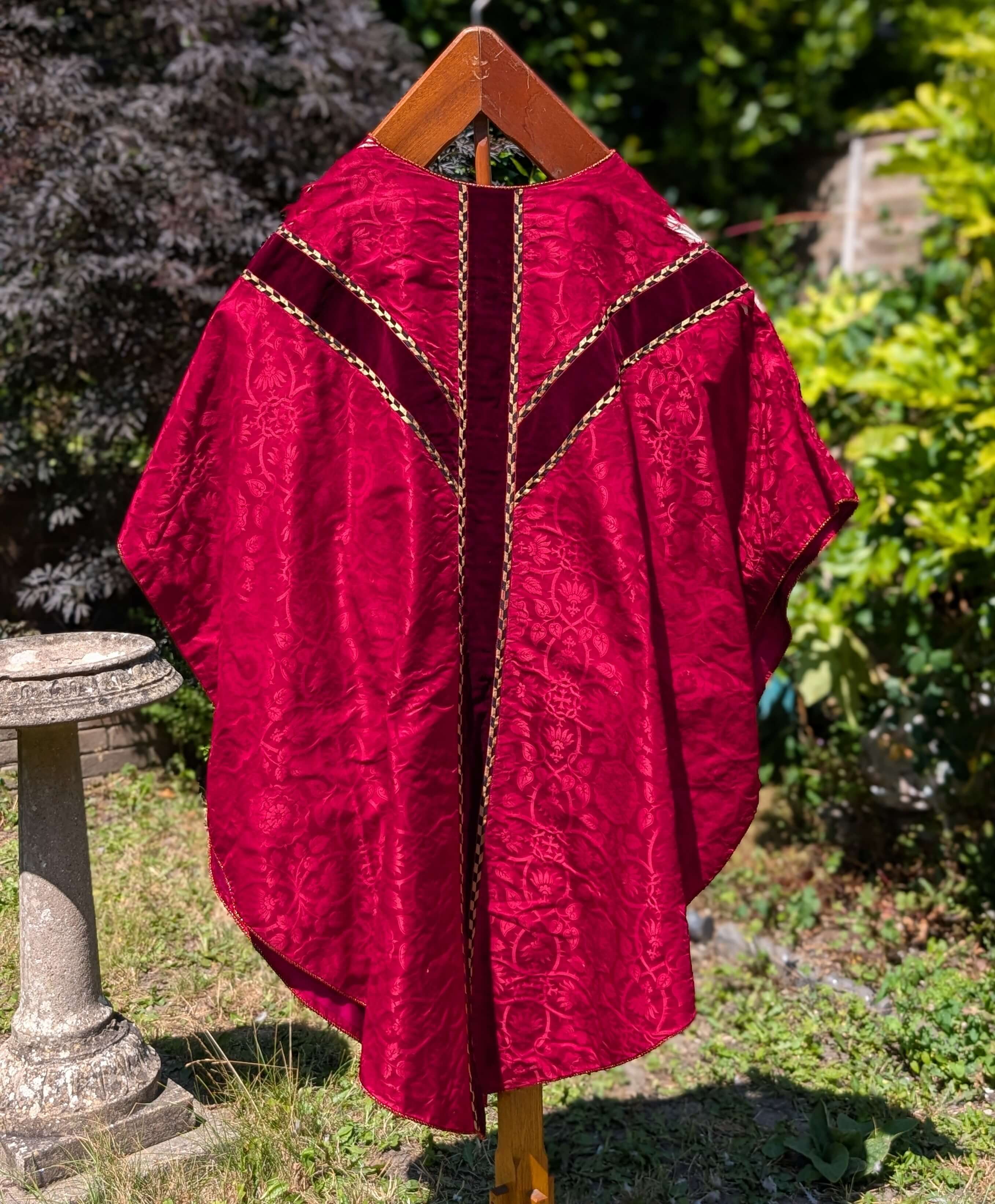 Our product shown on this page Vintage Red Damask Silk Chasuble with Velvet Orphreys PROJECT is currently available for hire.