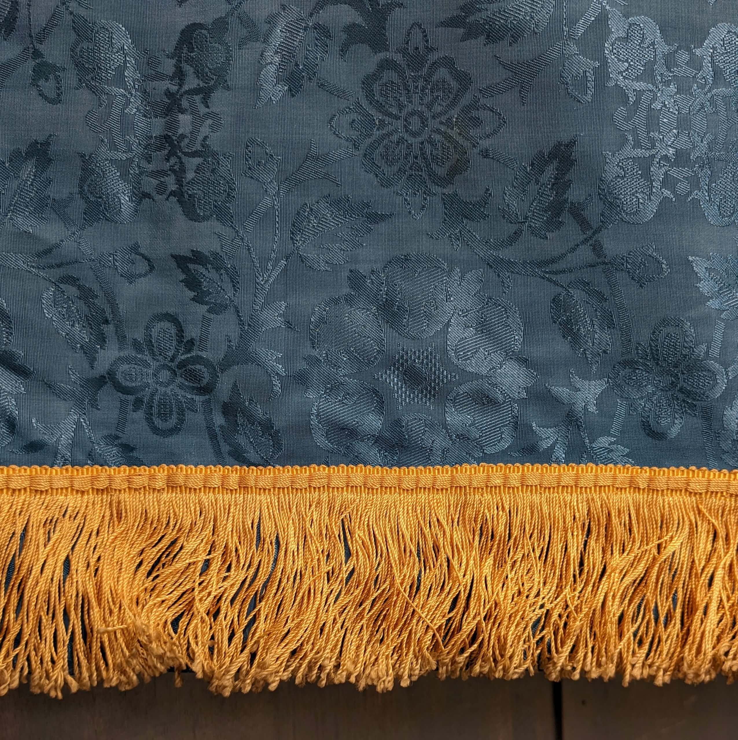 Our product shown on this page Vintage Sky Blue Foliate Cross Design Damask Altar Frontal with Gold Fringing (SOLD) is currently available for hire.