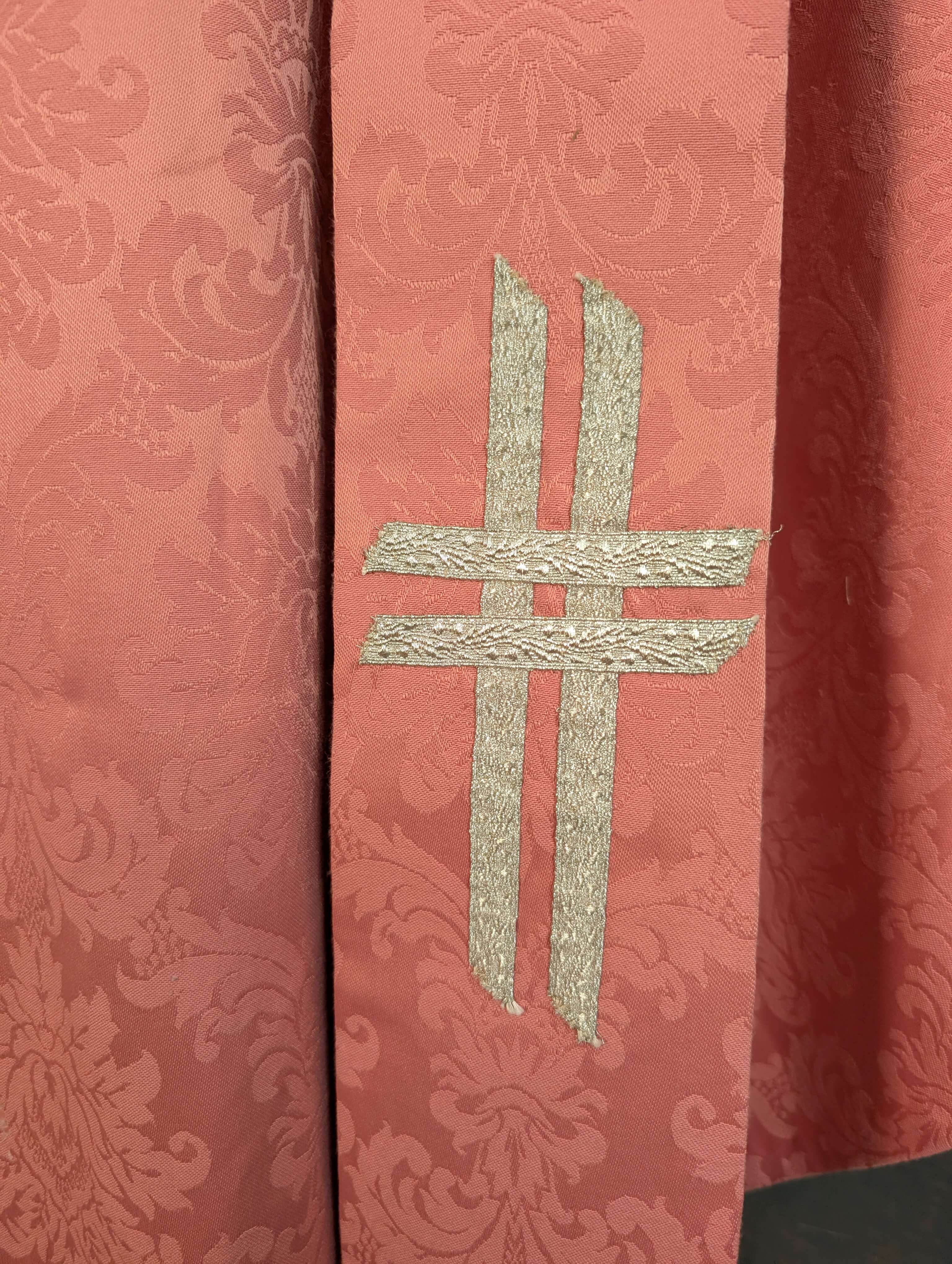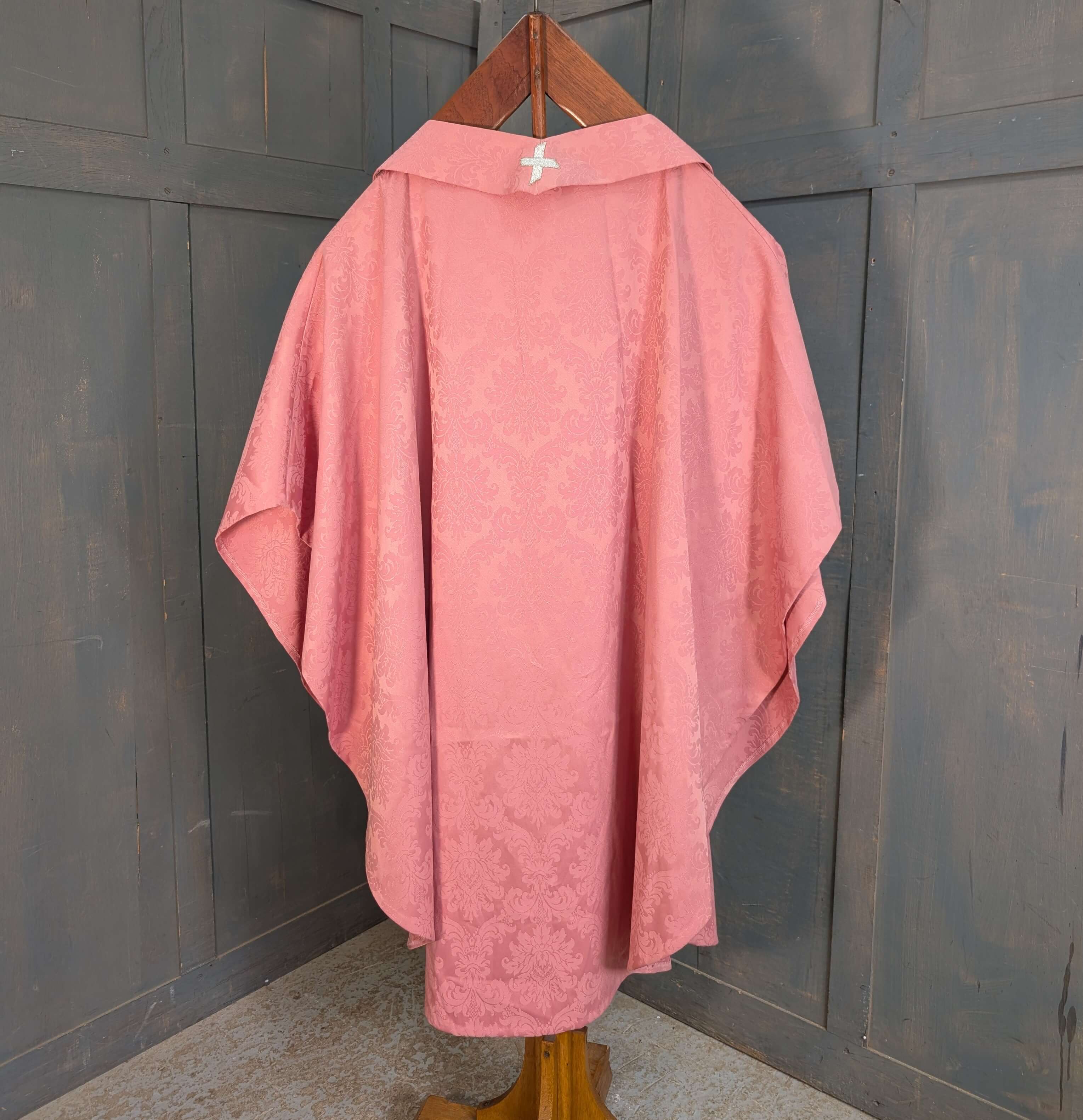 Our product shown on this page Vintage Unlined Striking Salmon Damask Chasuble with Stole (SOLD) is currently available for hire.