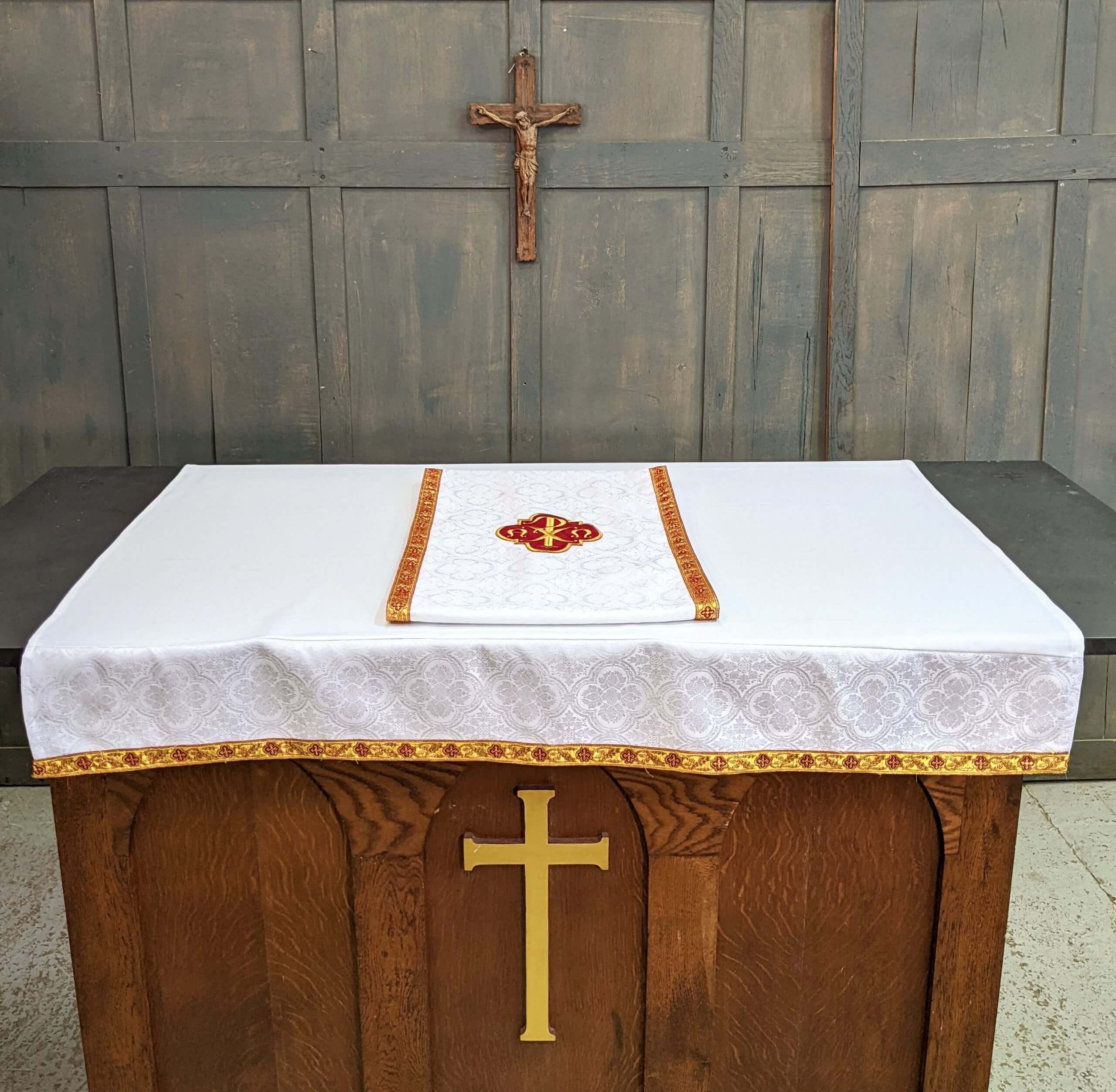 Our product shown on this page White Brocade Altar Cloth Frontal with Embroidered Chi Rho Alpha Omega Applique (SOLD) is currently available for hire.