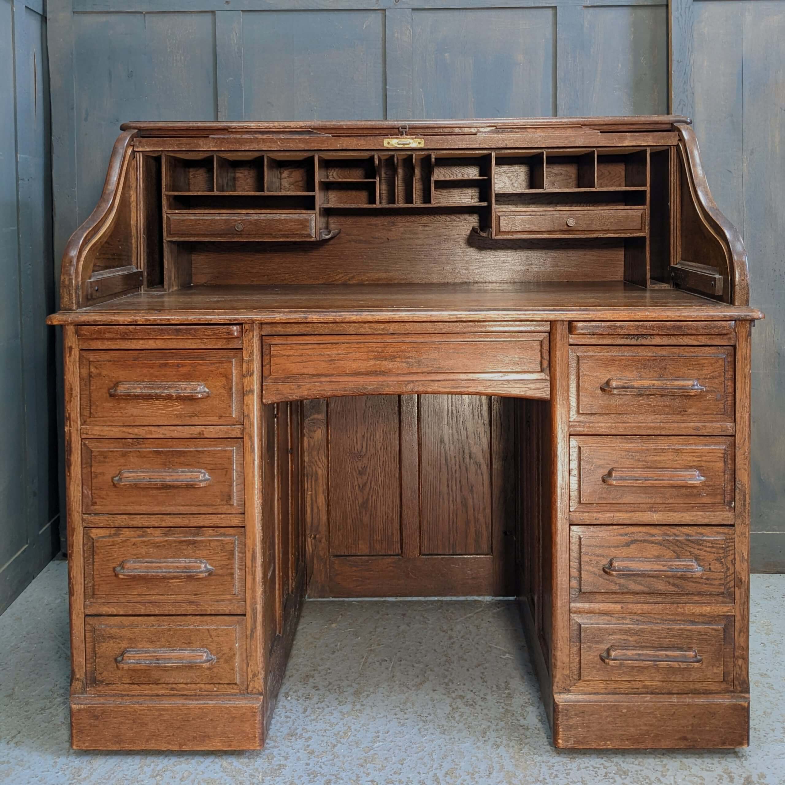 Our product shown on this page William Angus Antique 1910 Oak Large Roll Top Desk with Field Panels (SOLD) is currently available for hire.