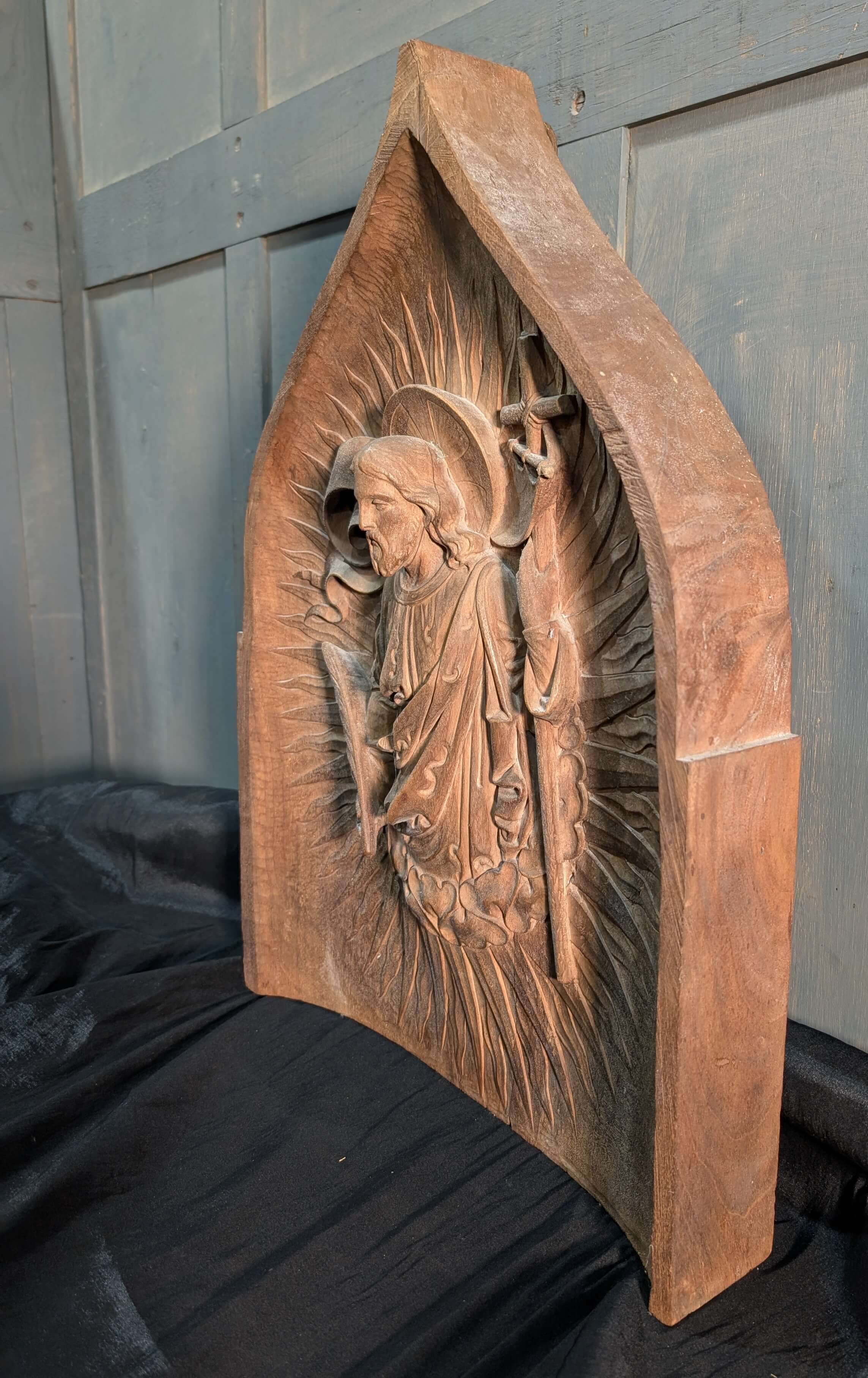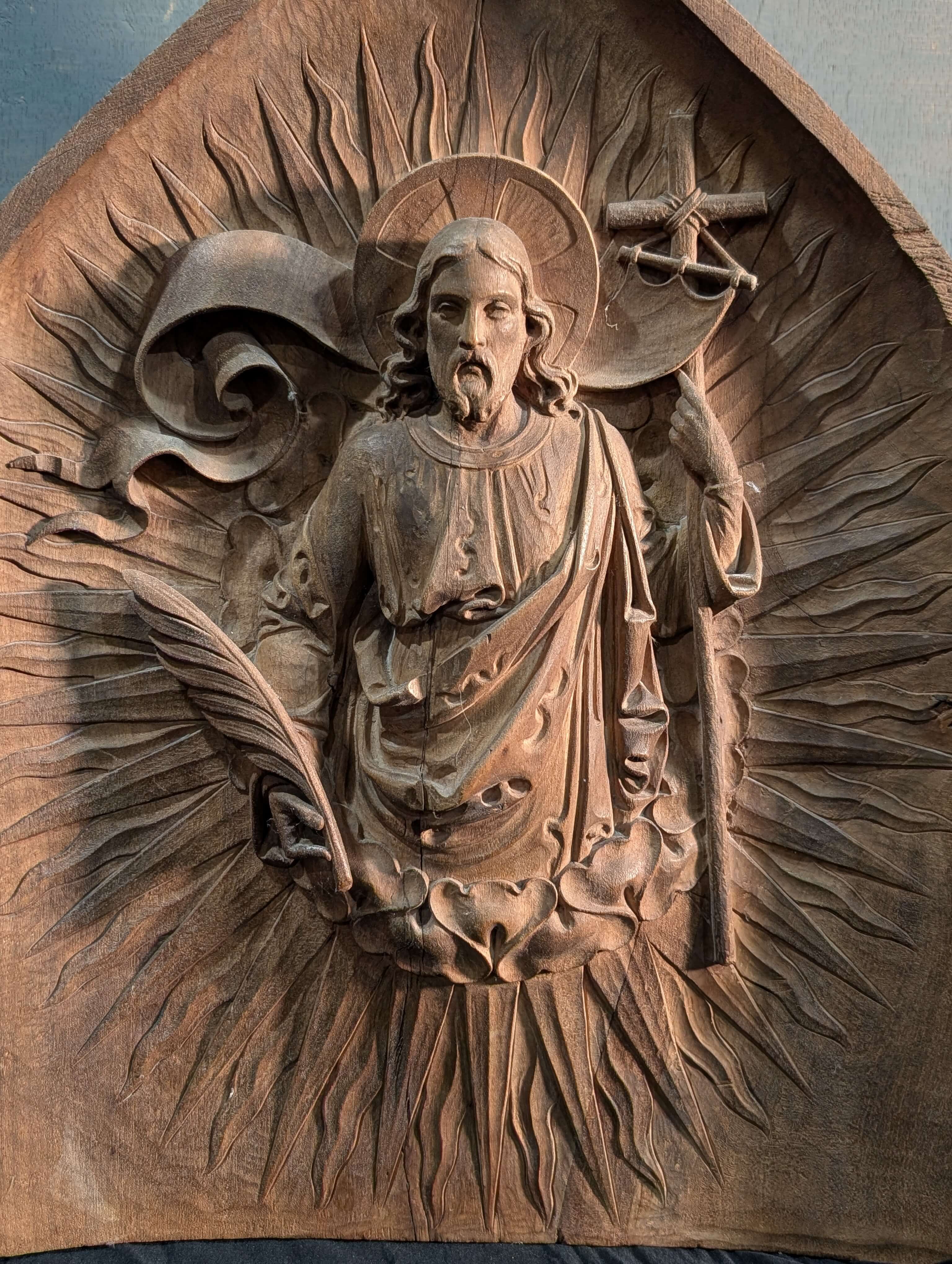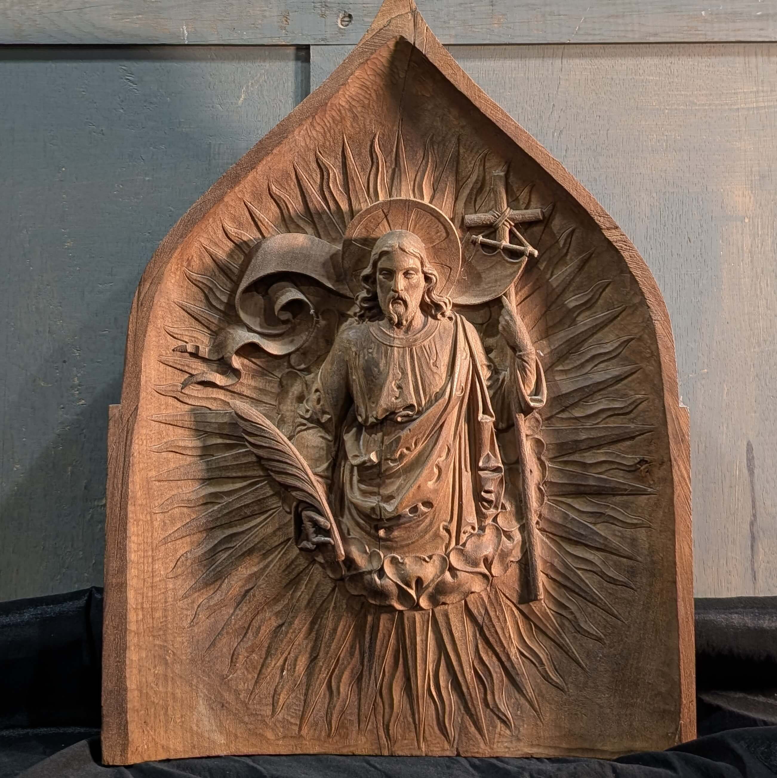 Our product shown on this page Wonderful Antique Carved Elm Plaque Shield of Christ with Quill & Banner is currently available for hire.